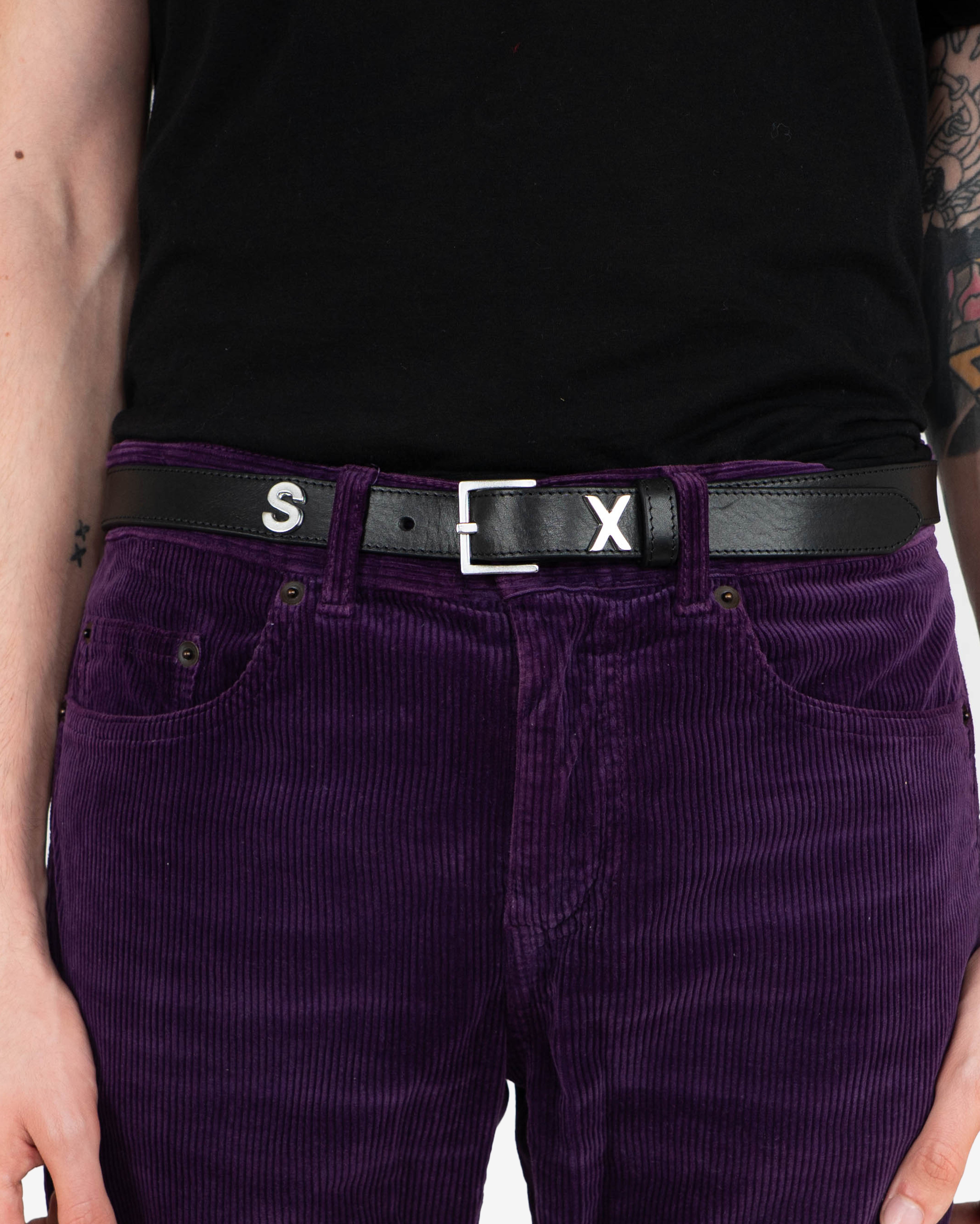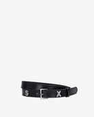 Crafted from supple calf leather, this eye-catching belt has a structured design with polished finish, featuring silver lettering hardware and silver adjustable pin-buckle closure.