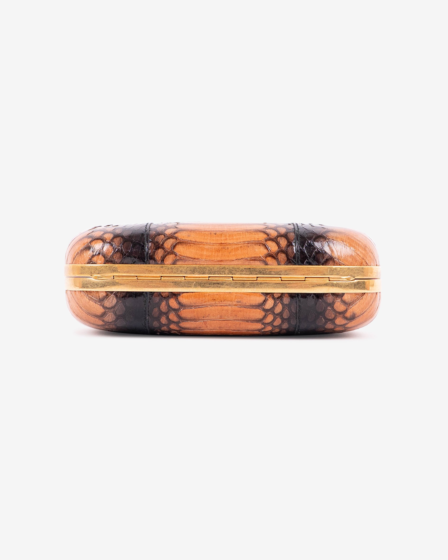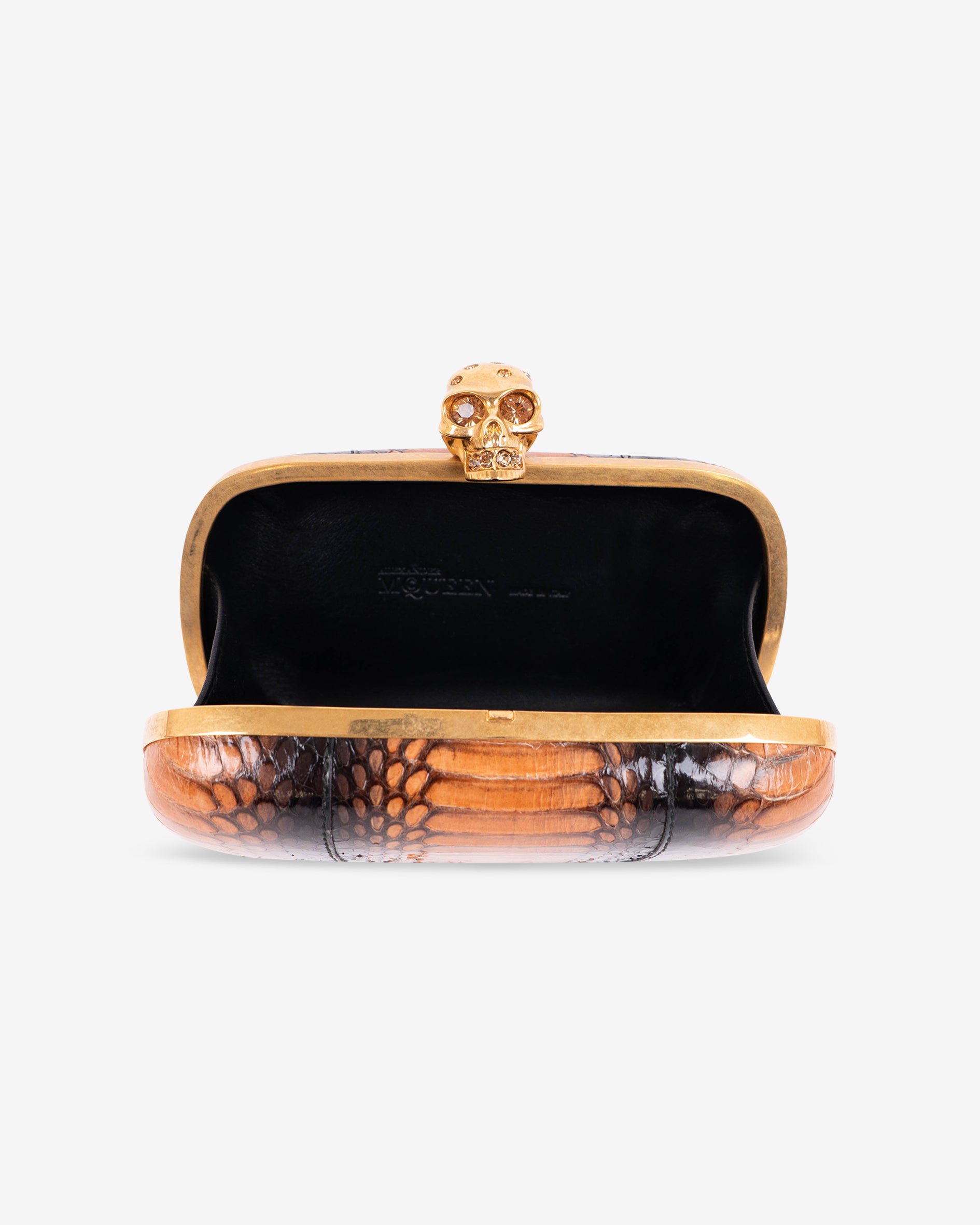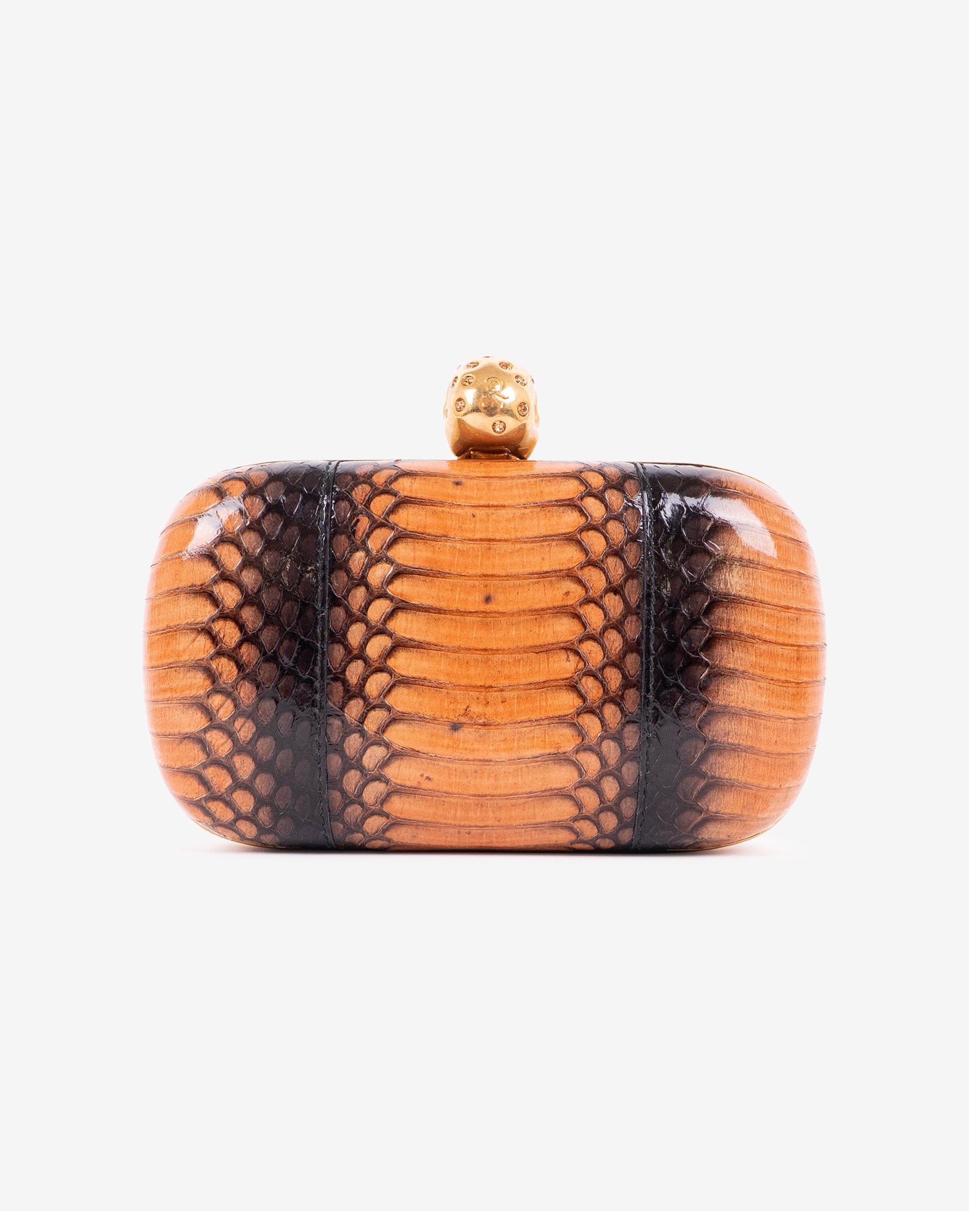 First introduced in 2007, the Skull Box Clutch quickly gained iconic status, appearing everywhere from the runway to the red carpet. It features a textured python leather exterior, gold tone metal skull clasp closure, and compact interior designed for evening essentials.