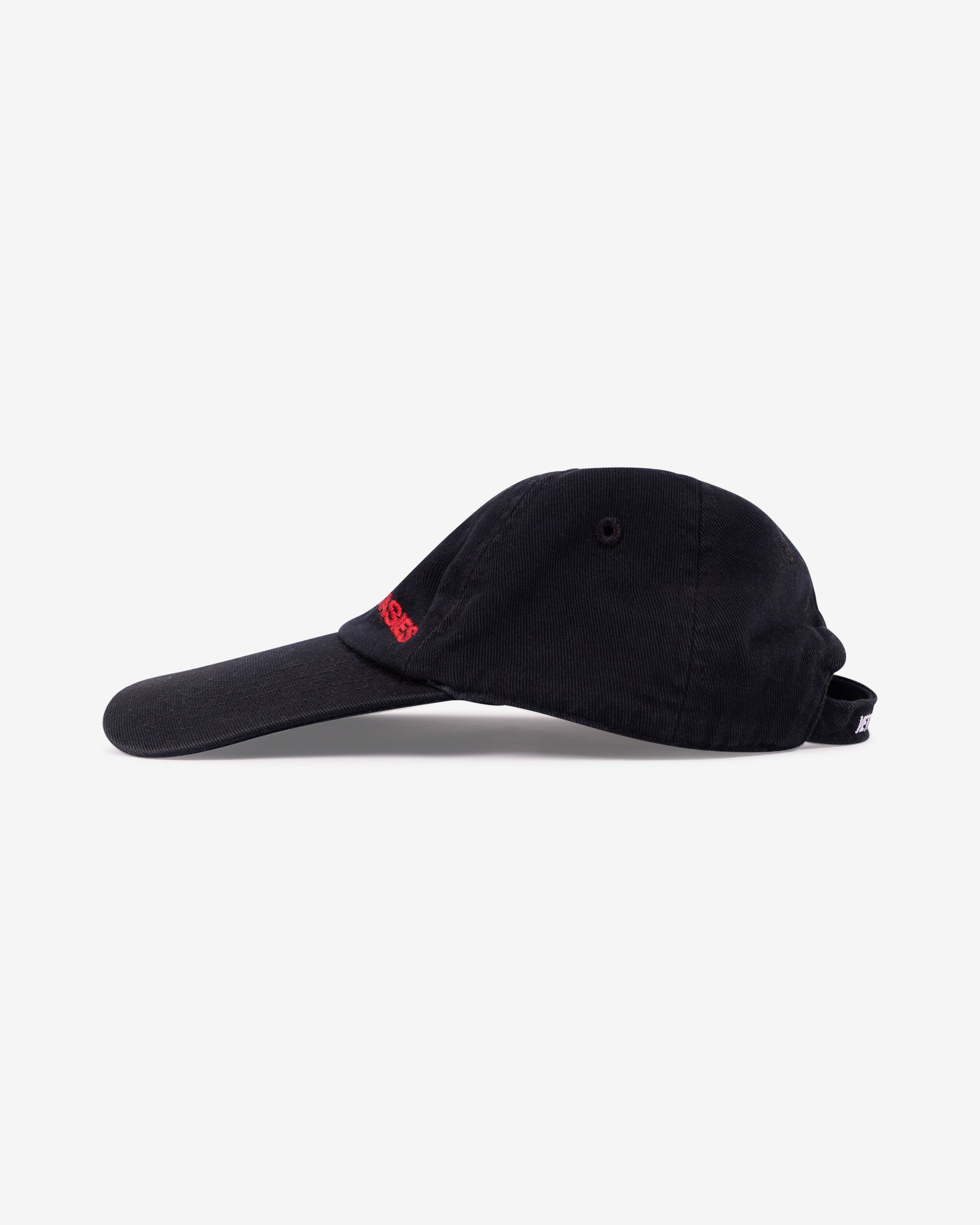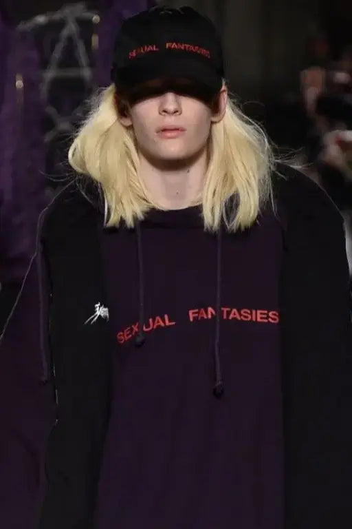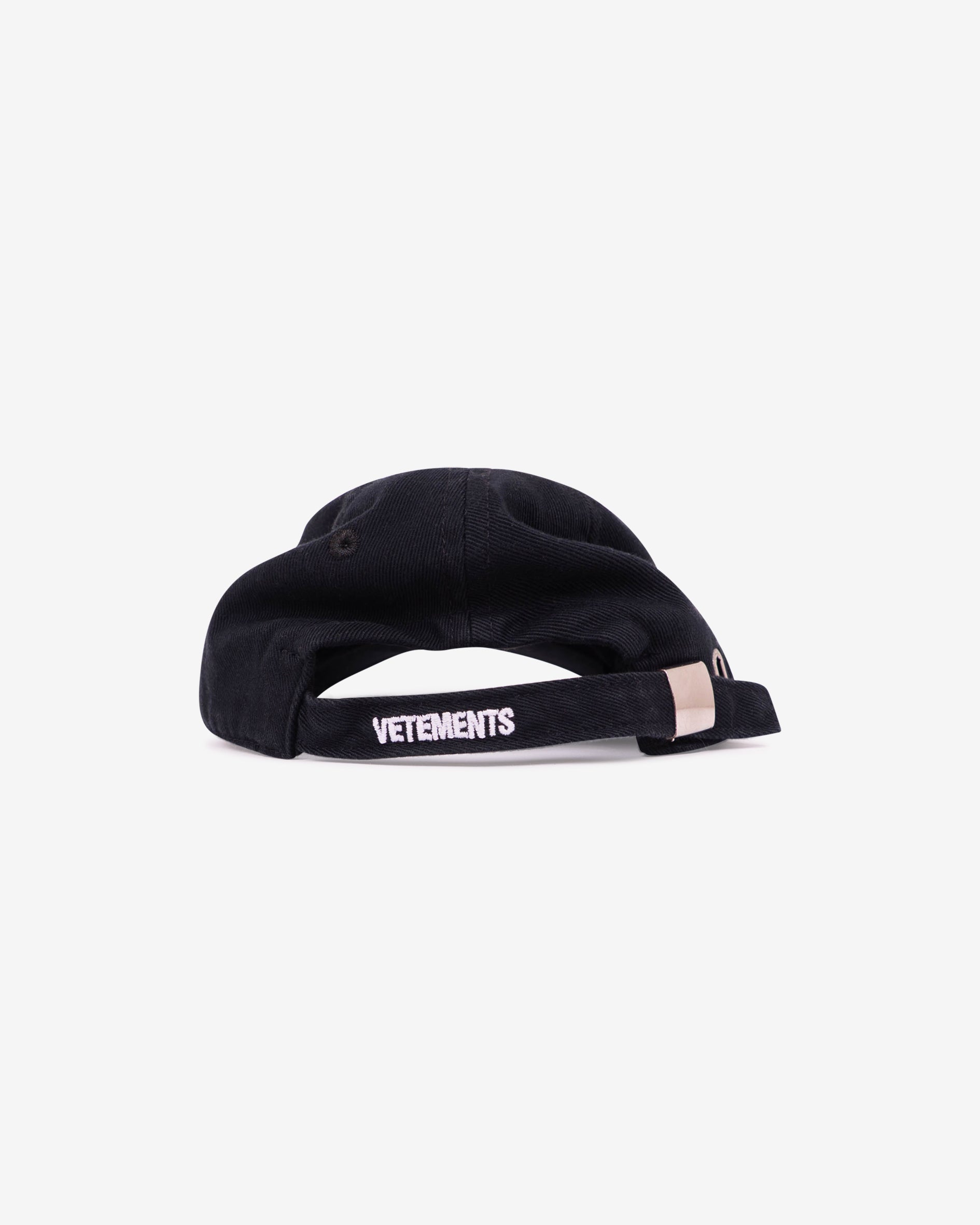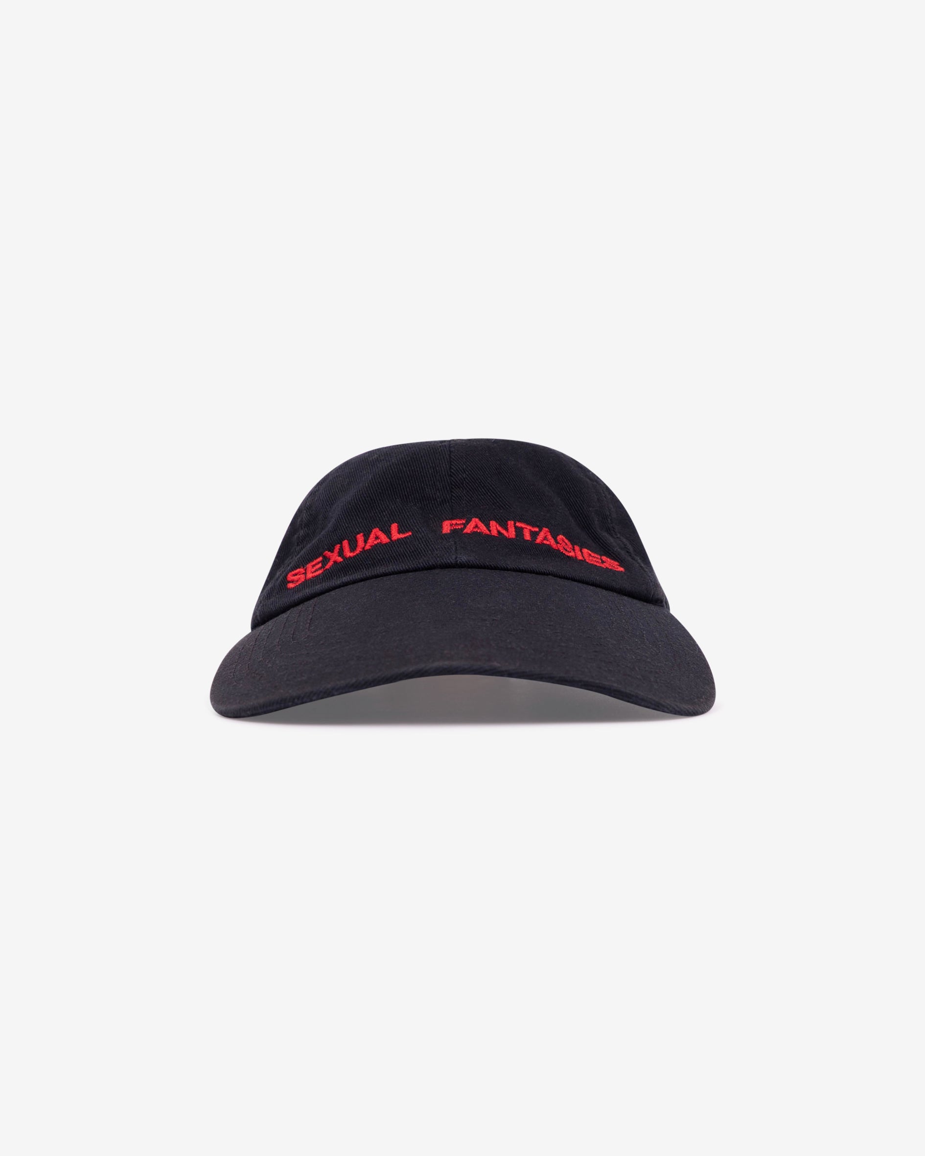 this iconic hat features the legendary Sexual Fantasies lettering across the front panel in addition to an elongated brim. It is completed with a metallic clamp on the underside and the Vetements logo embroidery on the strap back closure.