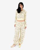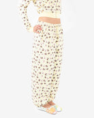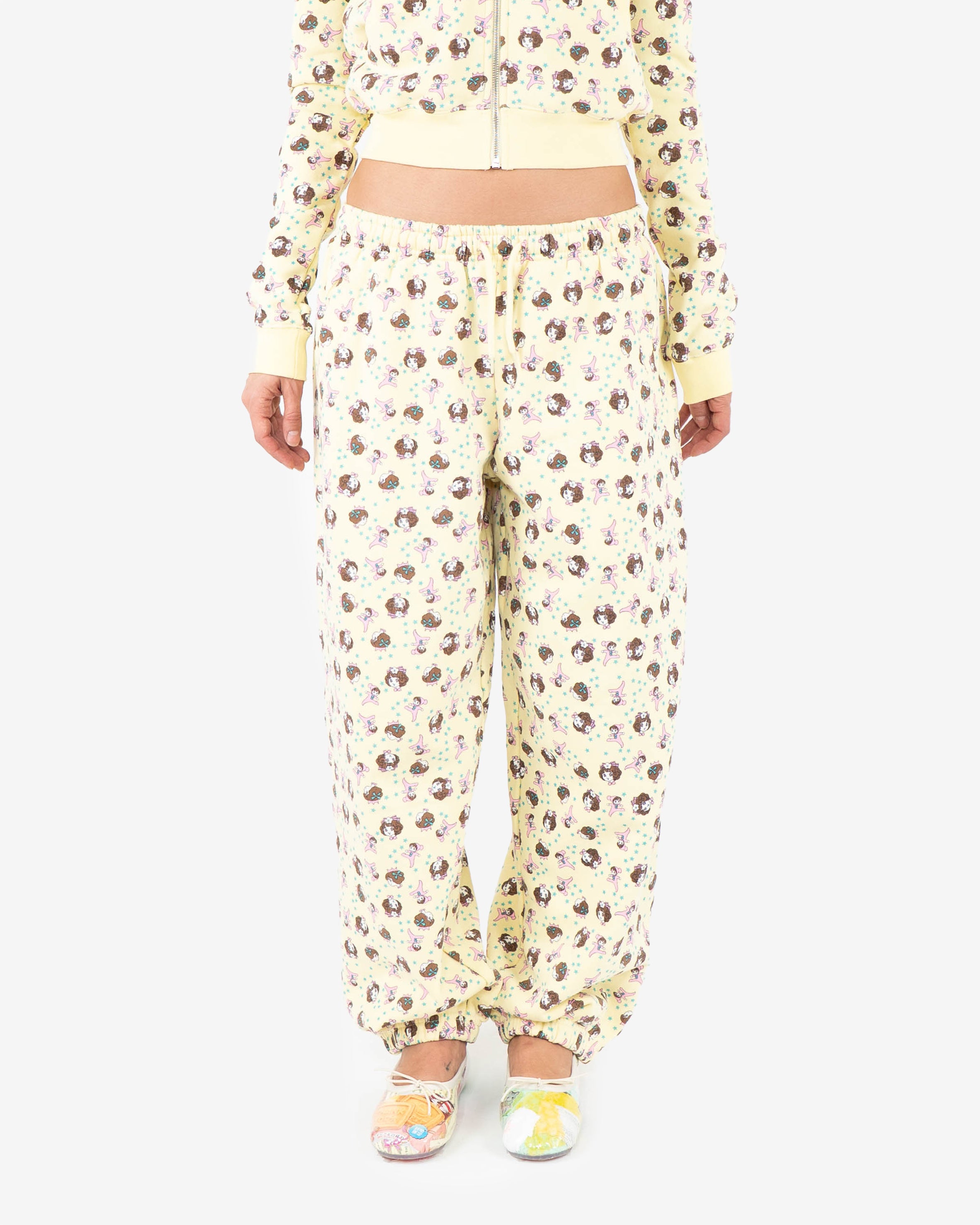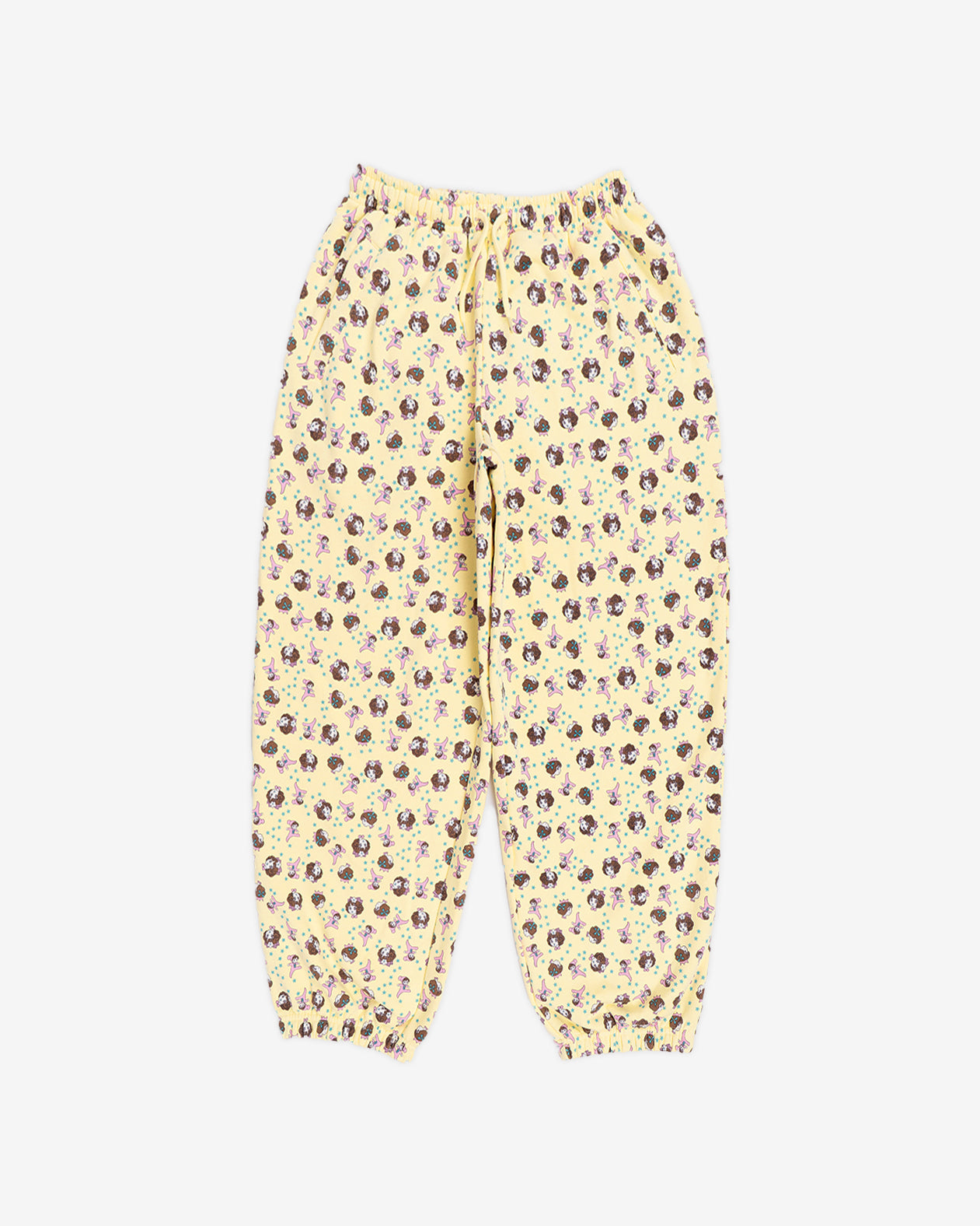 Oversize style jogger with elasticated cuffed bottoms, elasticated waist and tie front elasticated waist and tie front featuring eclectic "Girl Baby" cartoon print.
