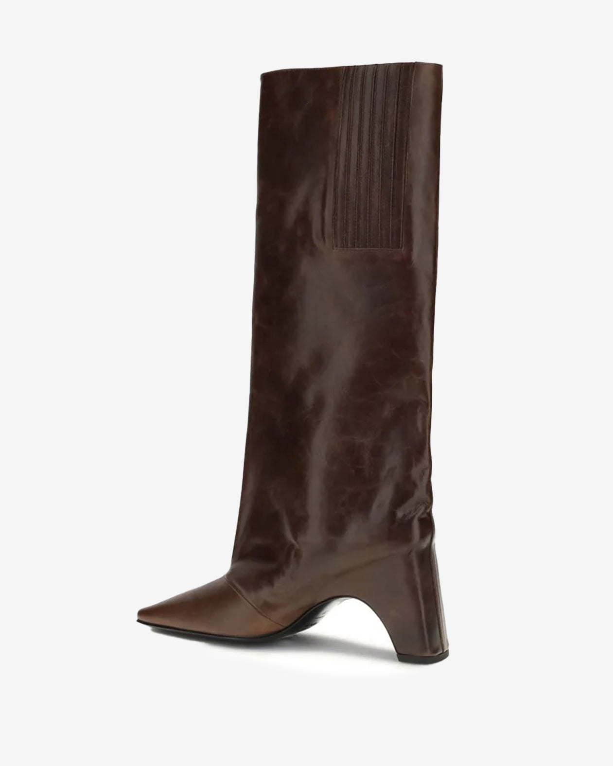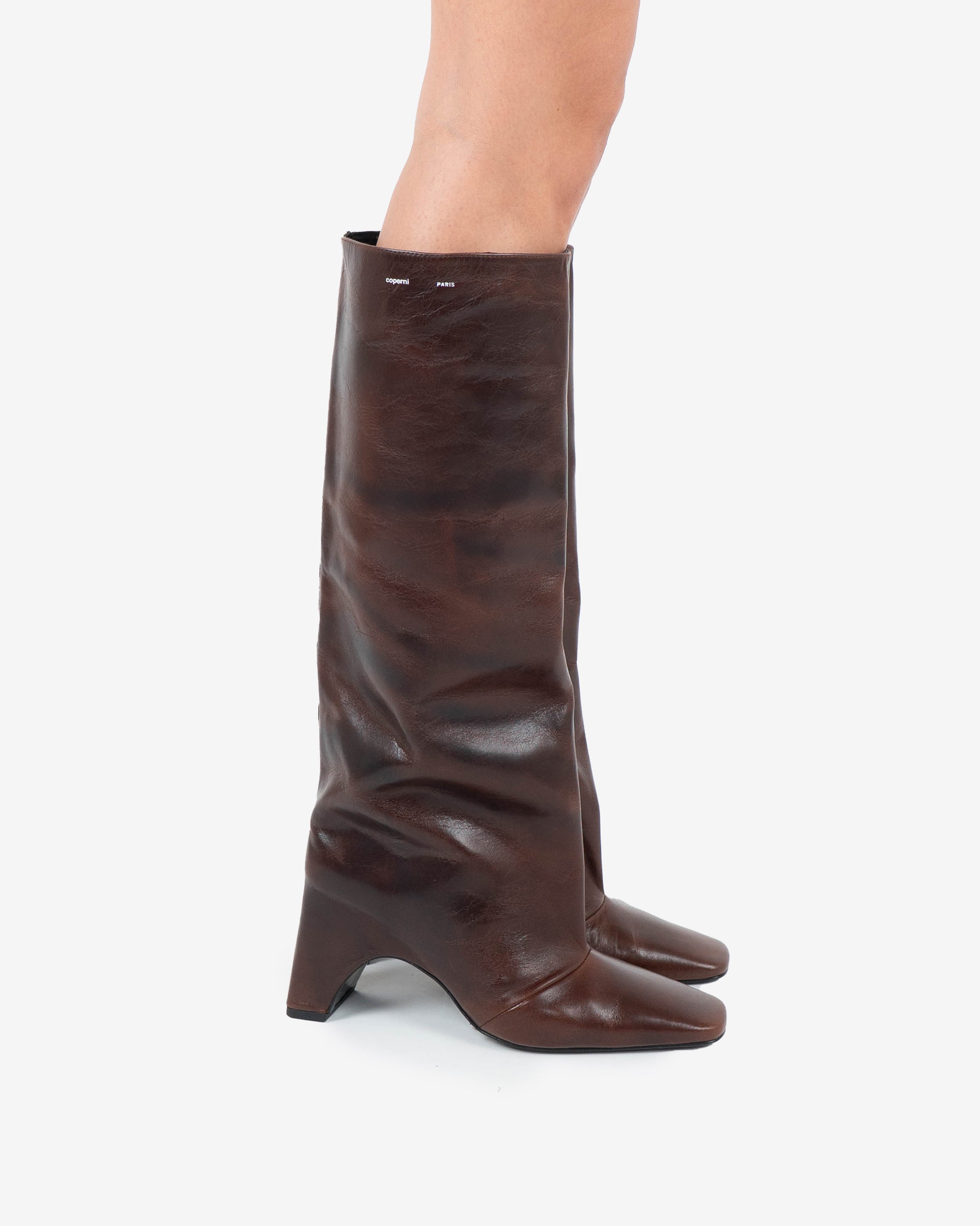 Elegant minimal boot with square toe and wide riding style shaft. "Bridge" name is derived from the shoe's signature eye-catching arched sole.