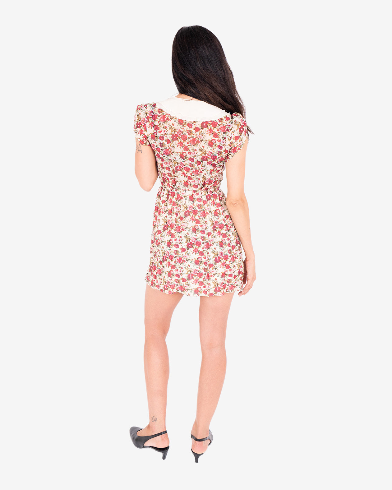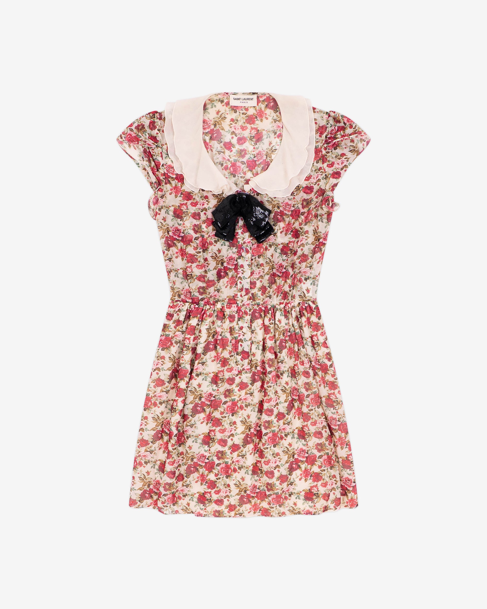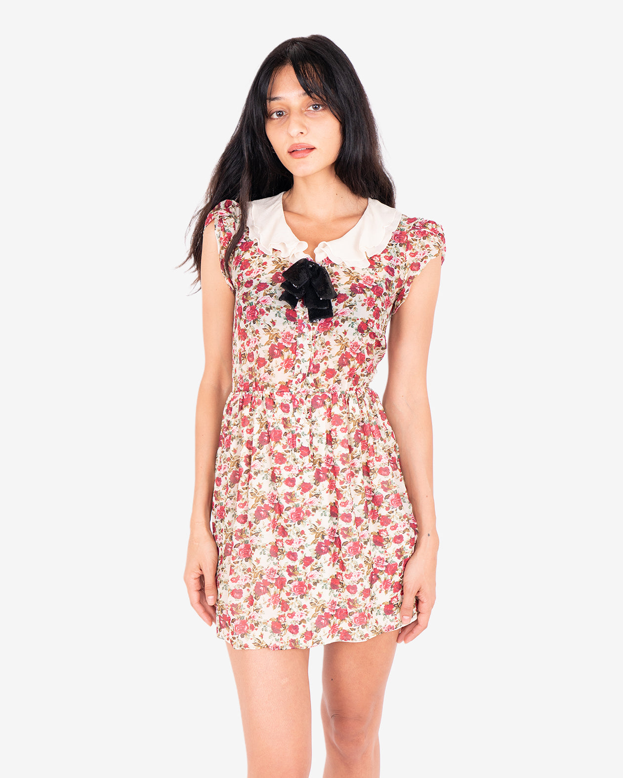 Adorable floral print babydoll style mini dress featuring elasticated waist, unique cap-sleeves, white contrast collar and black sequin bowtie.