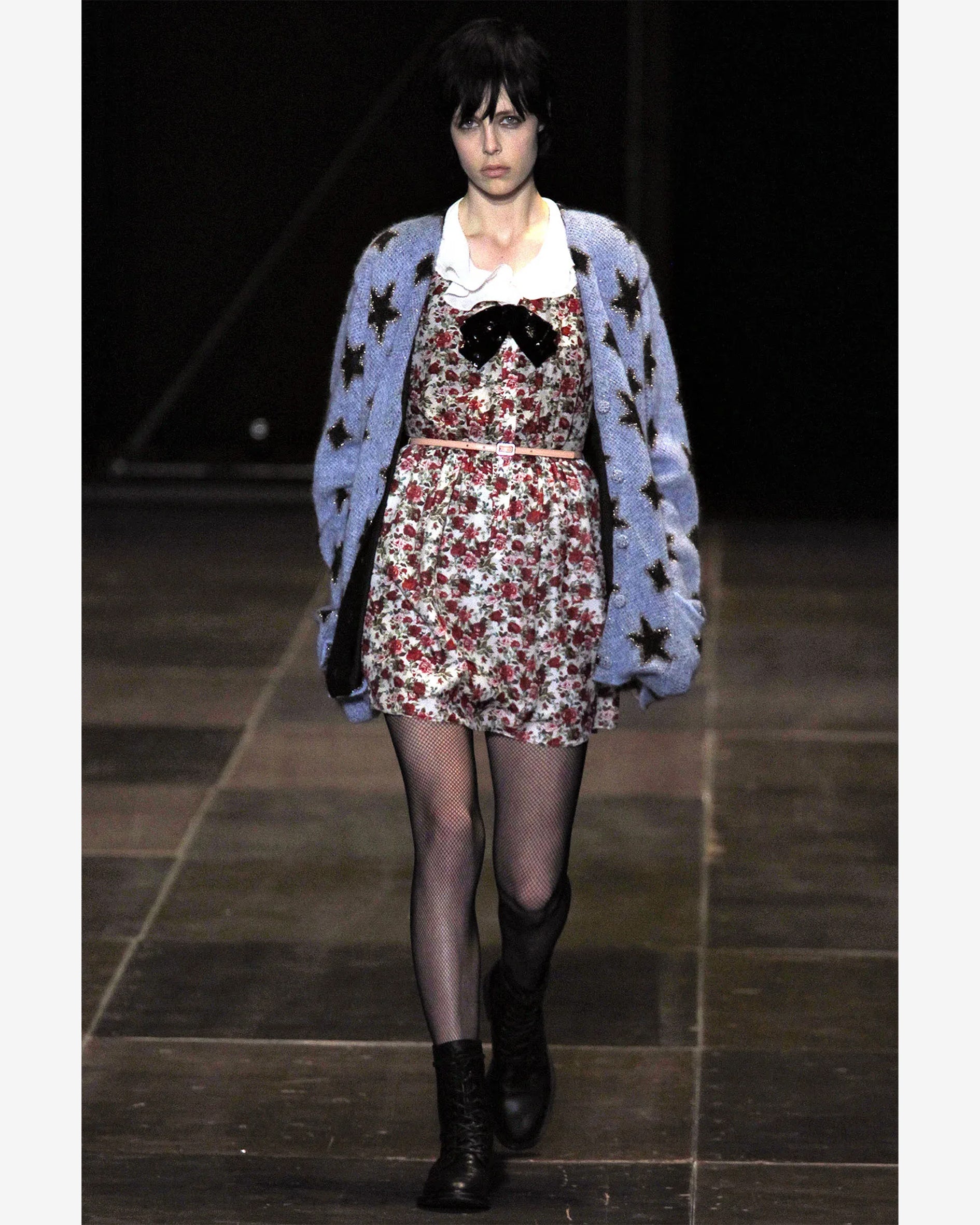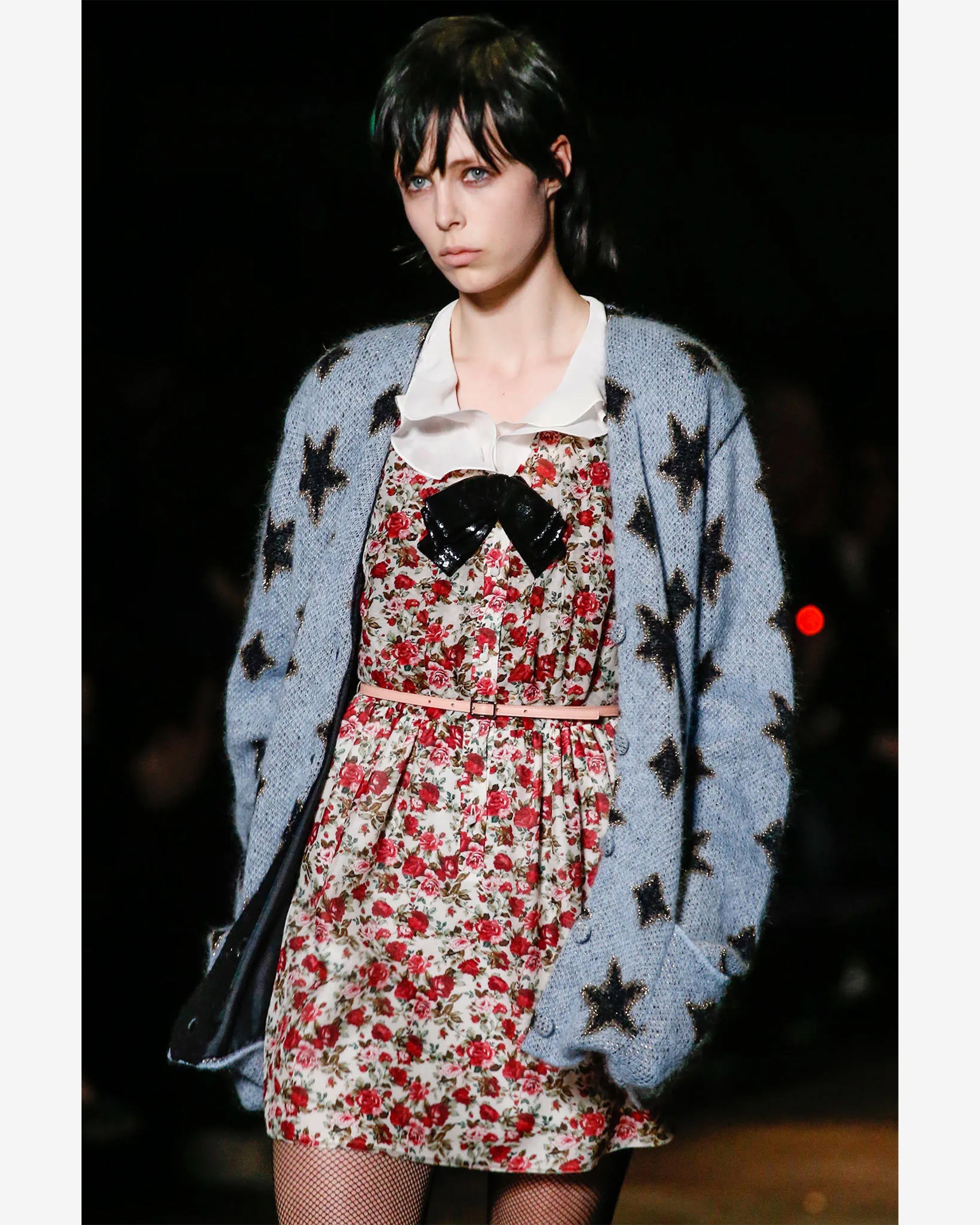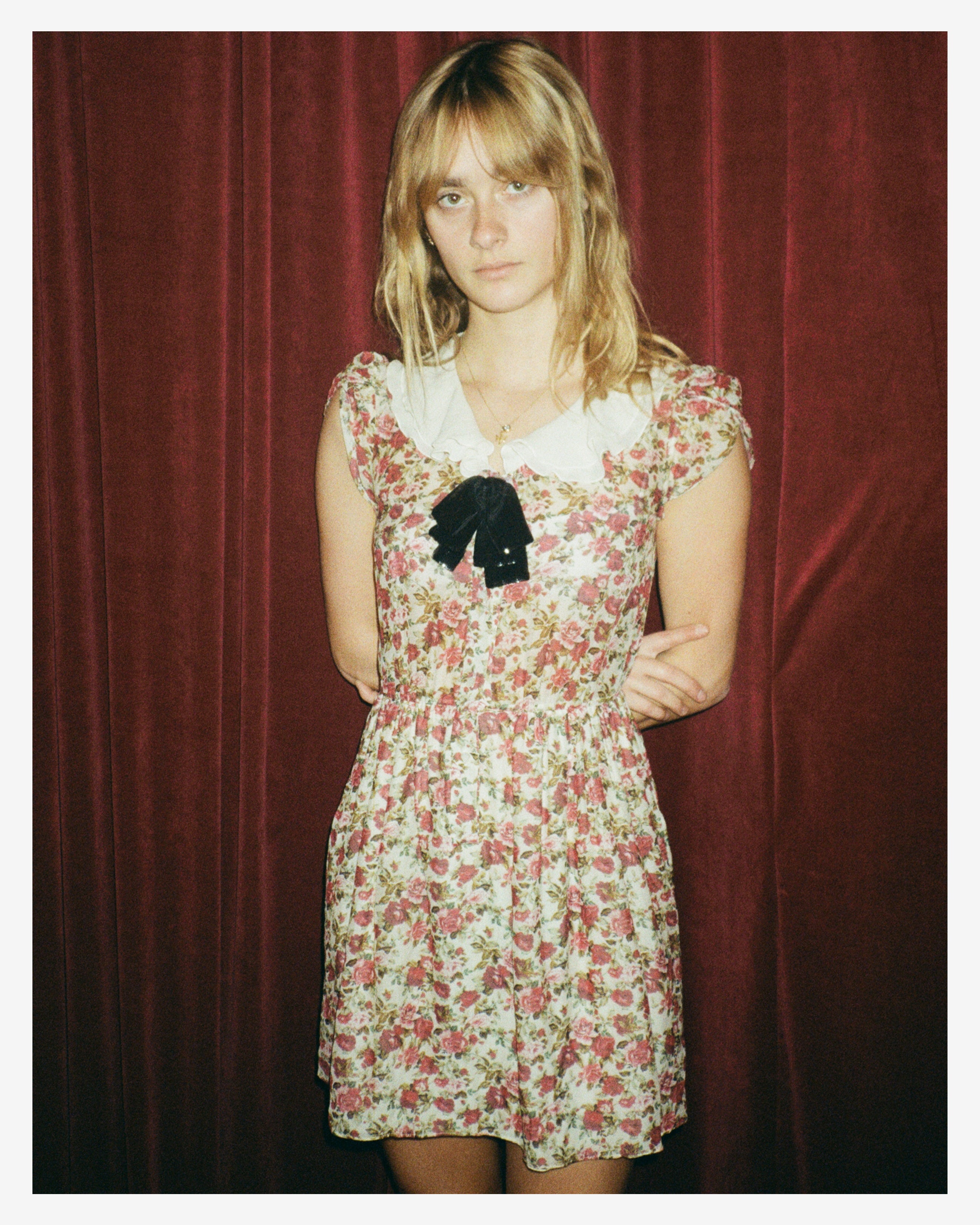 Adorable floral print babydoll style mini dress featuring elasticated waist, unique cap-sleeves, white contrast collar and black sequin bowtie.