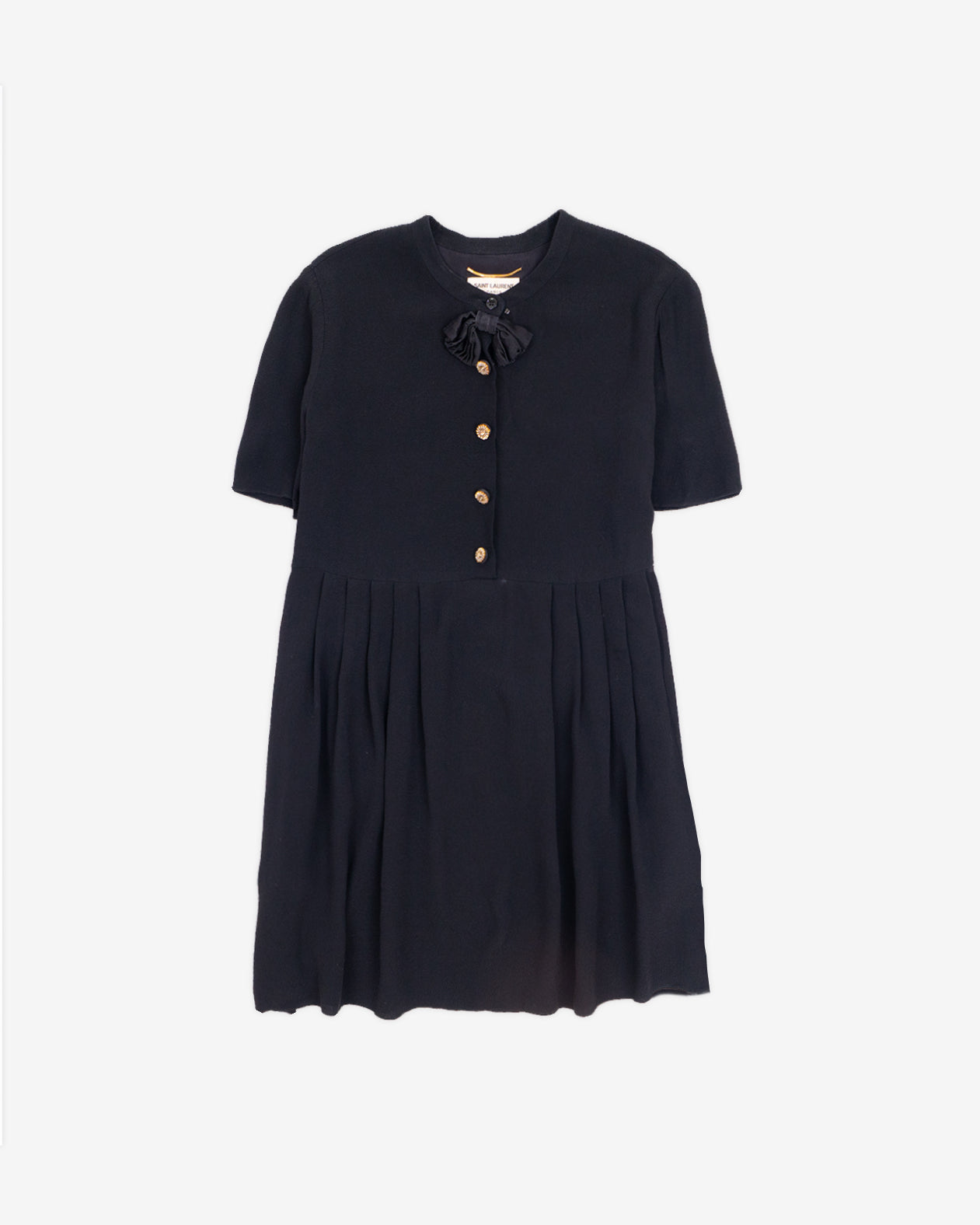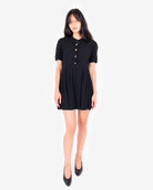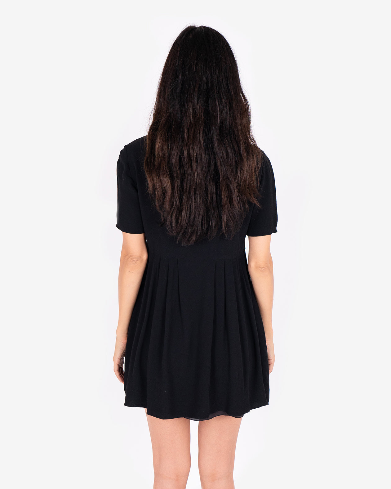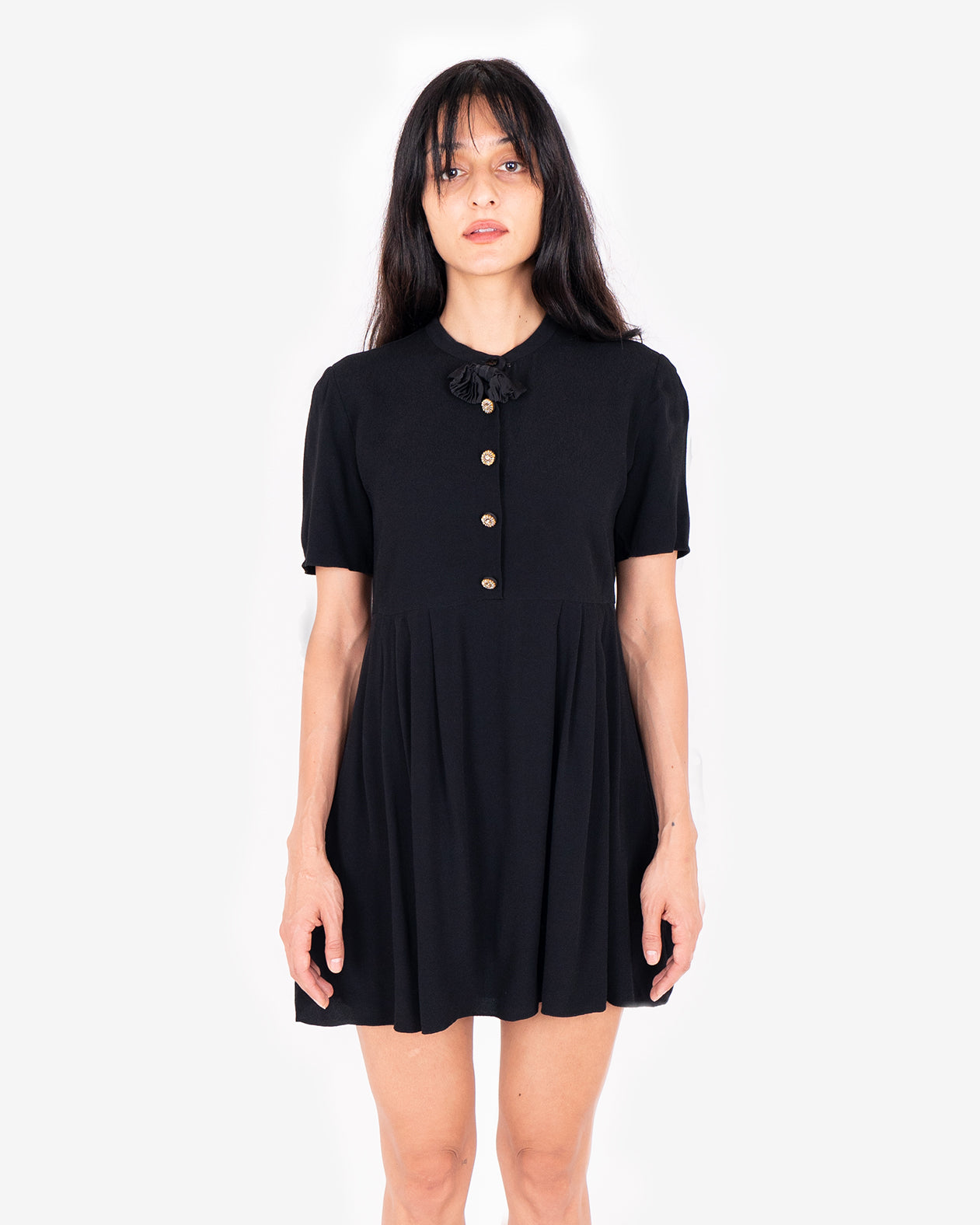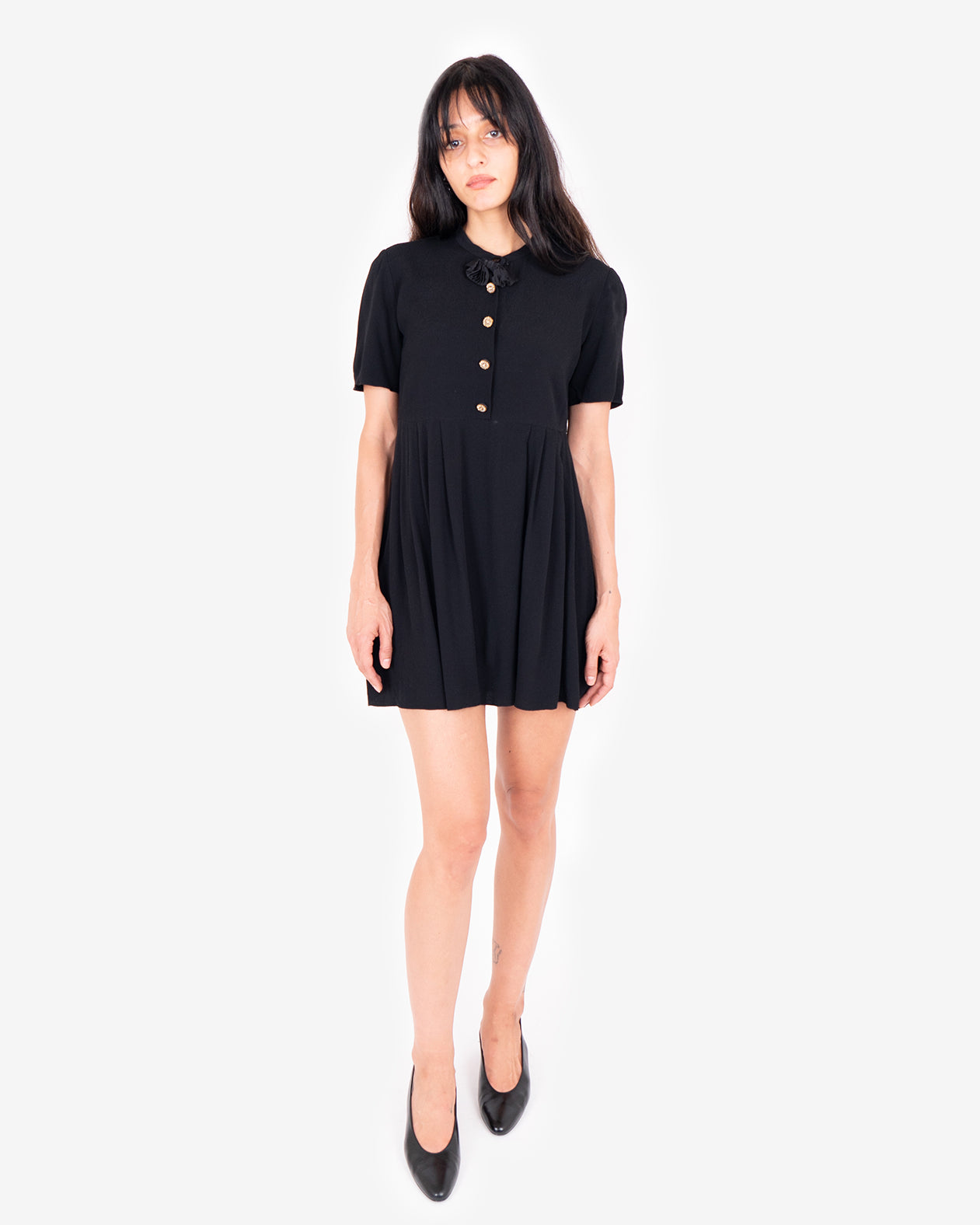 Coveted babydoll style mini dress featuring t-shirt style sleeve, gold contrast button-down front, black velvet bowtie and a pleated skirt.