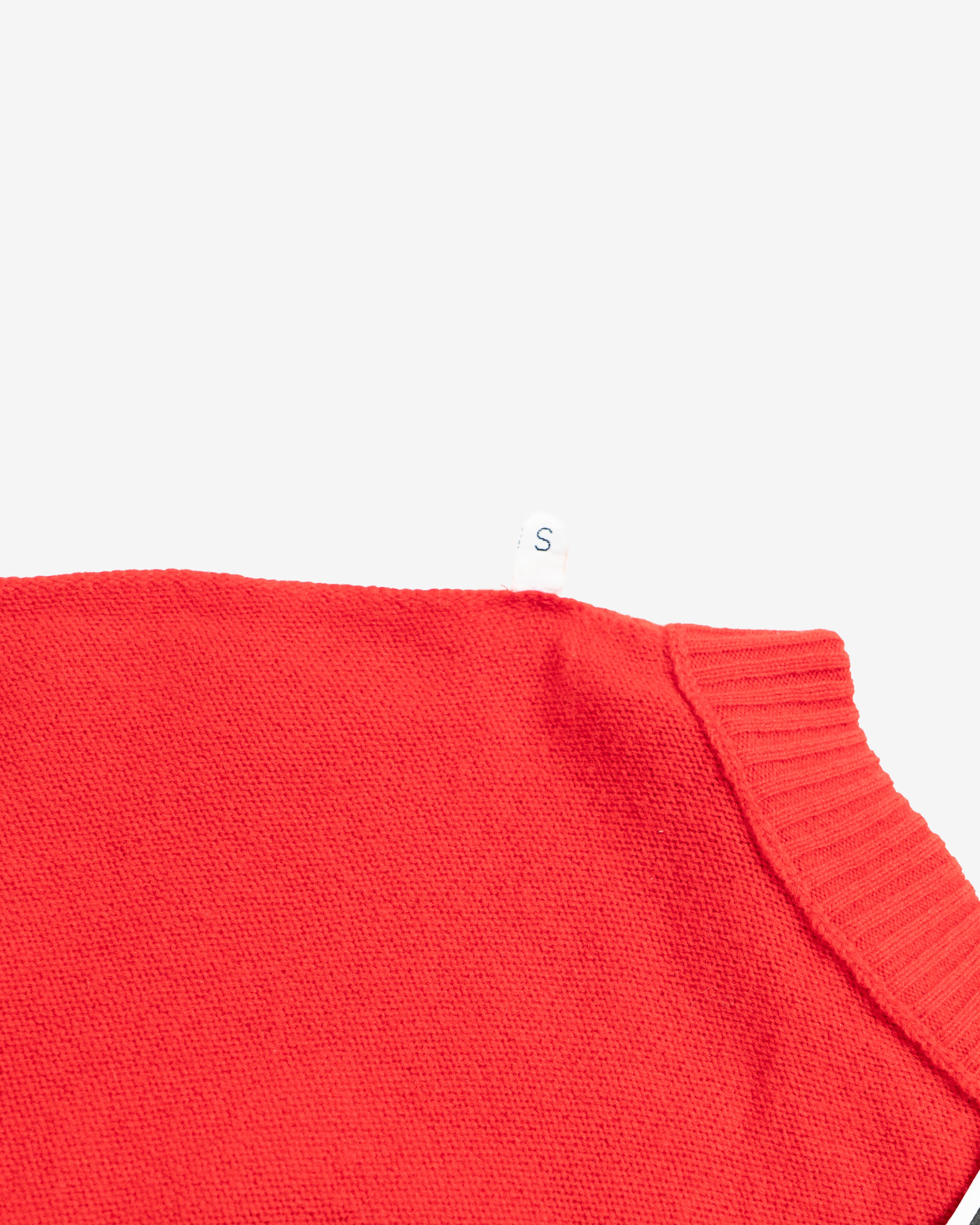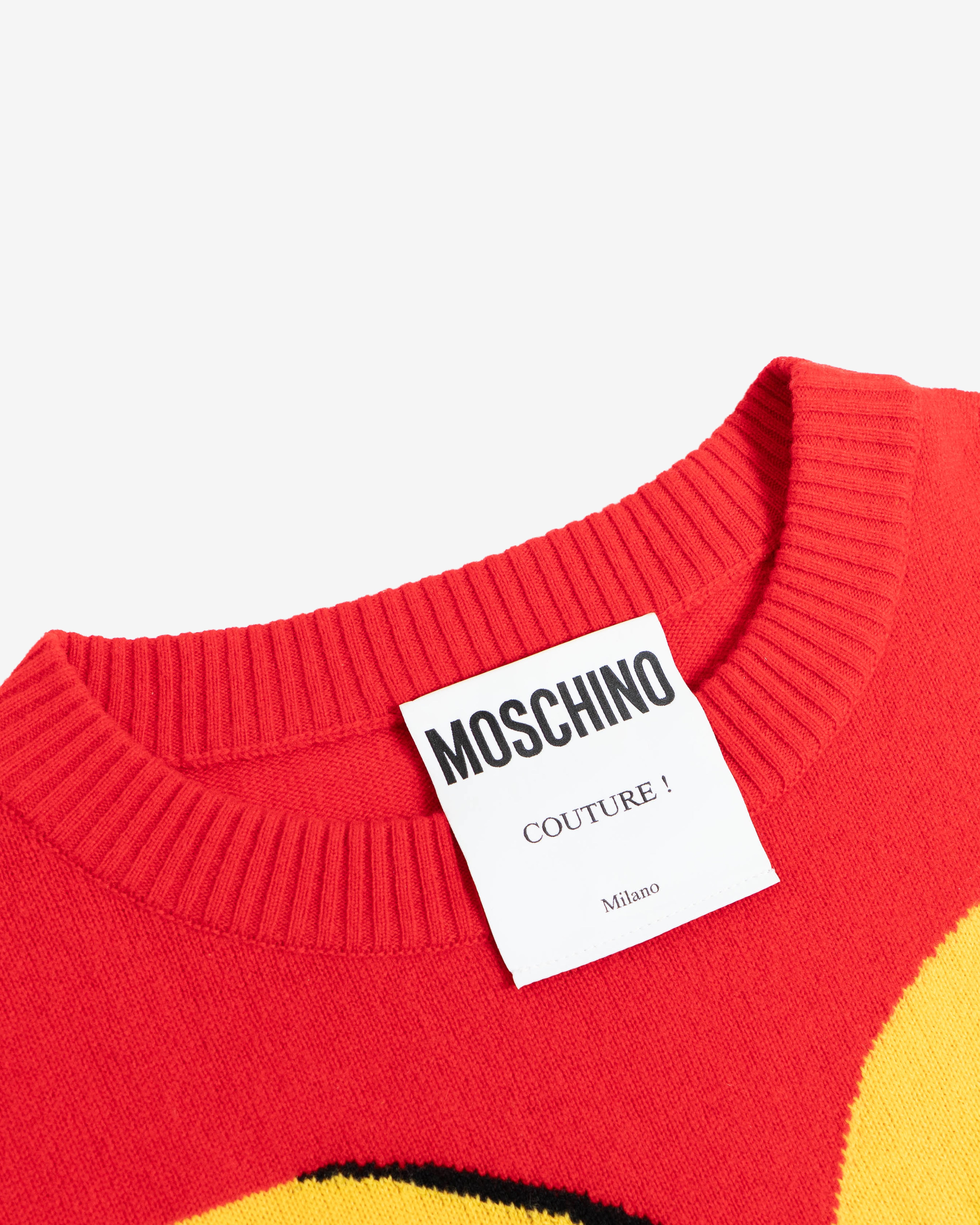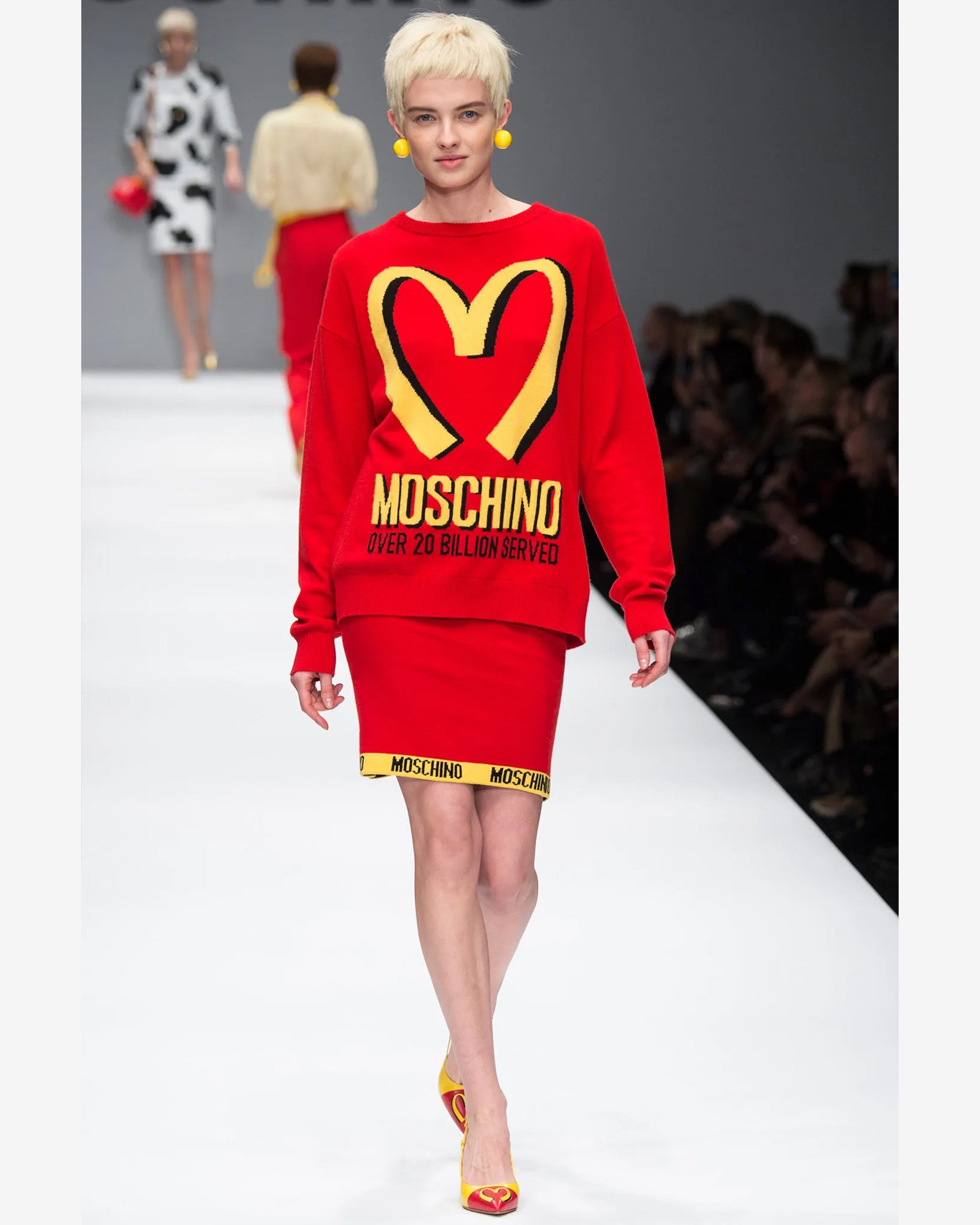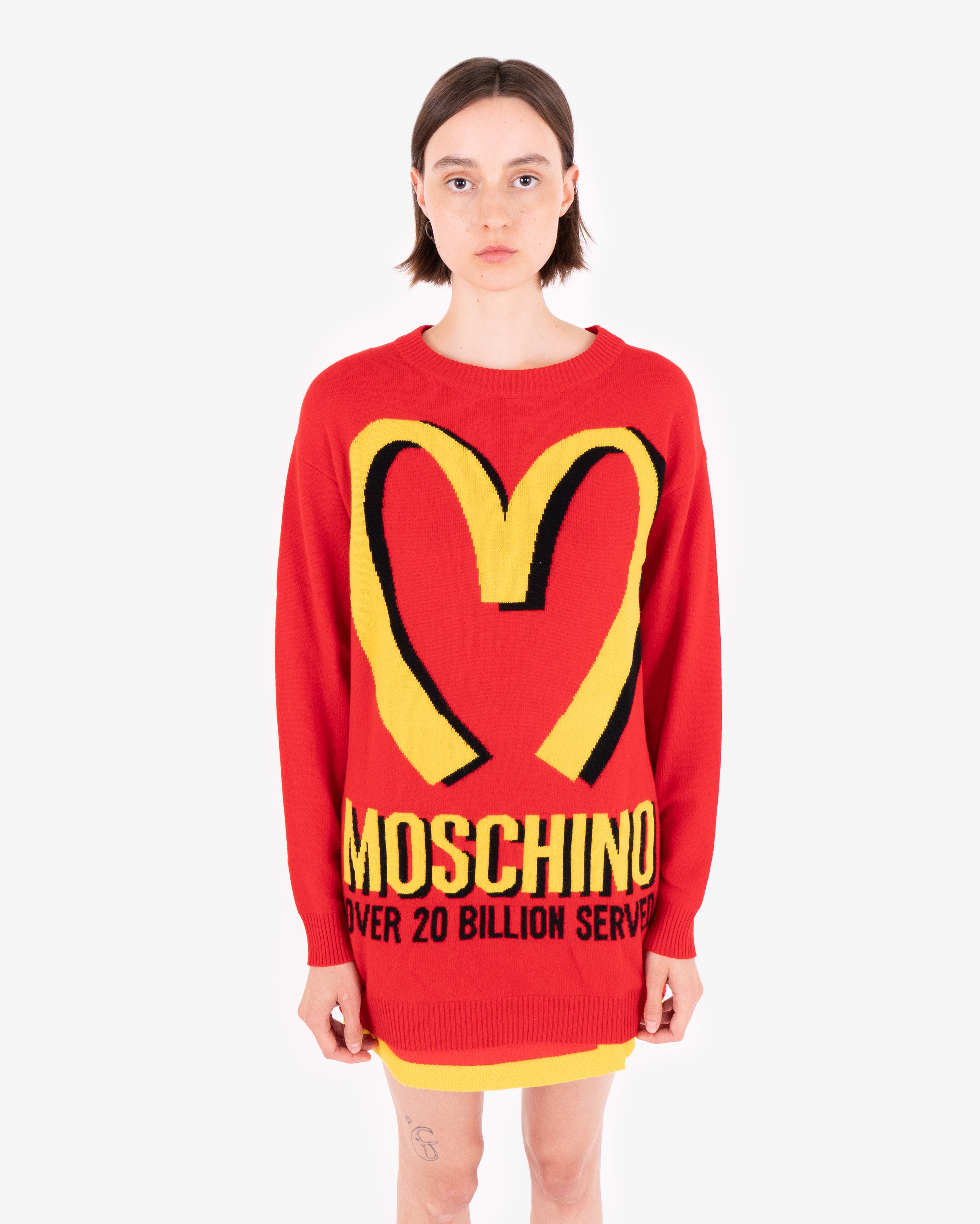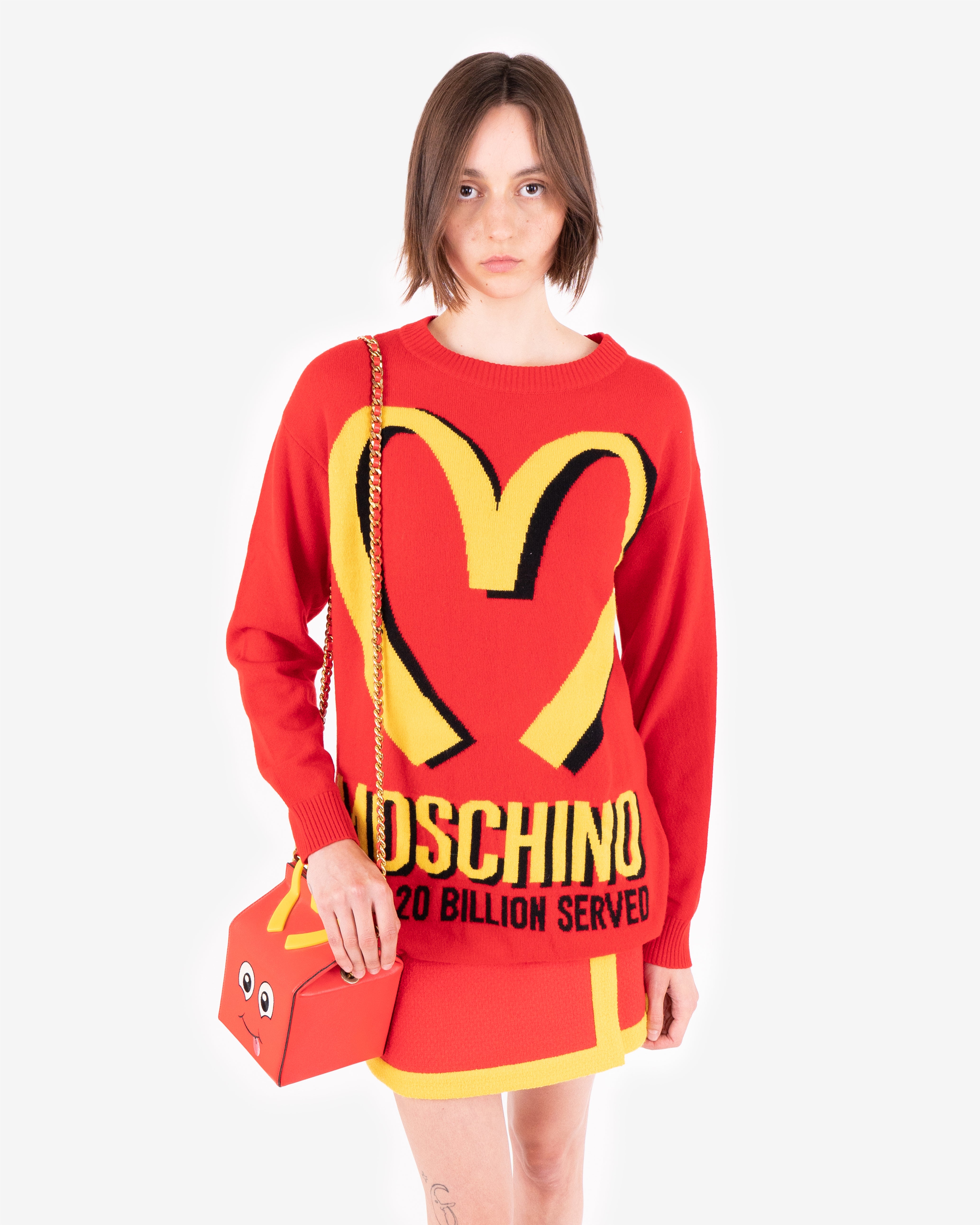 Red oversized knit sweater. No official collaboration; but part of Jeremy Scott's fast-food-fashion collection.