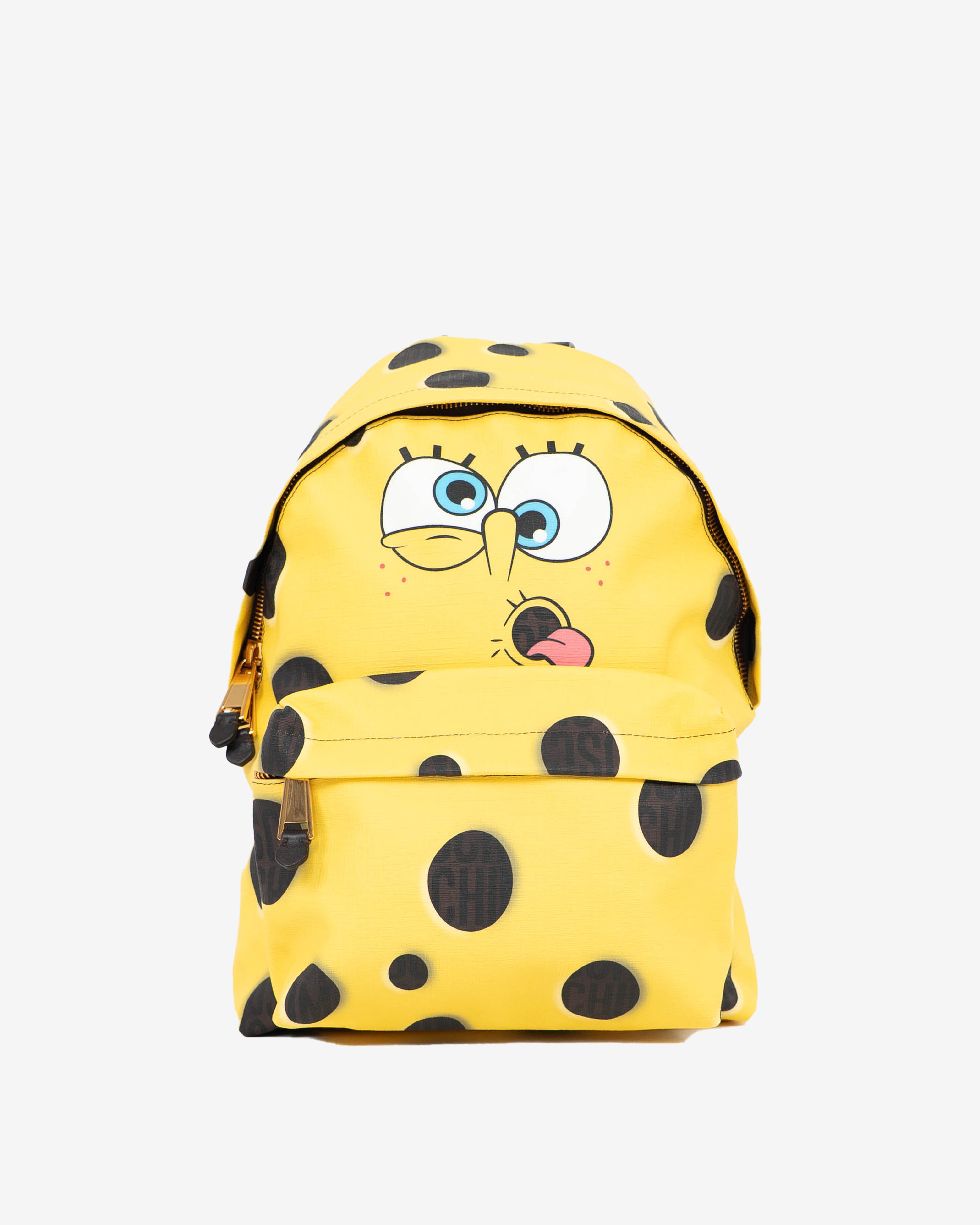 Backpack with front zipper pocket, brown adjustable straps, and gold tone hardware from the iconic Nickelodeon Spongebob and Moschino Milano collaboration.