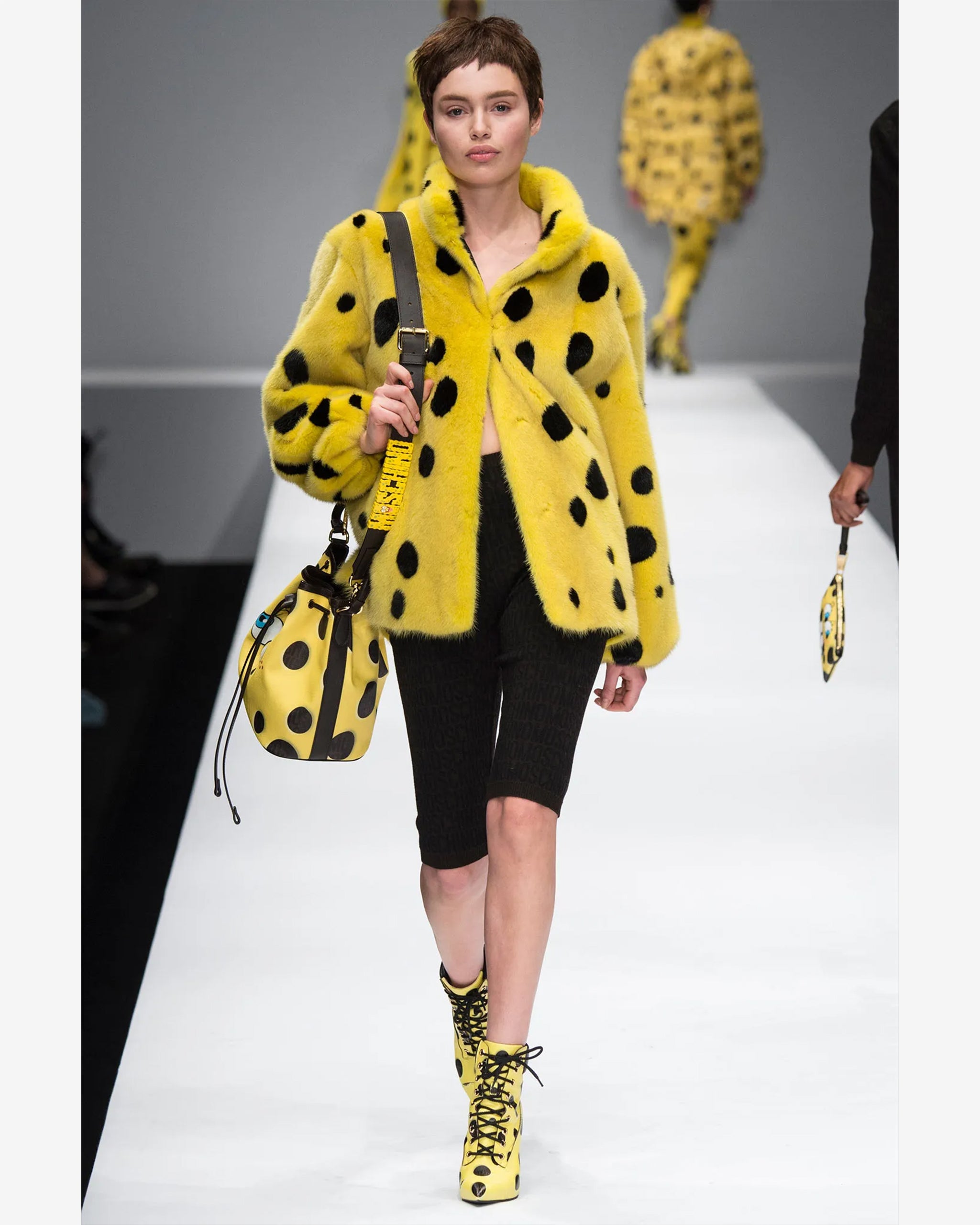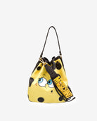 Iconic Nickelodeon Spongebob and Moschino Milano collaboration bucket bag with brown adjustable leather strap, Moschino PVC hardware on strap and gold-toned hardware.