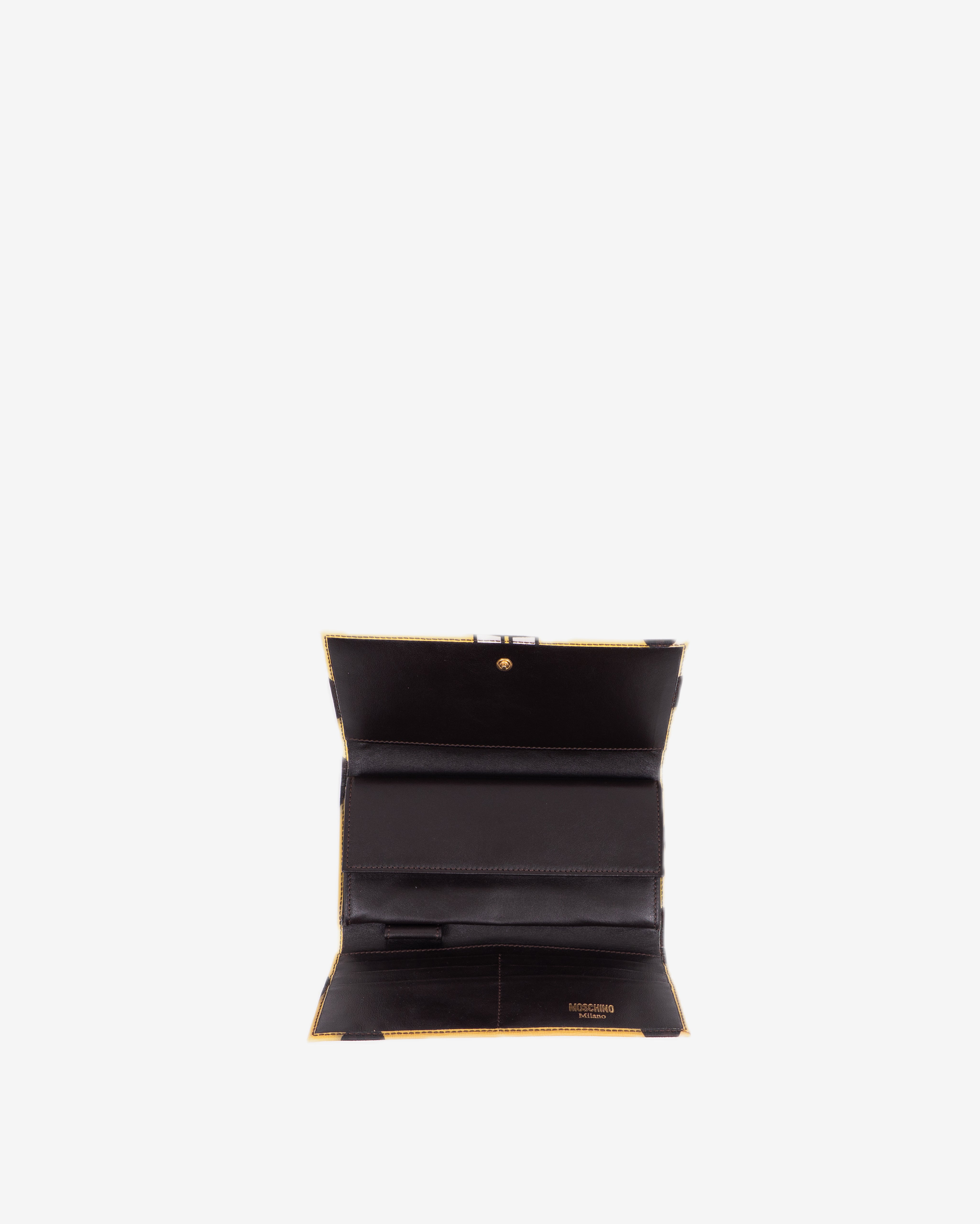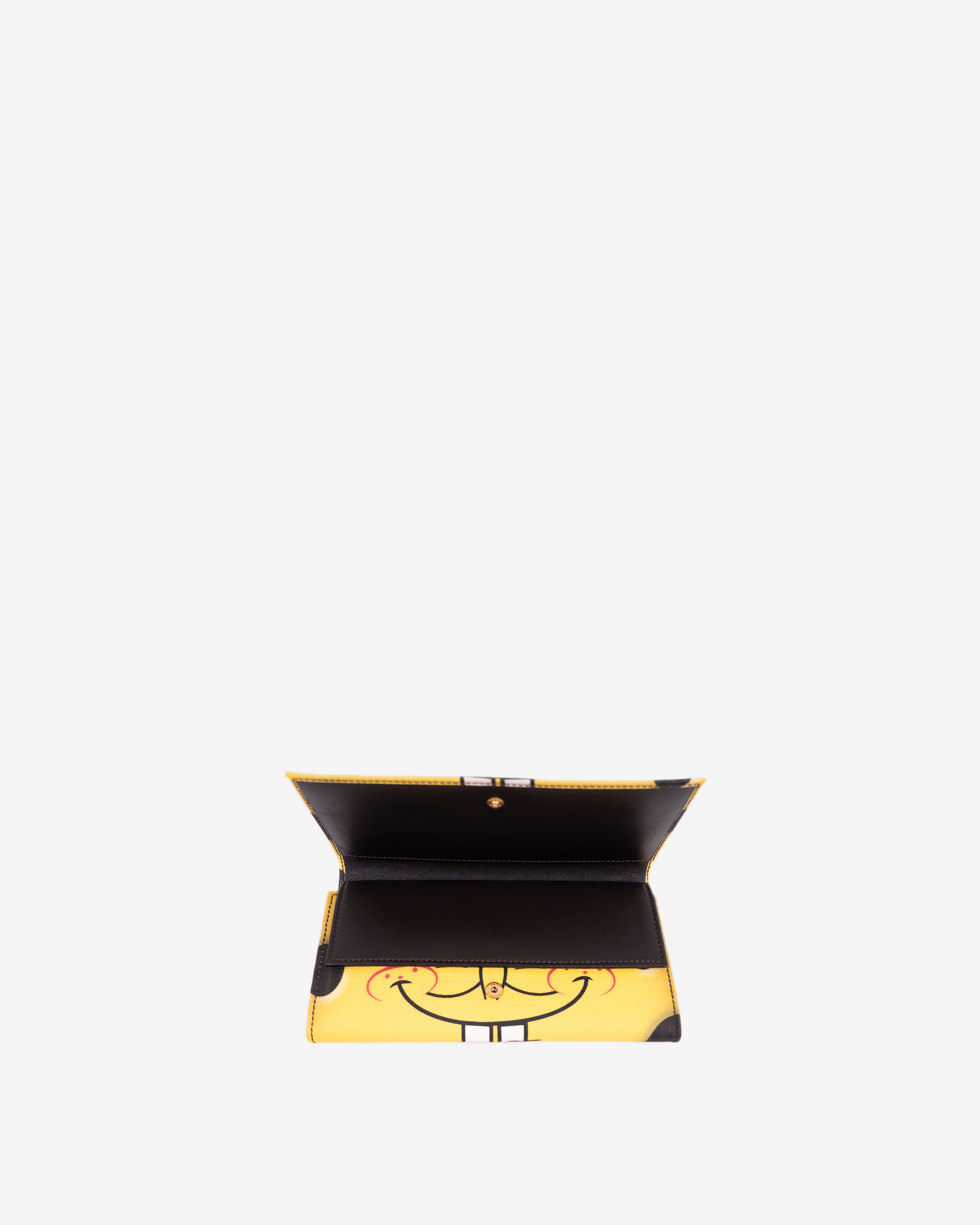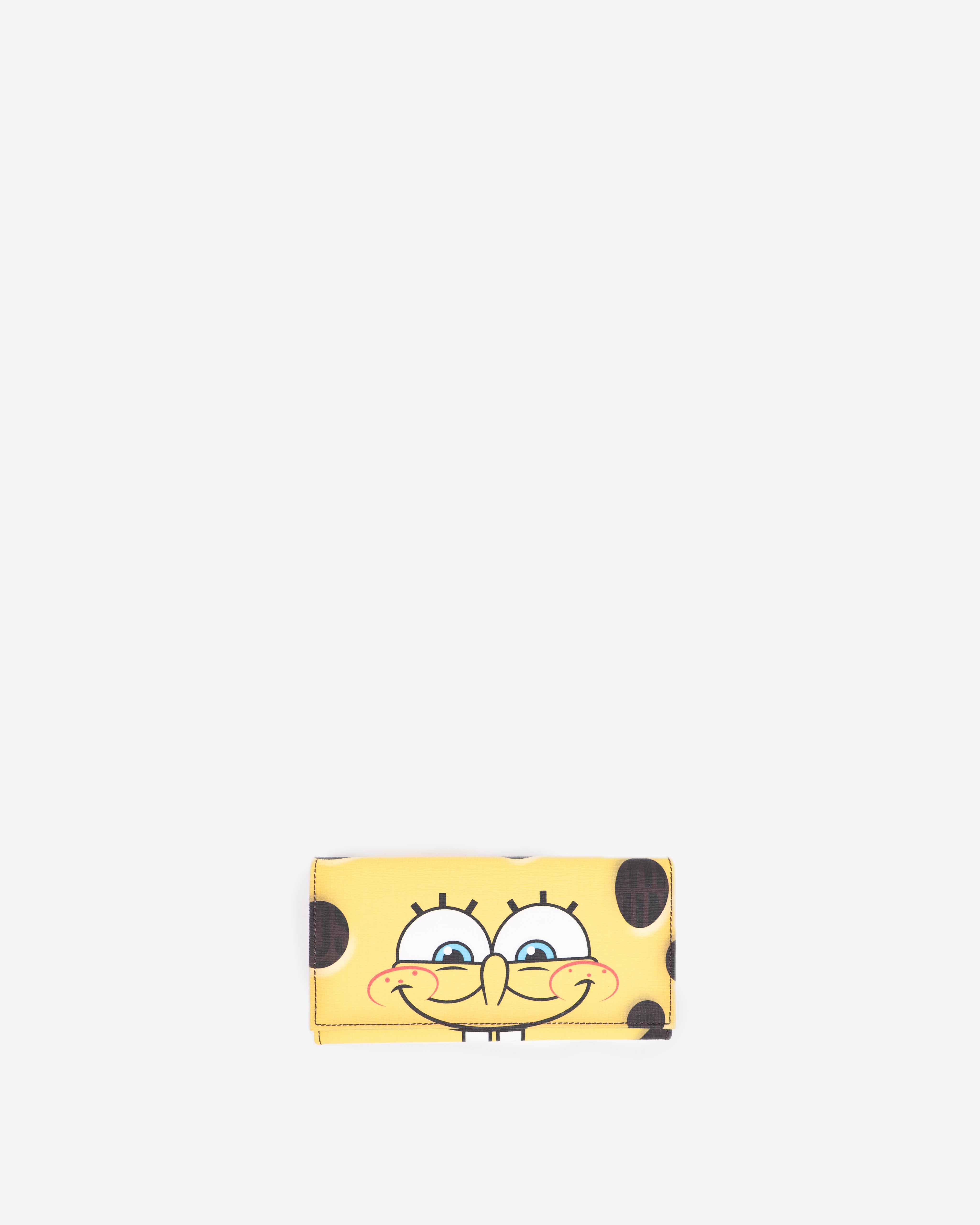 Iconic Nickelodeon Spongebob and Moschino Milano collaboration rectangular wallet with fold-over-flap design, 6 card holder slits, big coin buttoned purse and extra slit for banknotes.