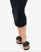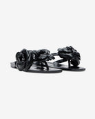 Black jelly slip-on sandals with glossy floral details. fit true to size.