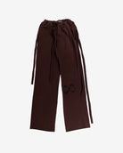 Signature organic cotton fleece sweatpants in brown with a soft, stretch waistband, dual side pockets, featuring raw cuffs and an adjustable self-tie detail along the side seam.