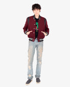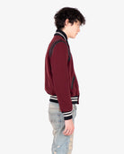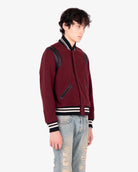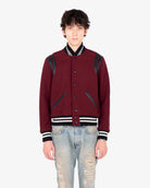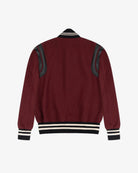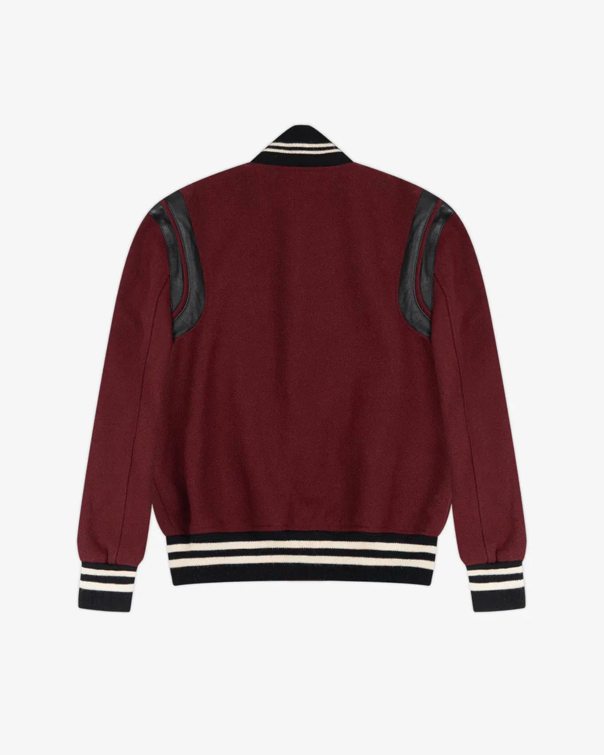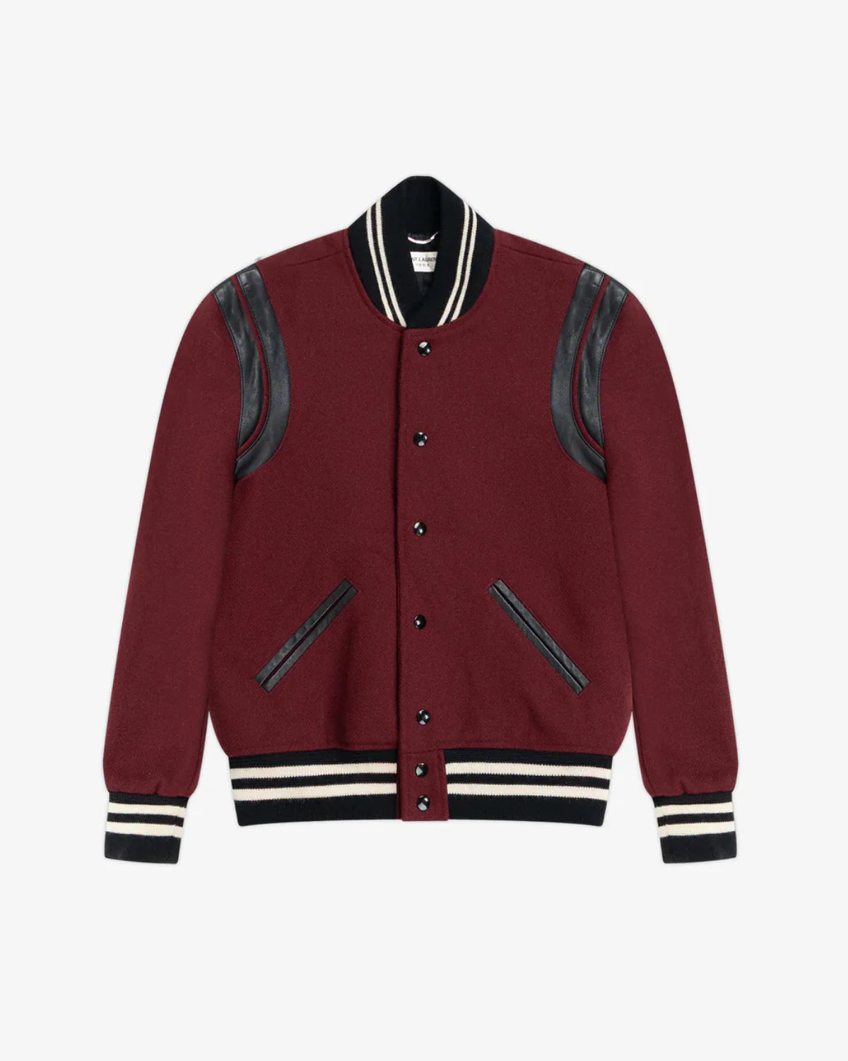 Unique colorway of the iconic teddy jacket features signature leather shoulder panels and leather trim on the pockets; button down front clasp closure, and contrast collar, cuffs and waist.