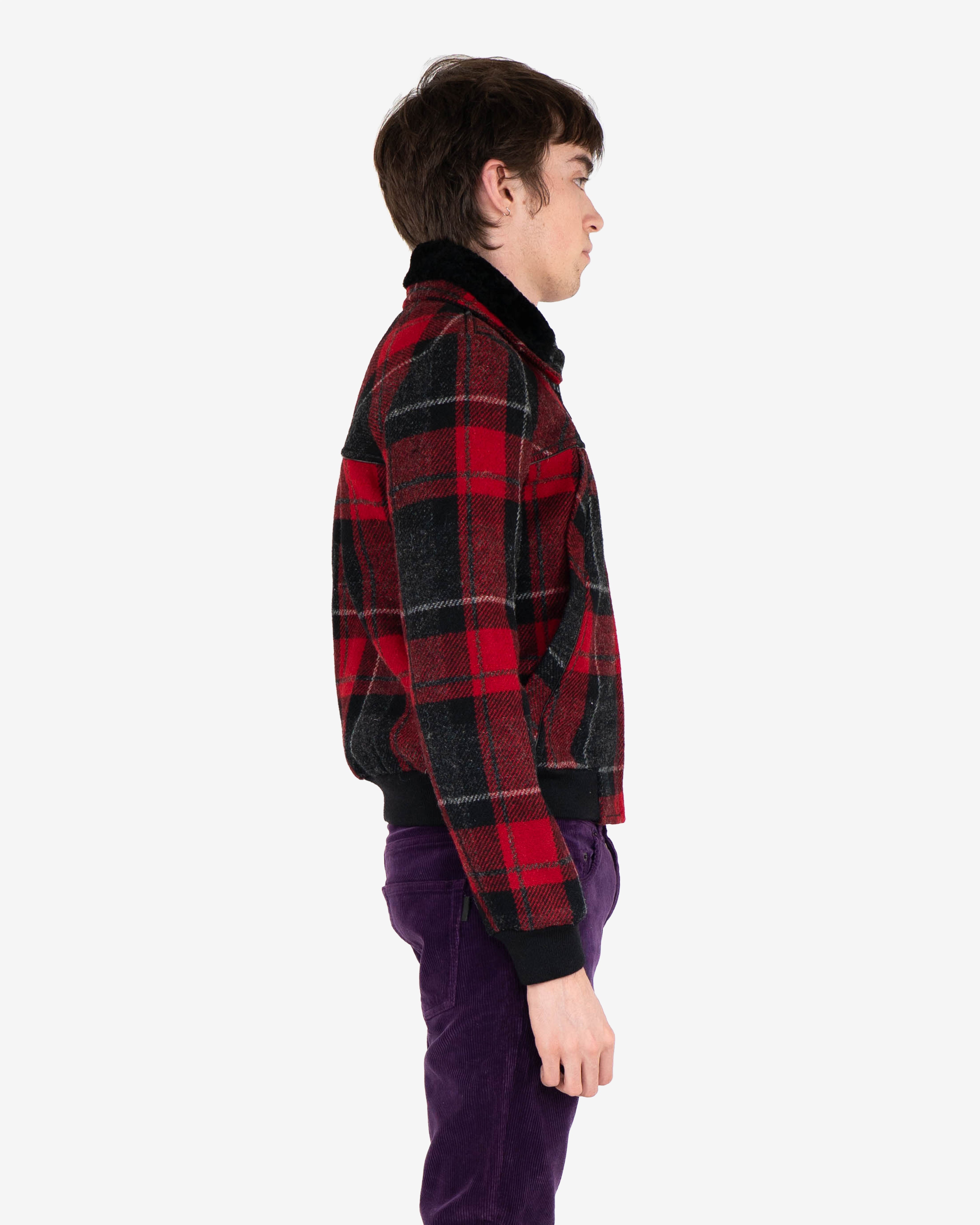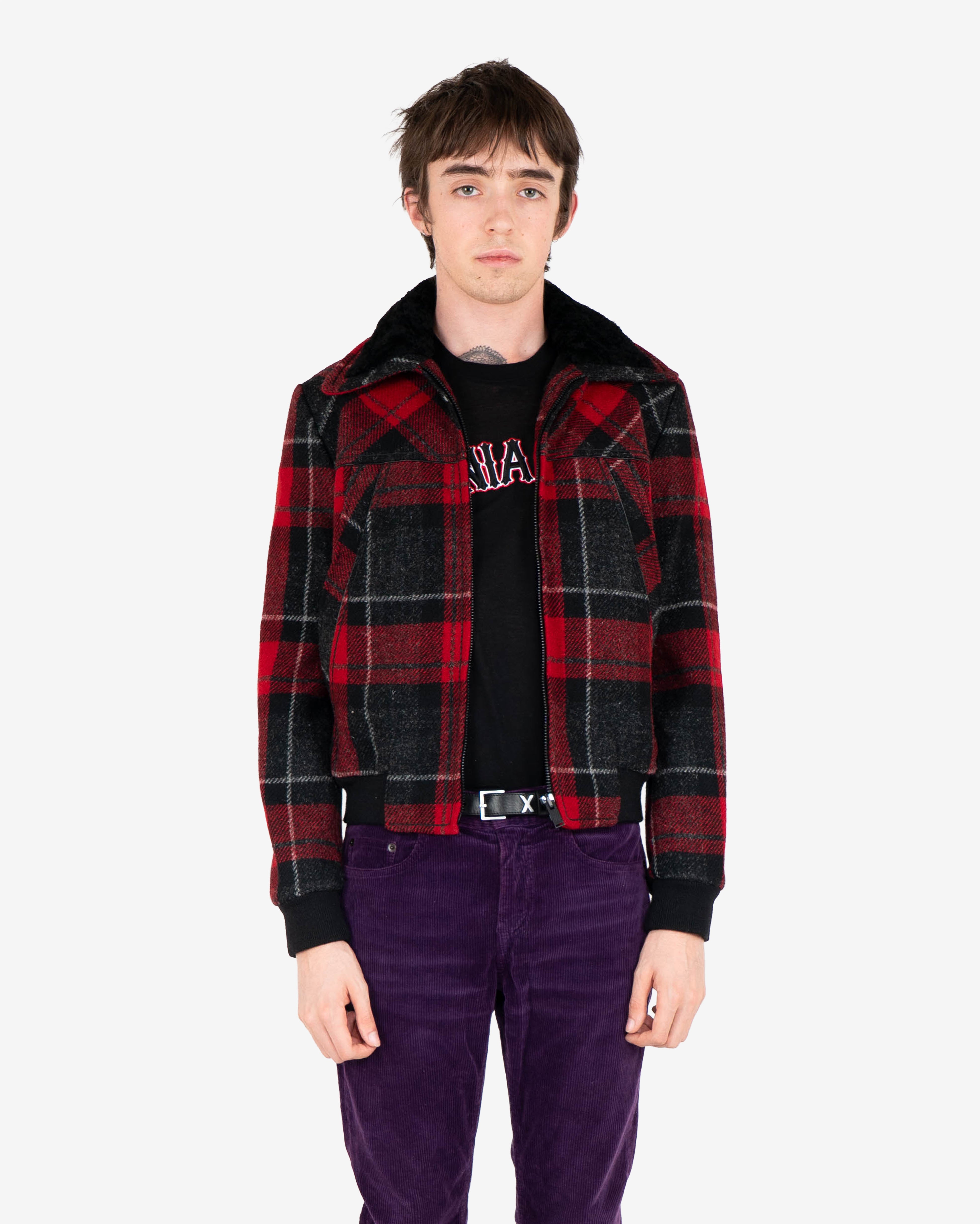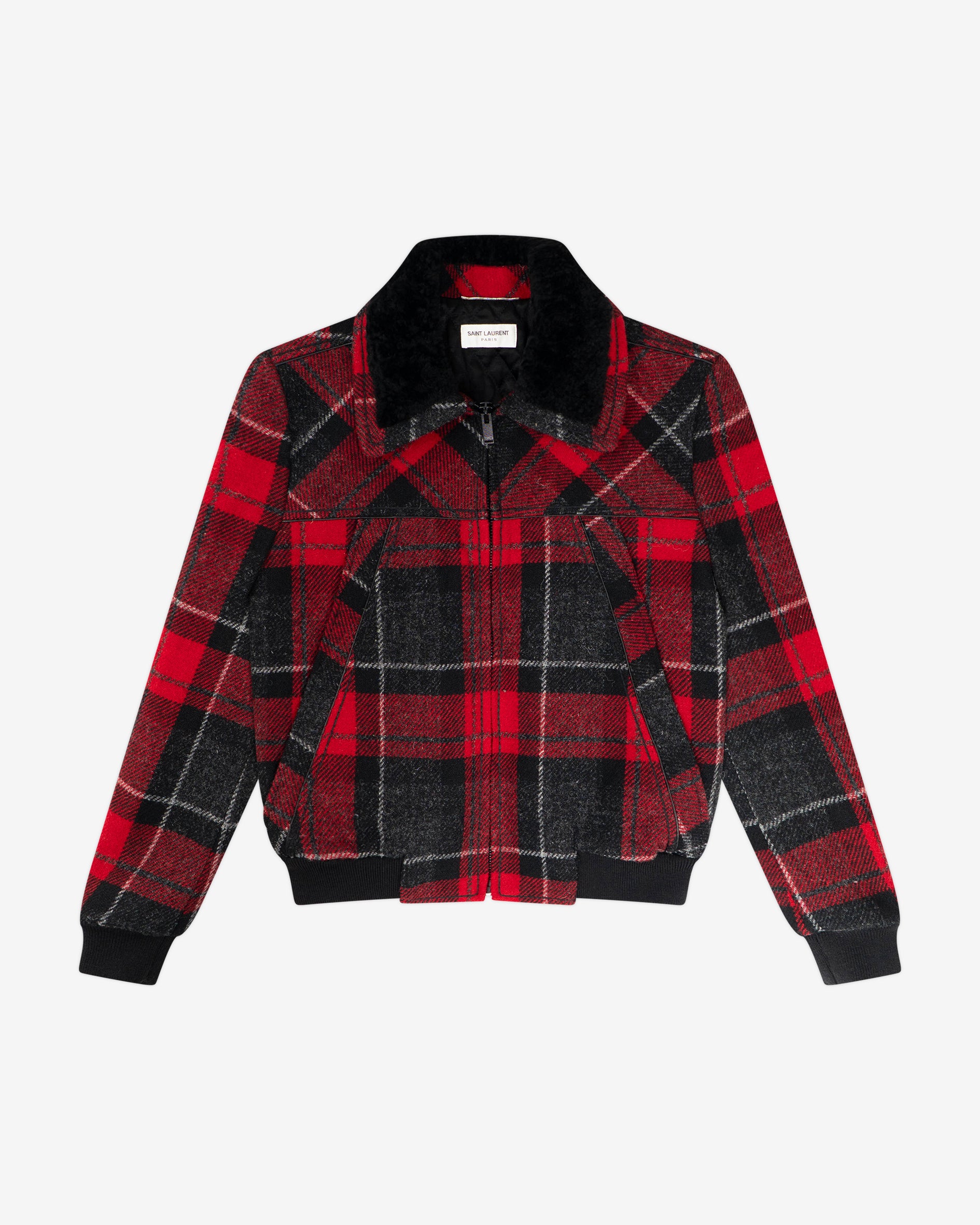 Stunning yet classic plaid wool checked jacket featuring contrast cuffs and collar and a shearling neck.