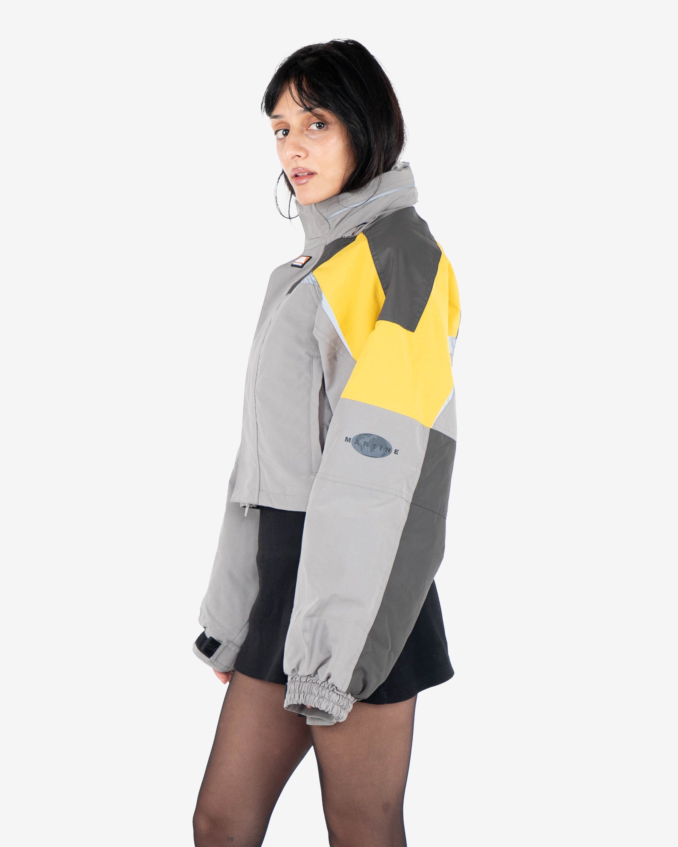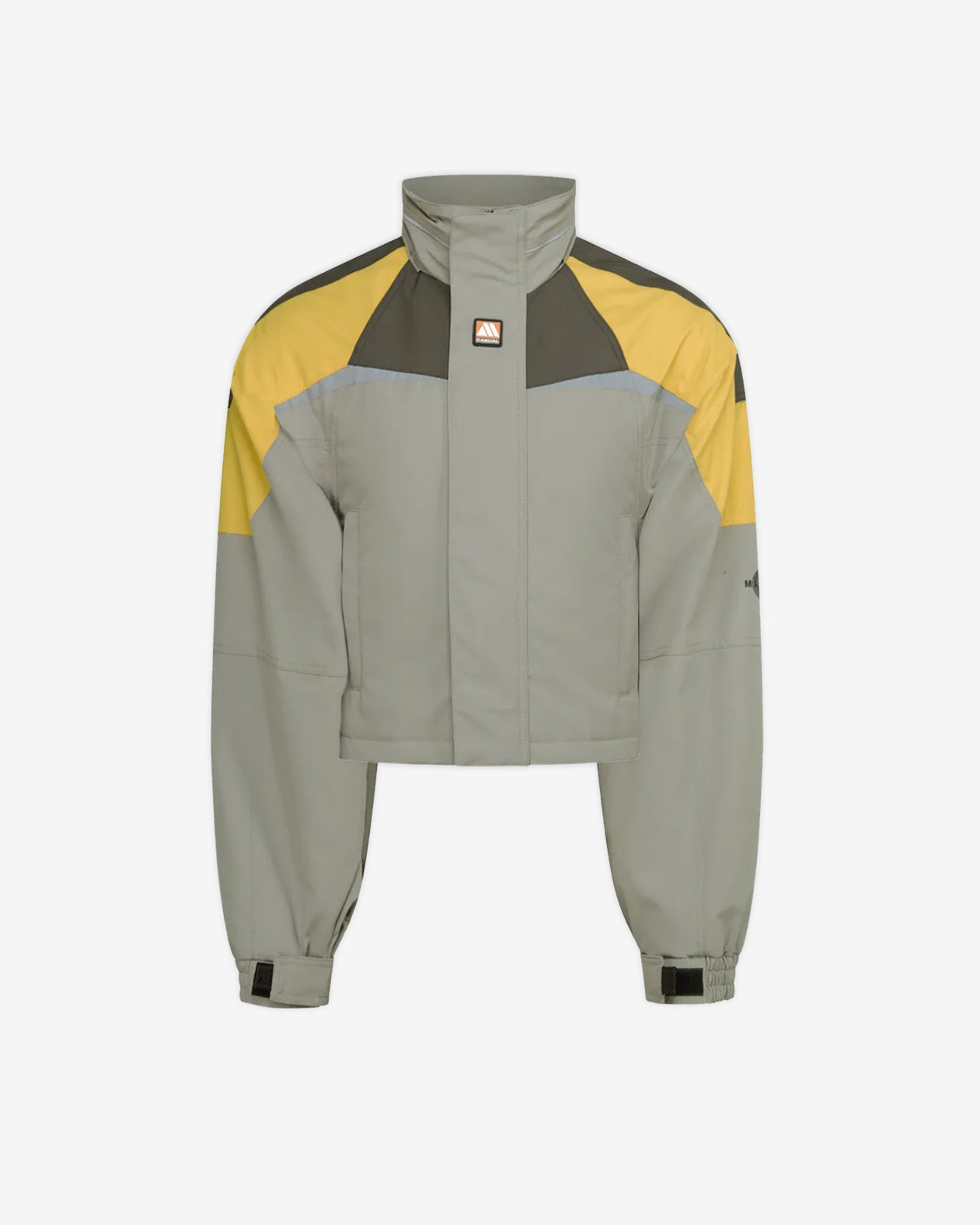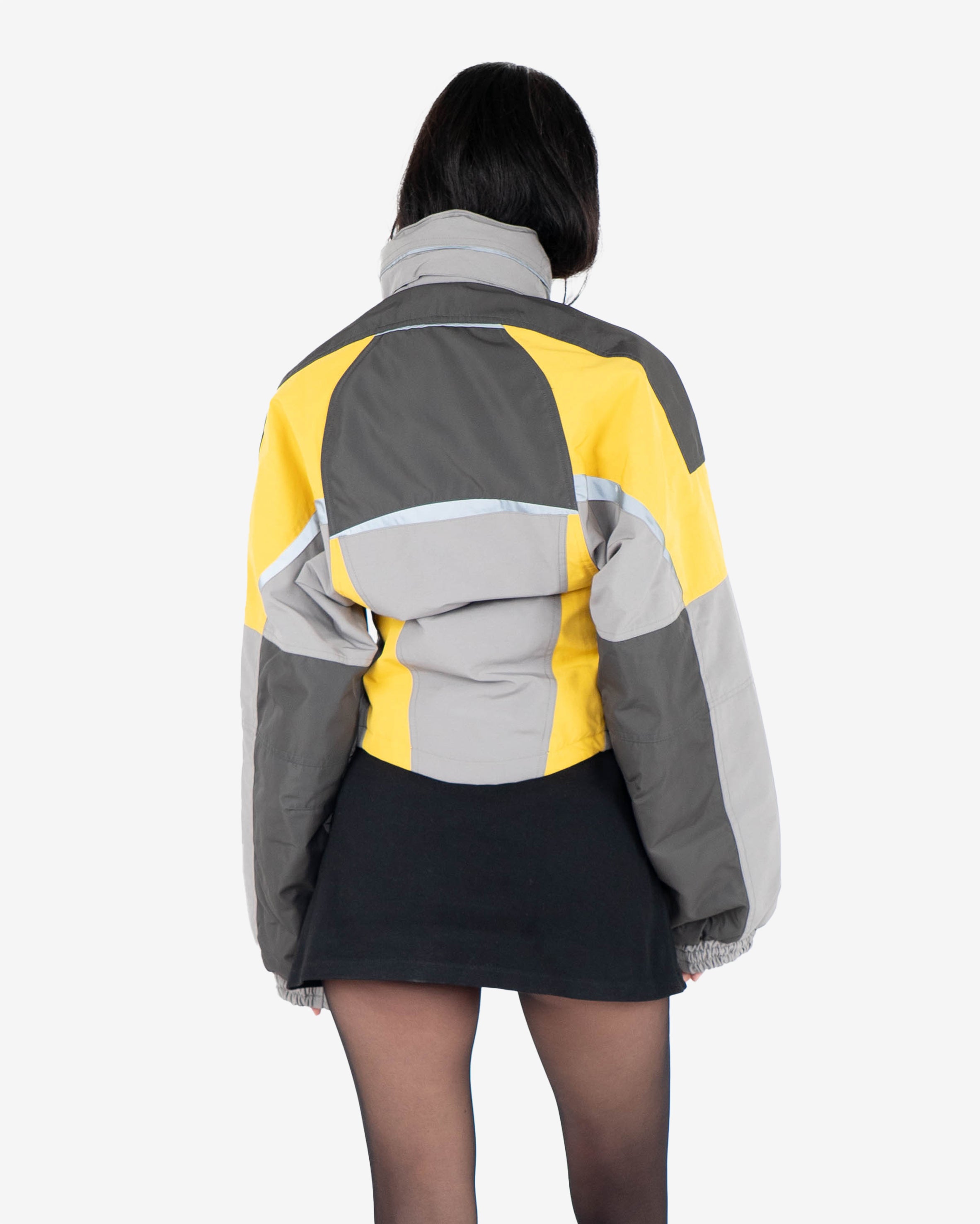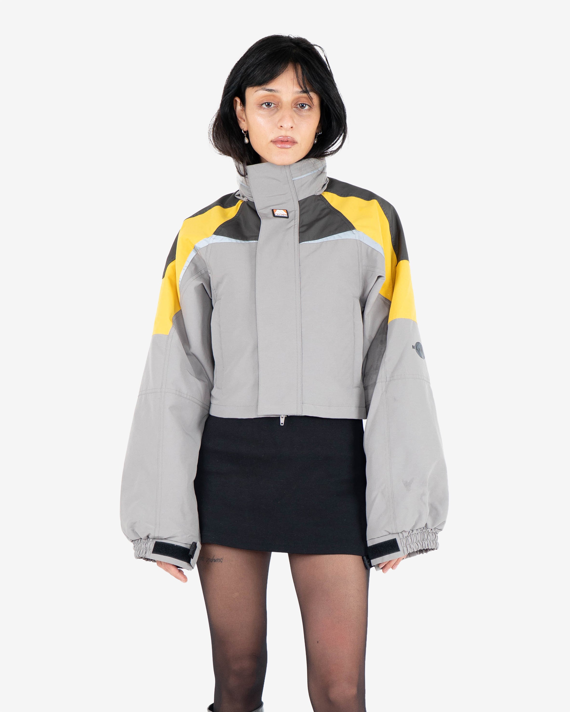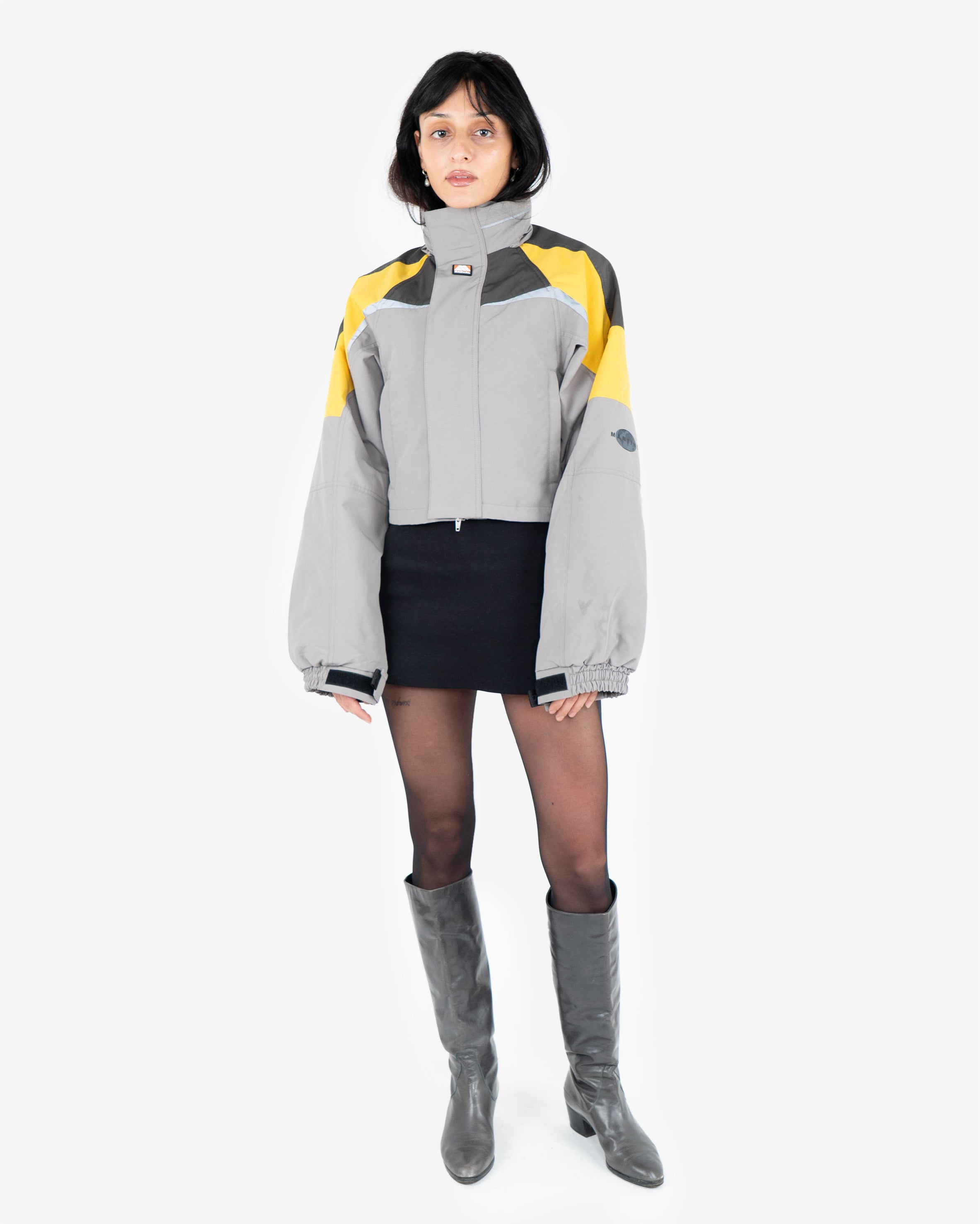 Cropped boxy, oversize fit sports jacket with panel detail, high collar, zip closure and logo patch.