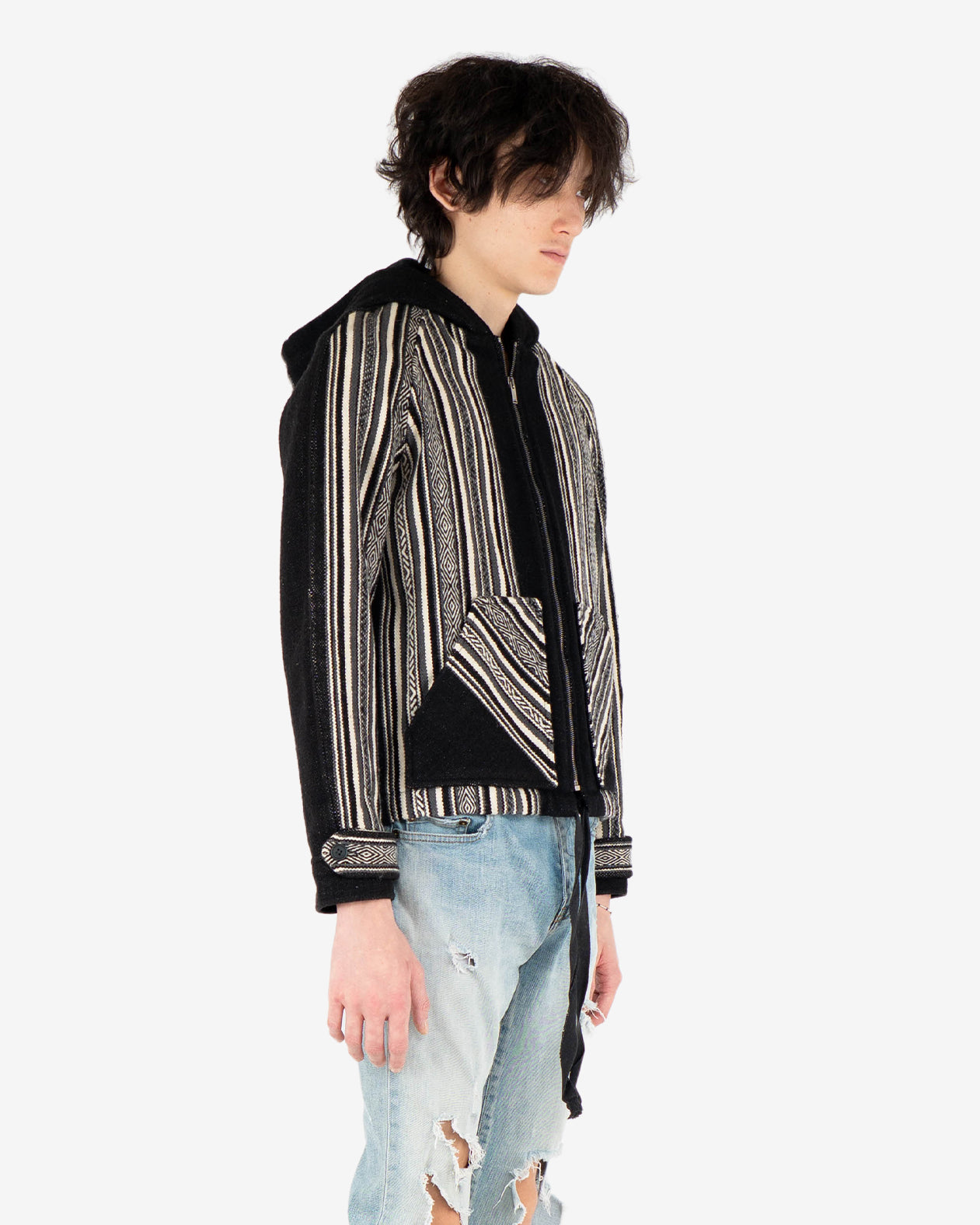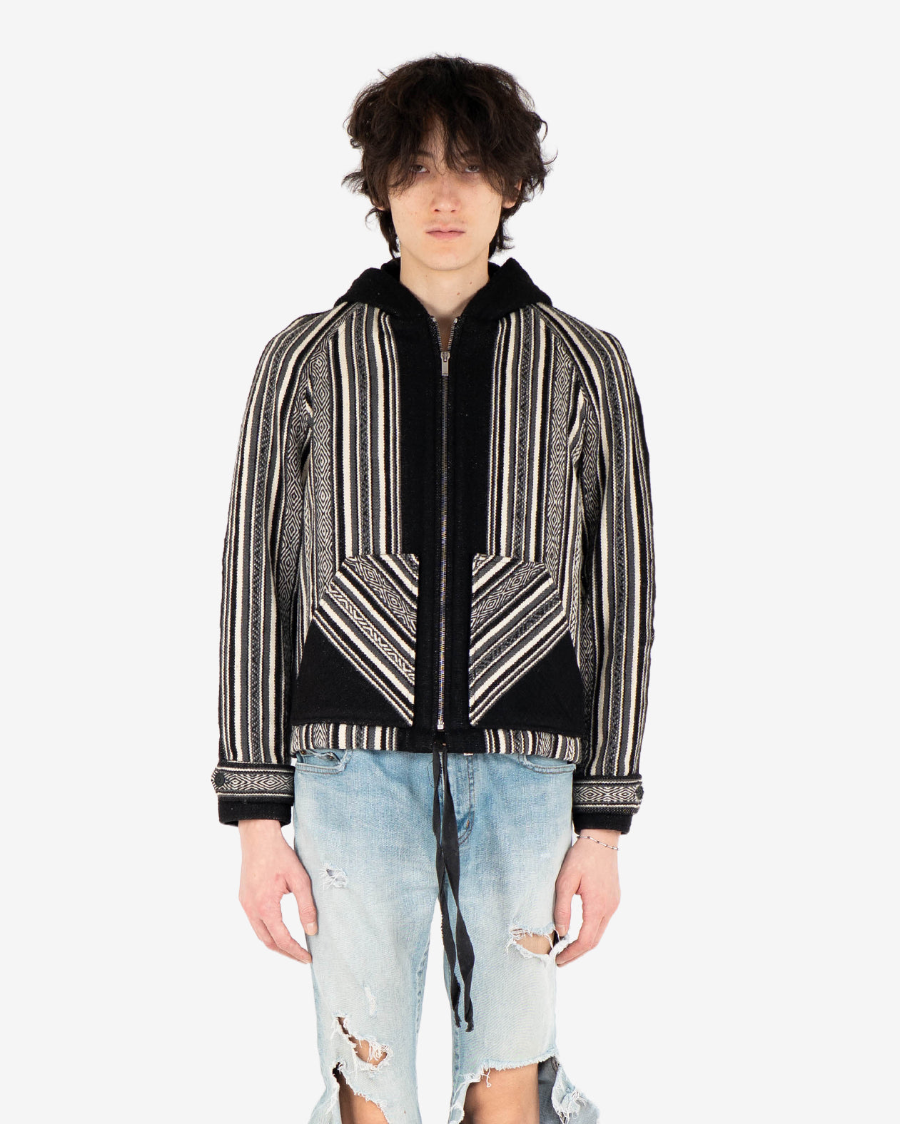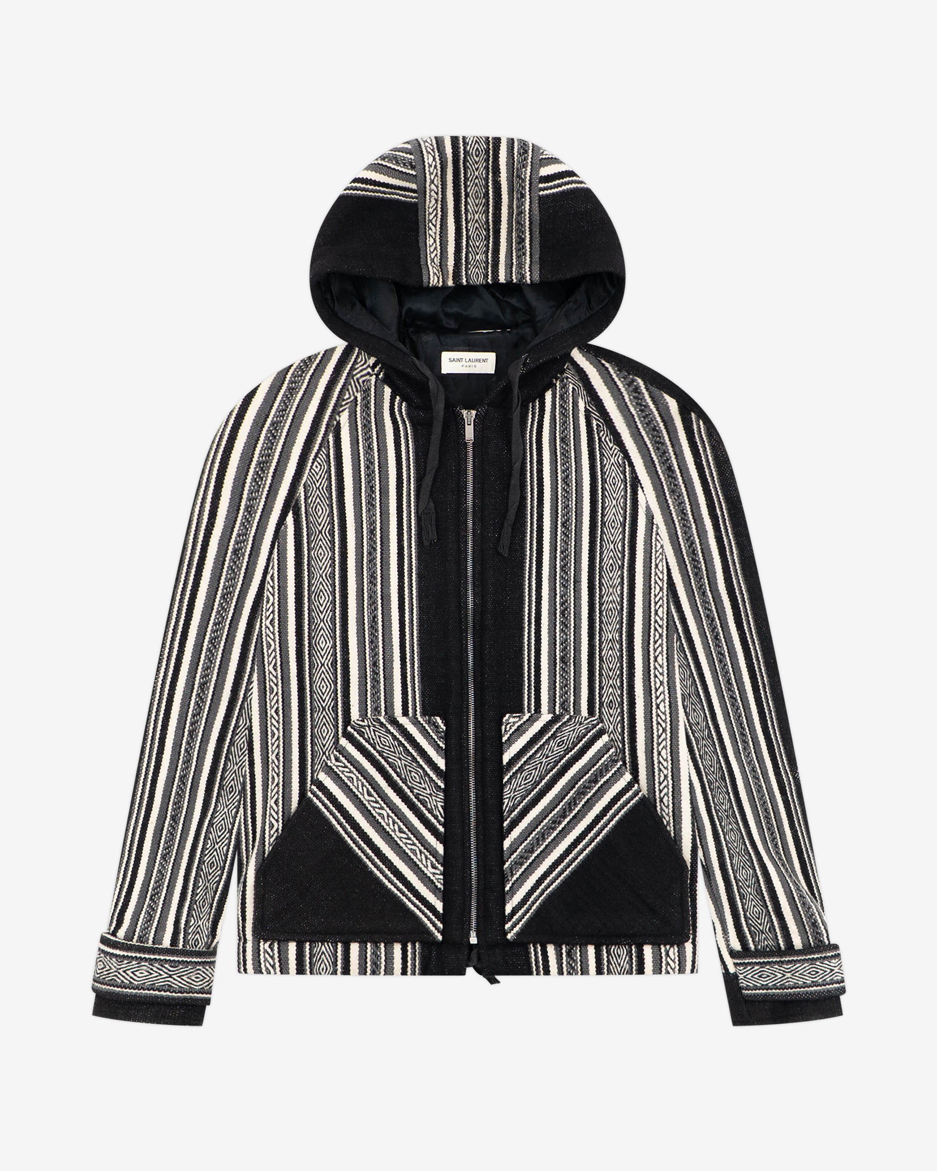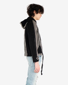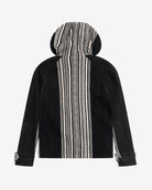 Long sleeve wool jacket striped in white, black and grey. Black drawstring at hood and hem. Zip closure at front. Kangaroo pockets at waist. Buttoned tab at cuffs.