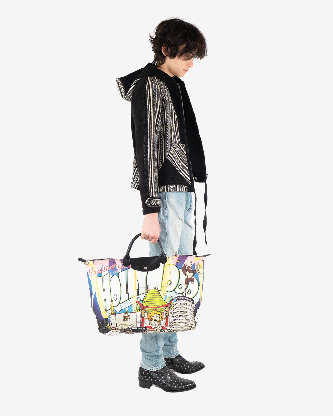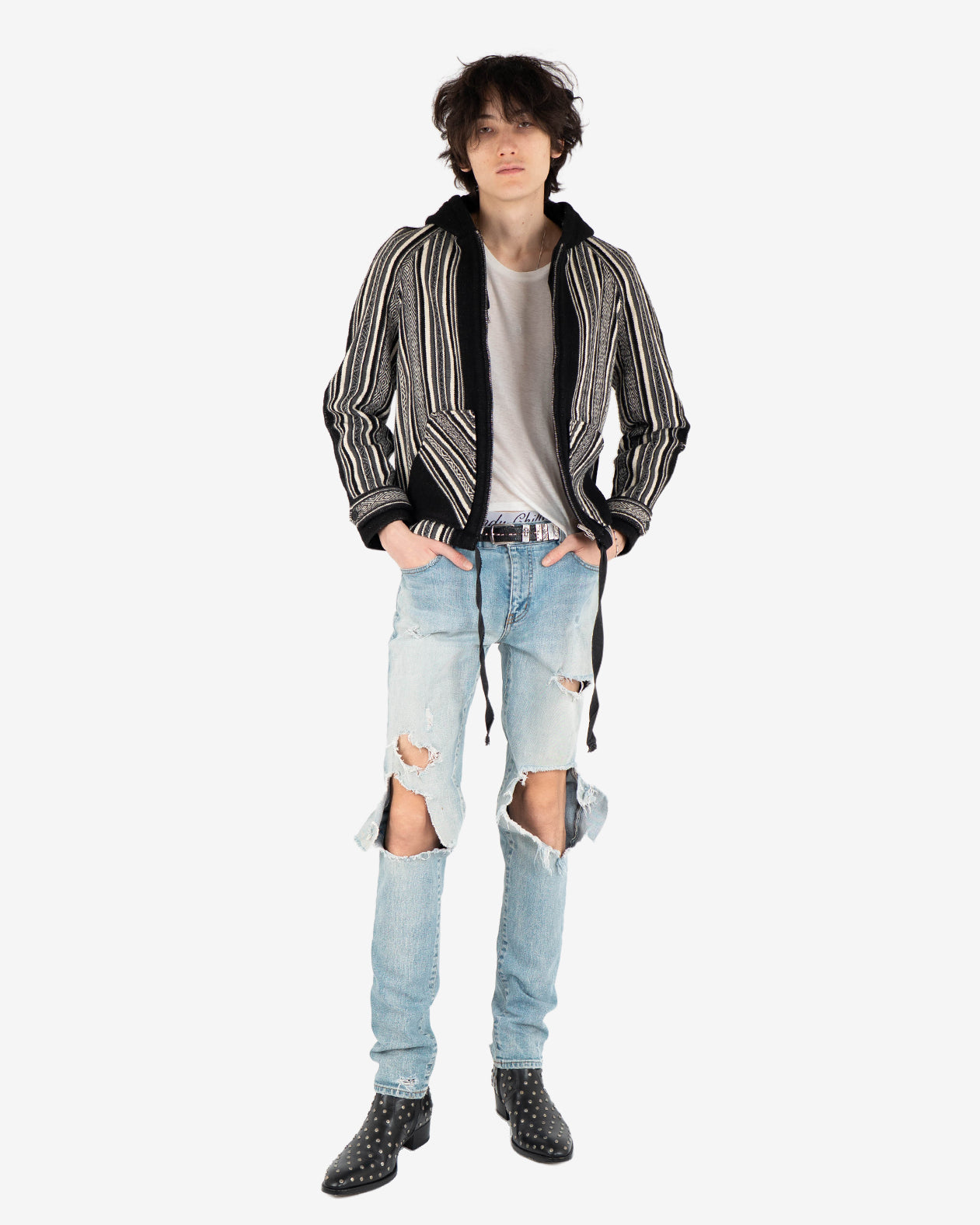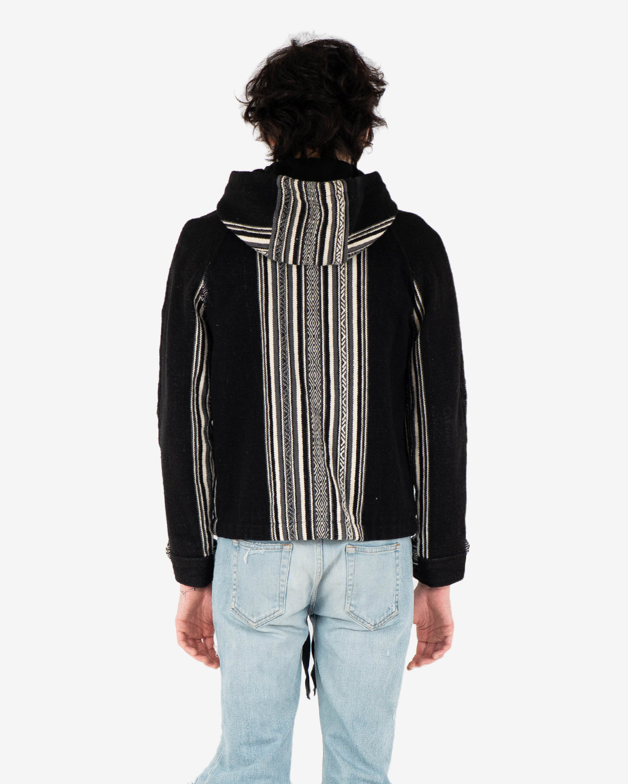 Long sleeve wool jacket striped in white, black and grey. Black drawstring at hood and hem. Zip closure at front. Kangaroo pockets at waist. Buttoned tab at cuffs.