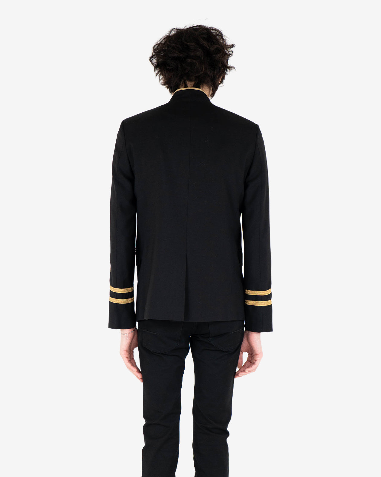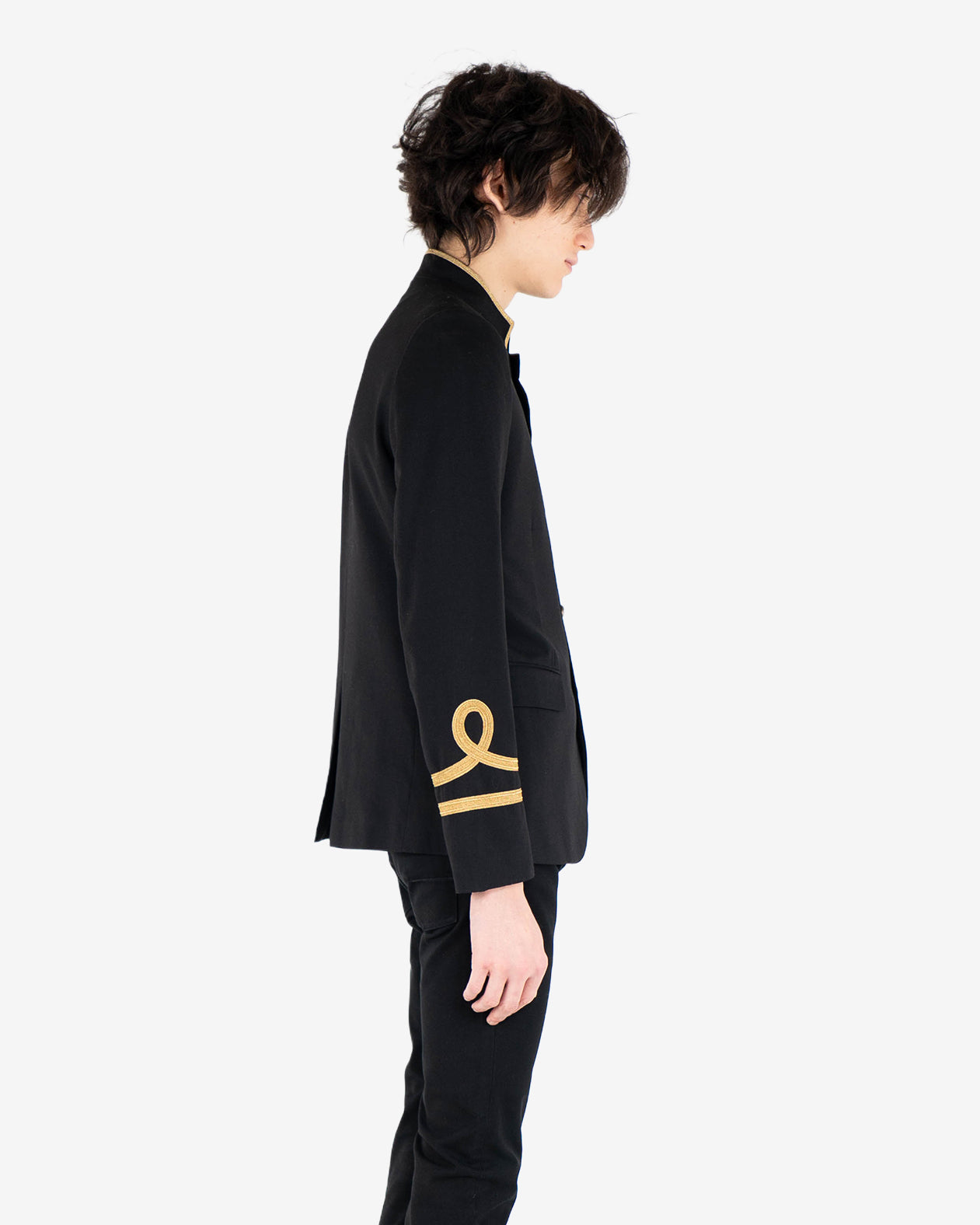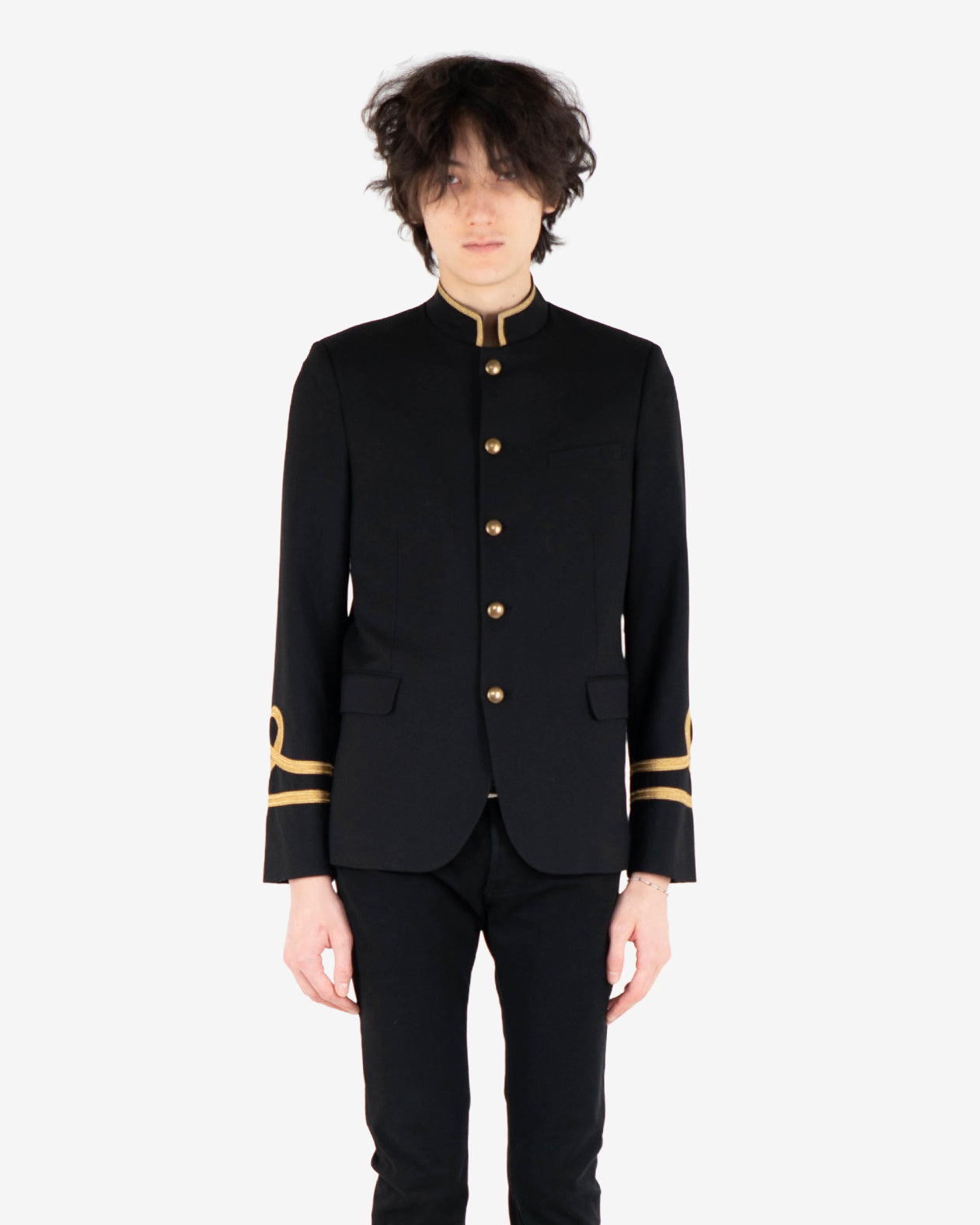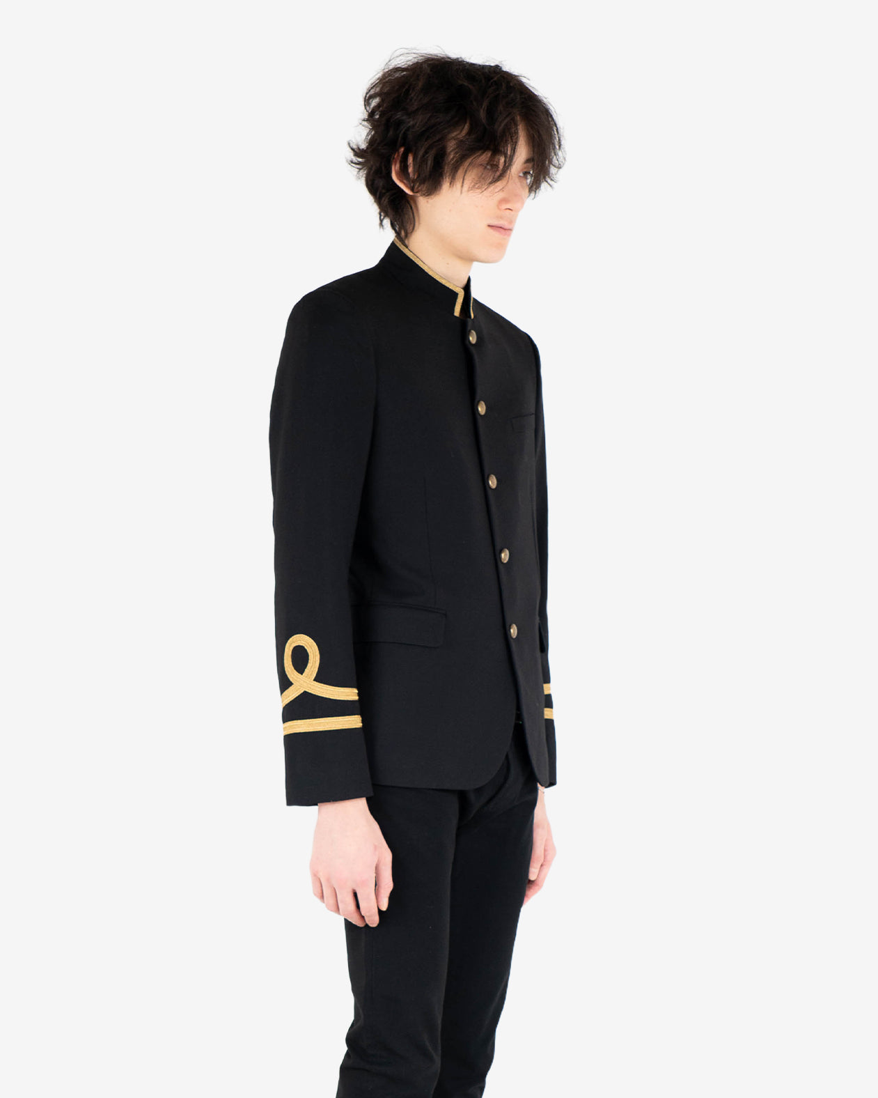 Napoleon style jacket with gold military trim and stand-up notch collar.