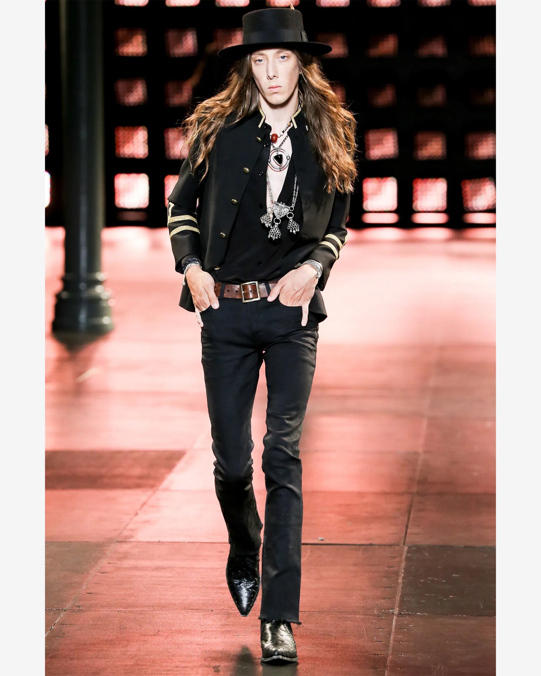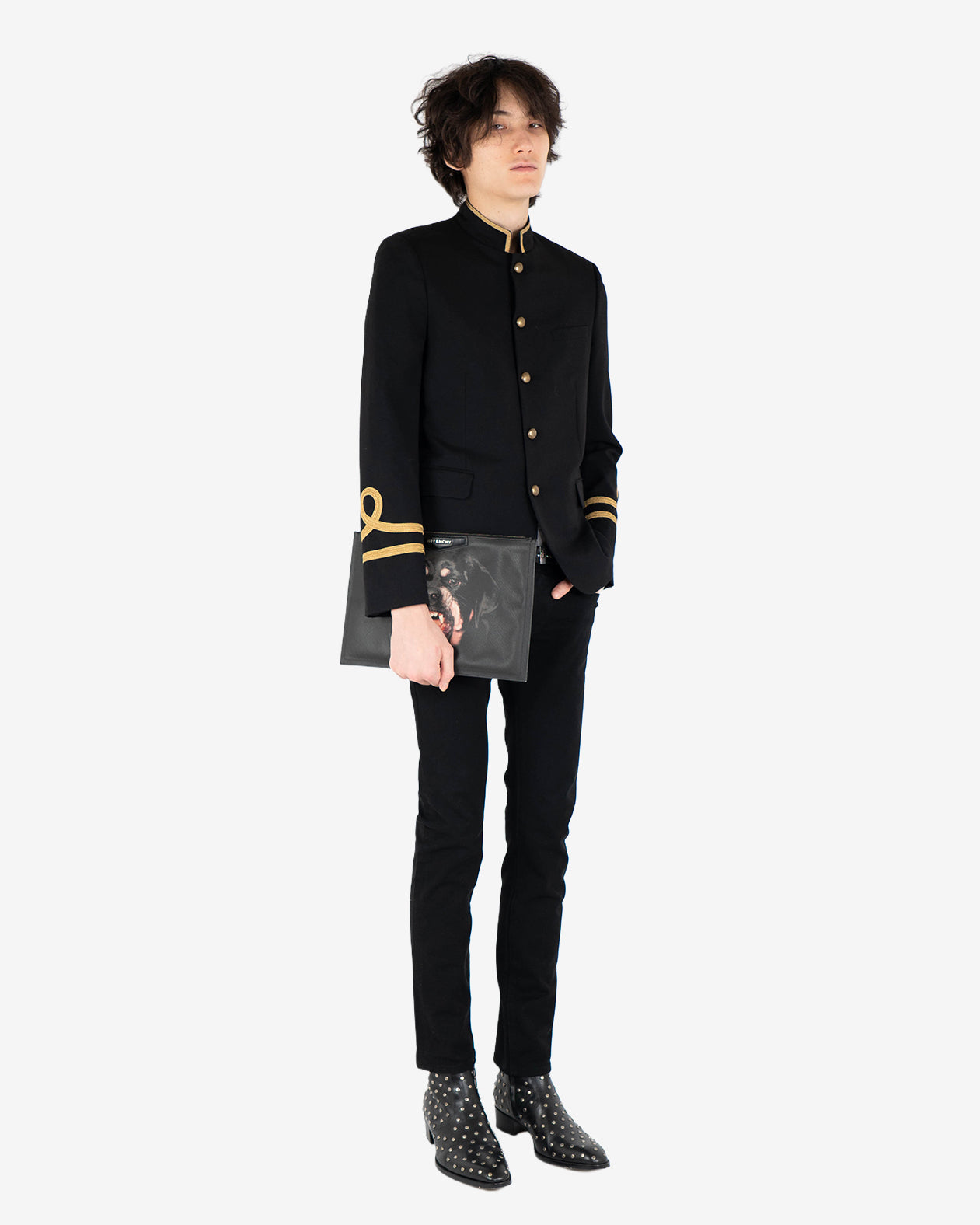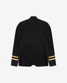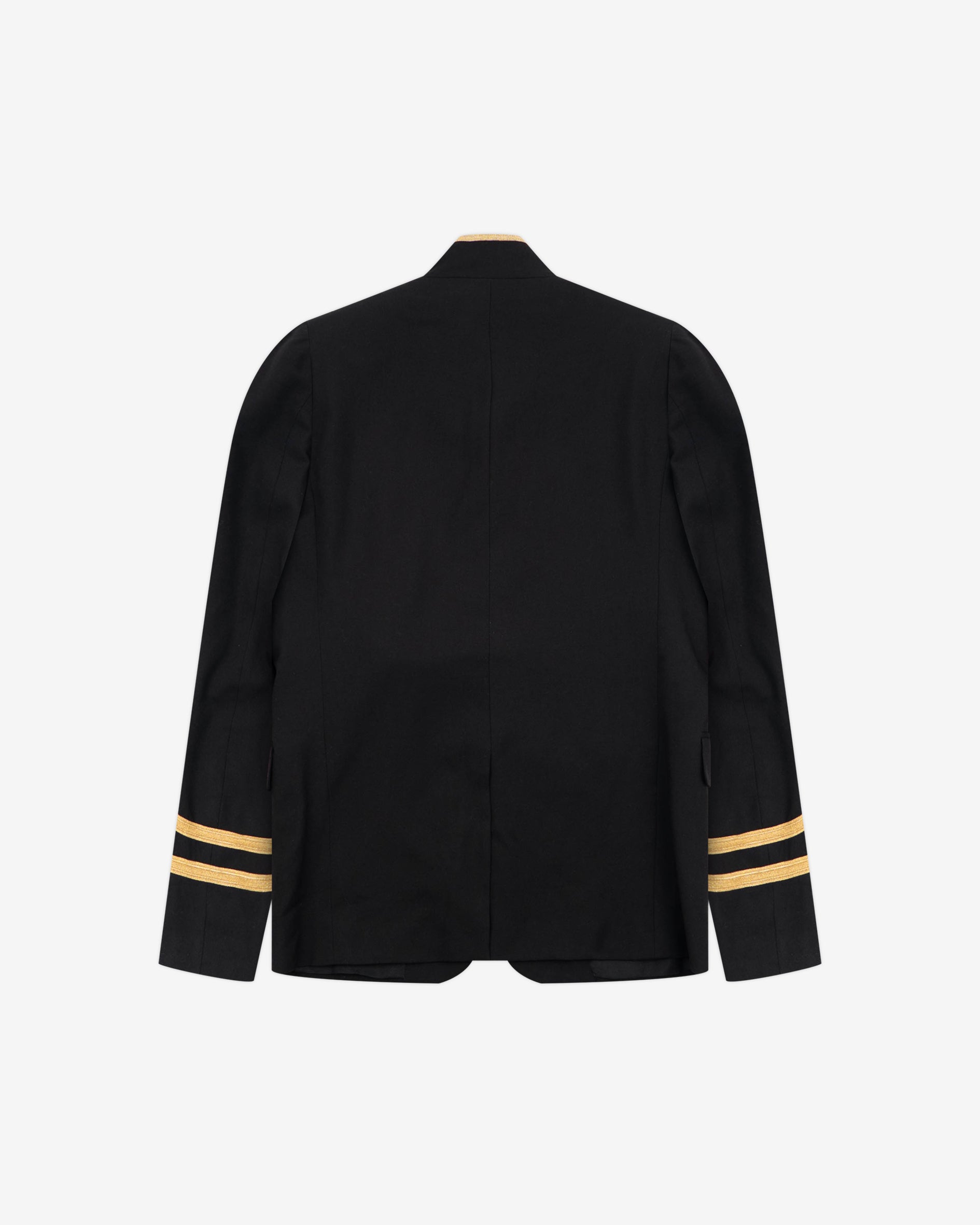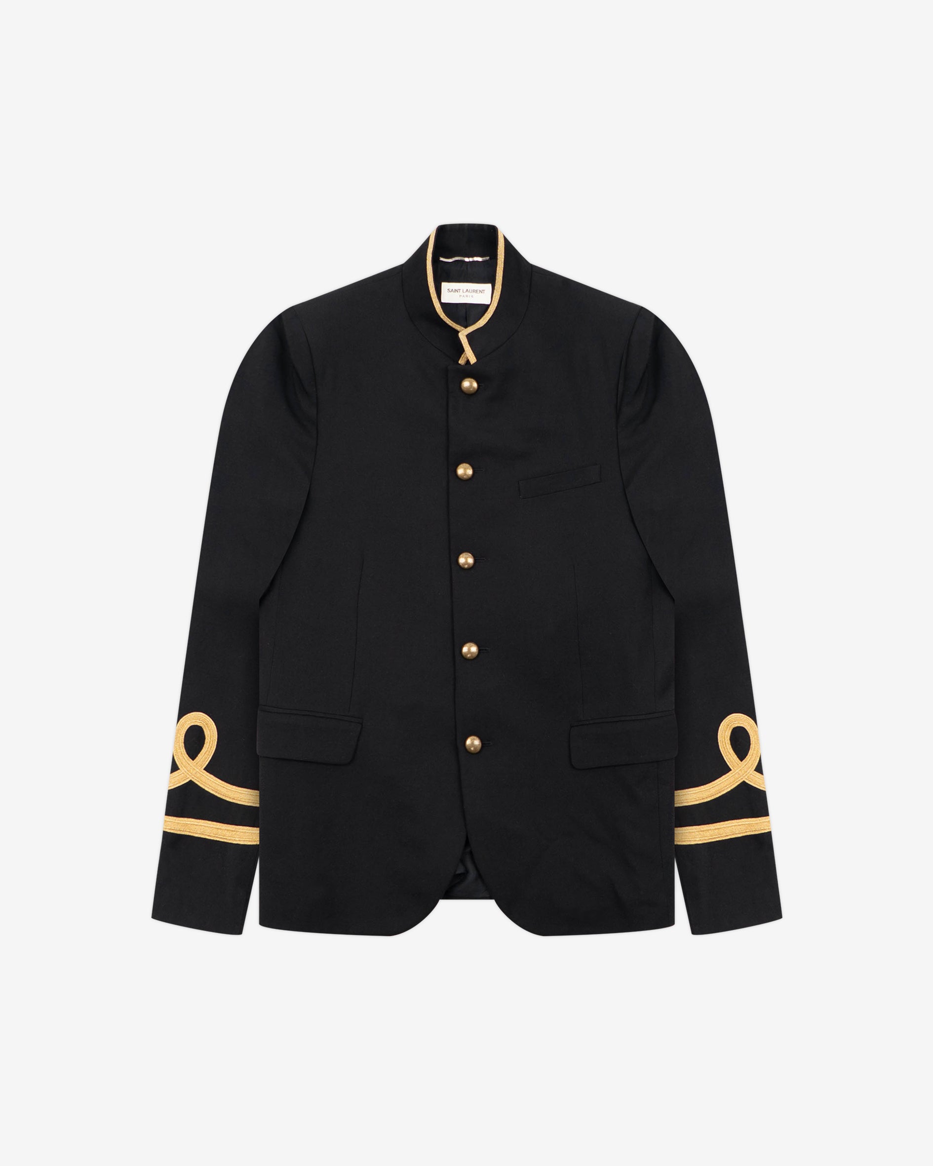 Napoleon style jacket with gold military trim and stand-up notch collar.