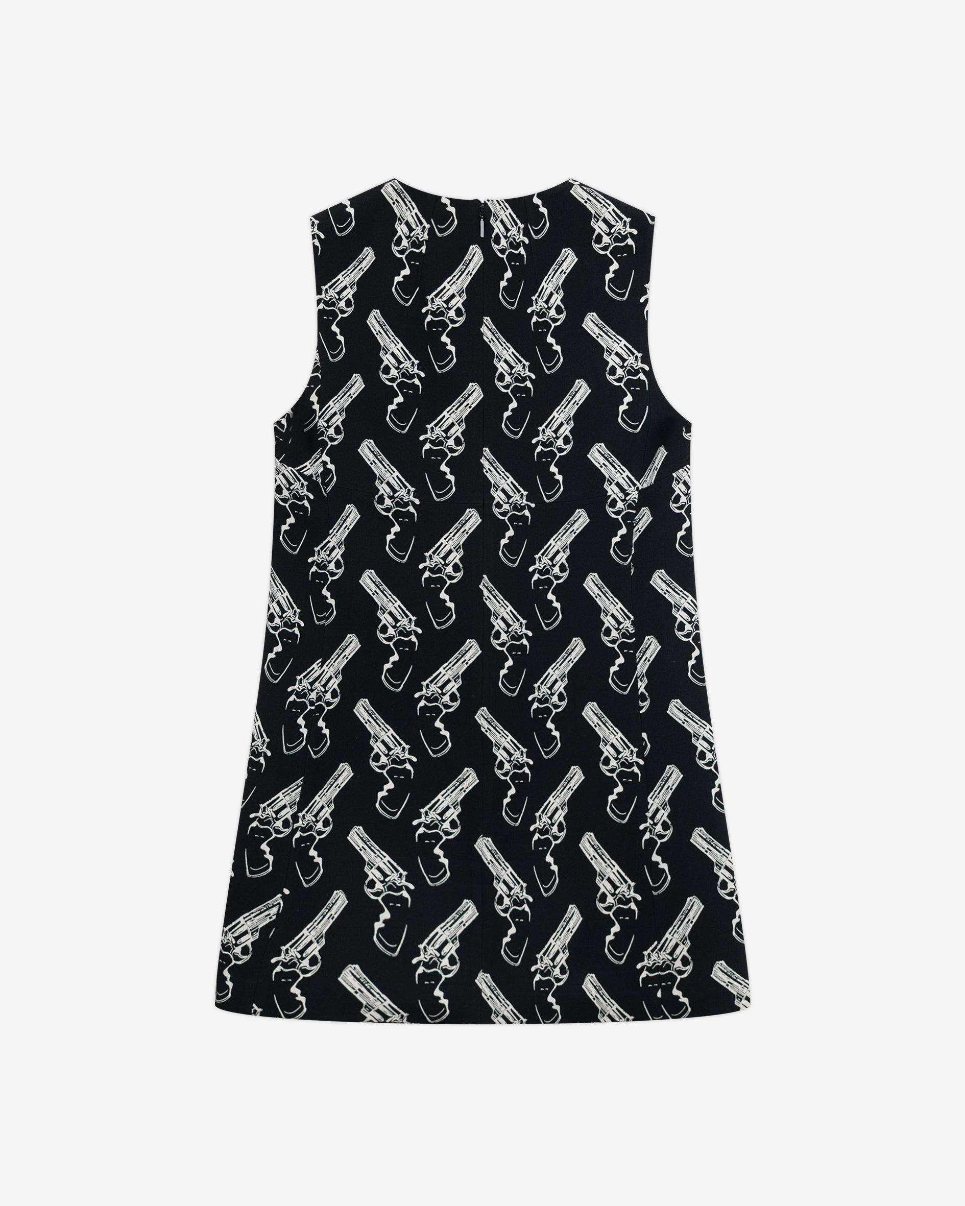 Stunning shift style sleeveless mini dress in black & white print throughout. Has a subtle A-line silhouette, round neck, front slash pockets, back zip and hook closure.