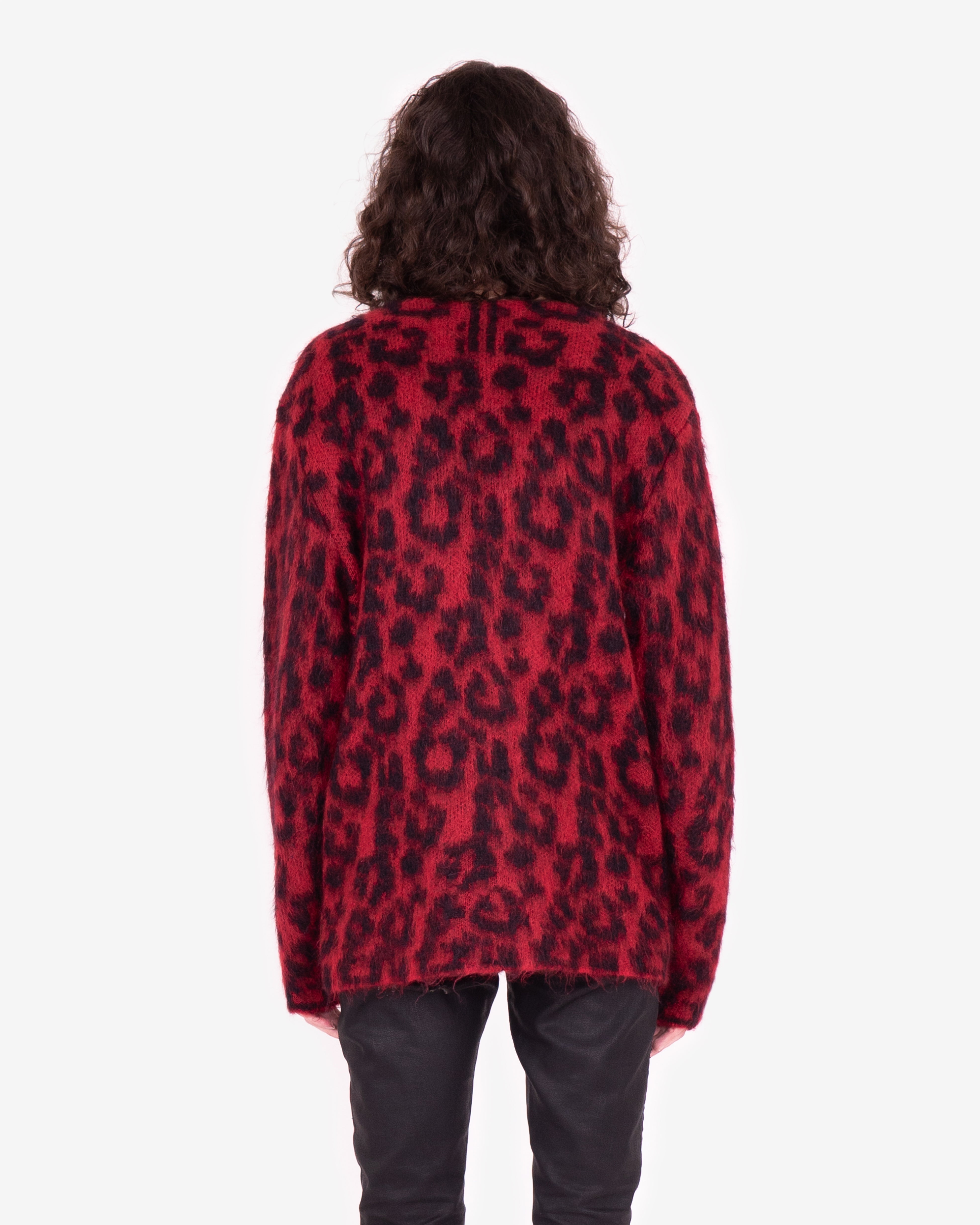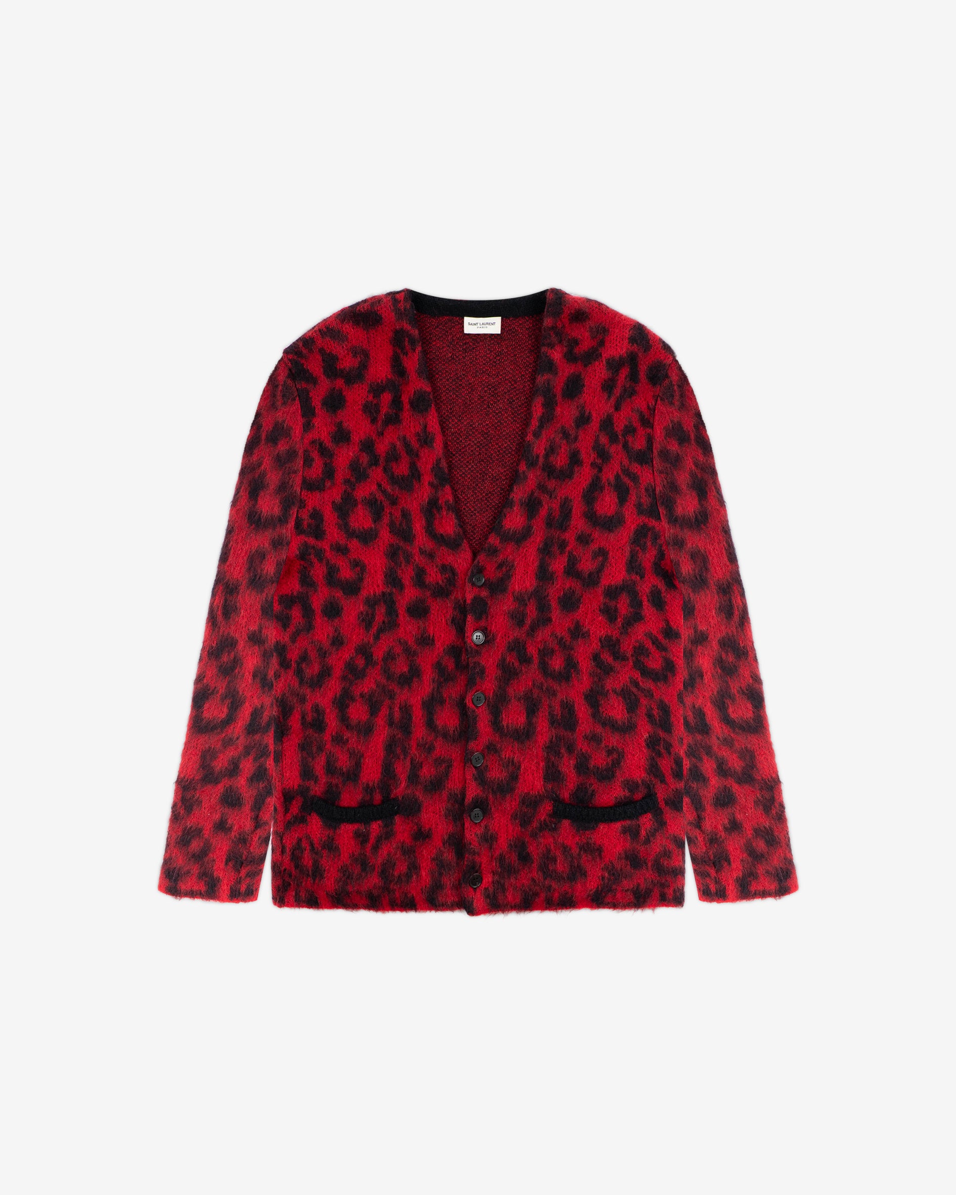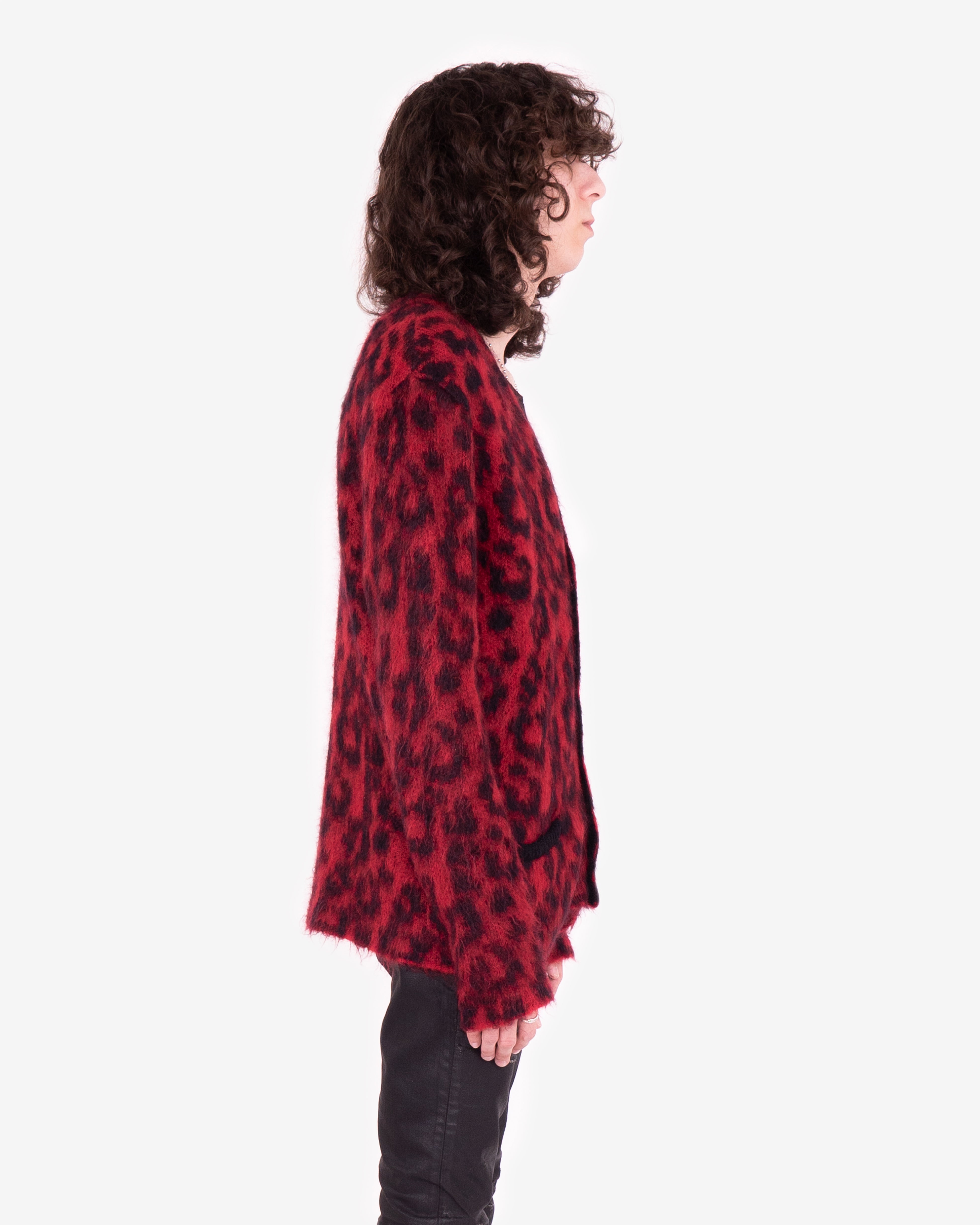Oversized mohair leopard cardigan with two front pockets and button closure.