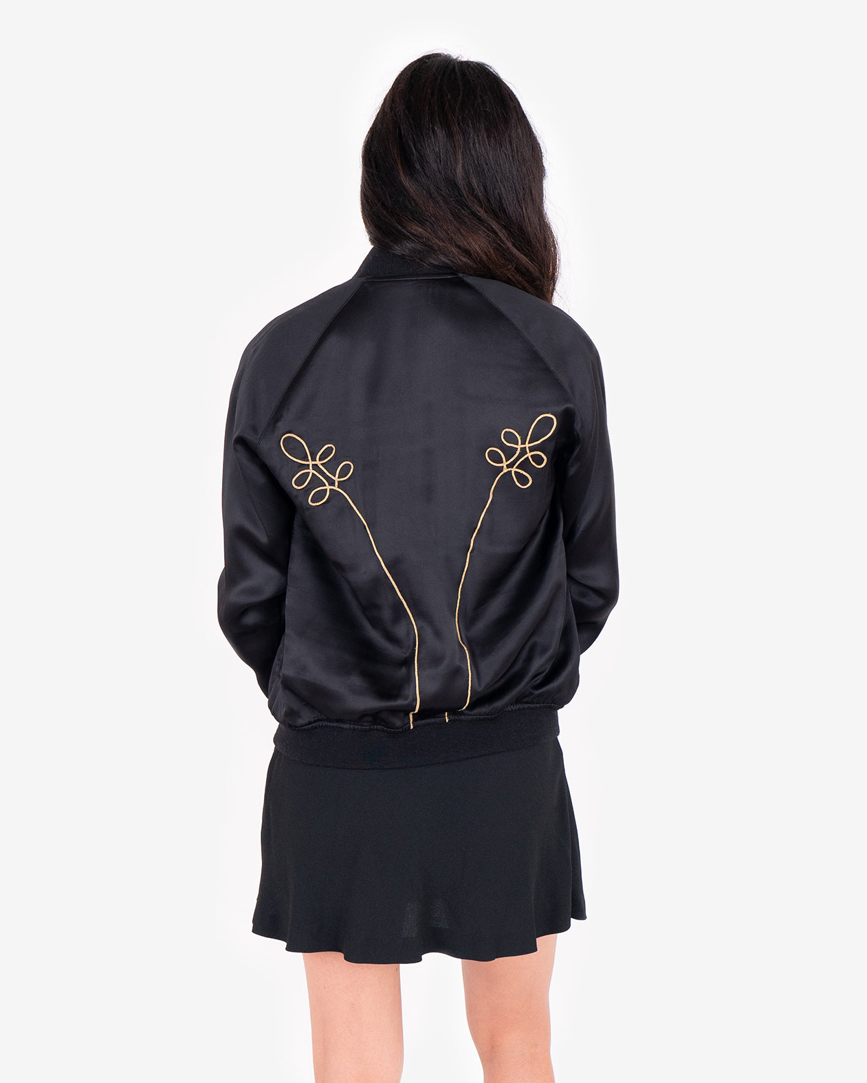 Unique rendition of the iconic teddy jacket, featuring Napoleon style gold ribbon trim accents on front and back. Button down front clasp closure, and wool collar, cuffs and waist. From the psych rock collection - jackets from this season in particular run approximately 2 sizes smaller.