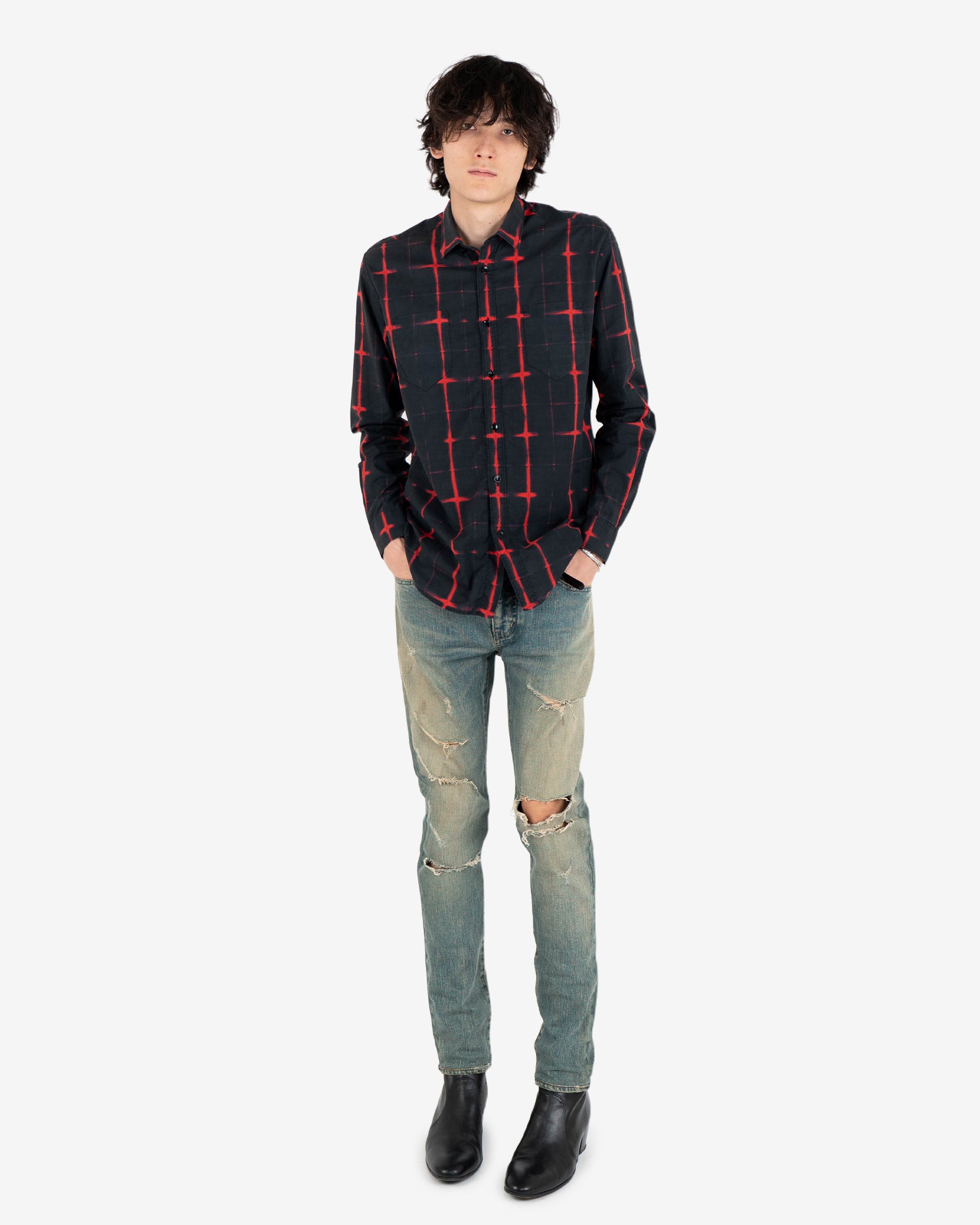 Red checkered button up shirt.
