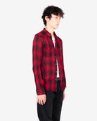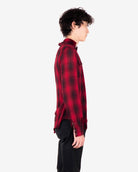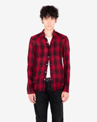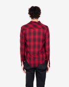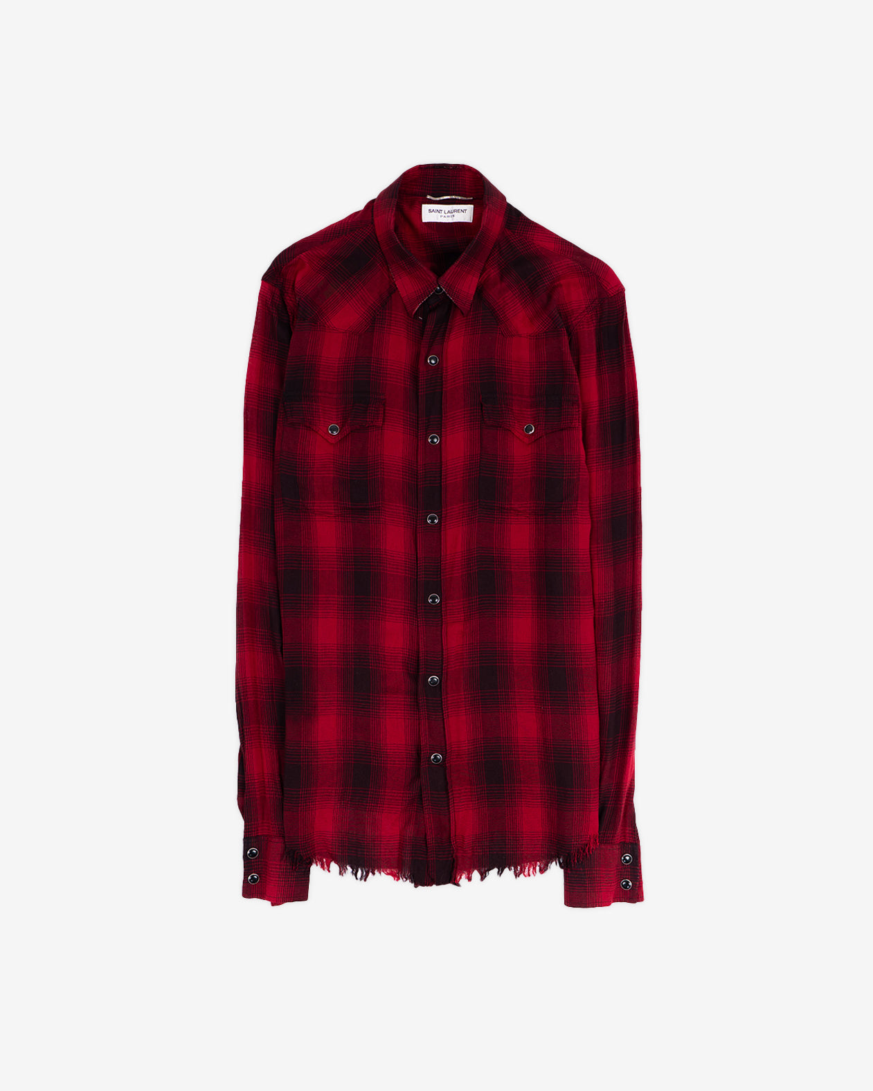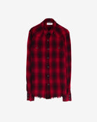 Signature western flannel shirt with button closure in a beautiful dark red color with a black gradient. Finished with a distressed hem. Fits true to size.