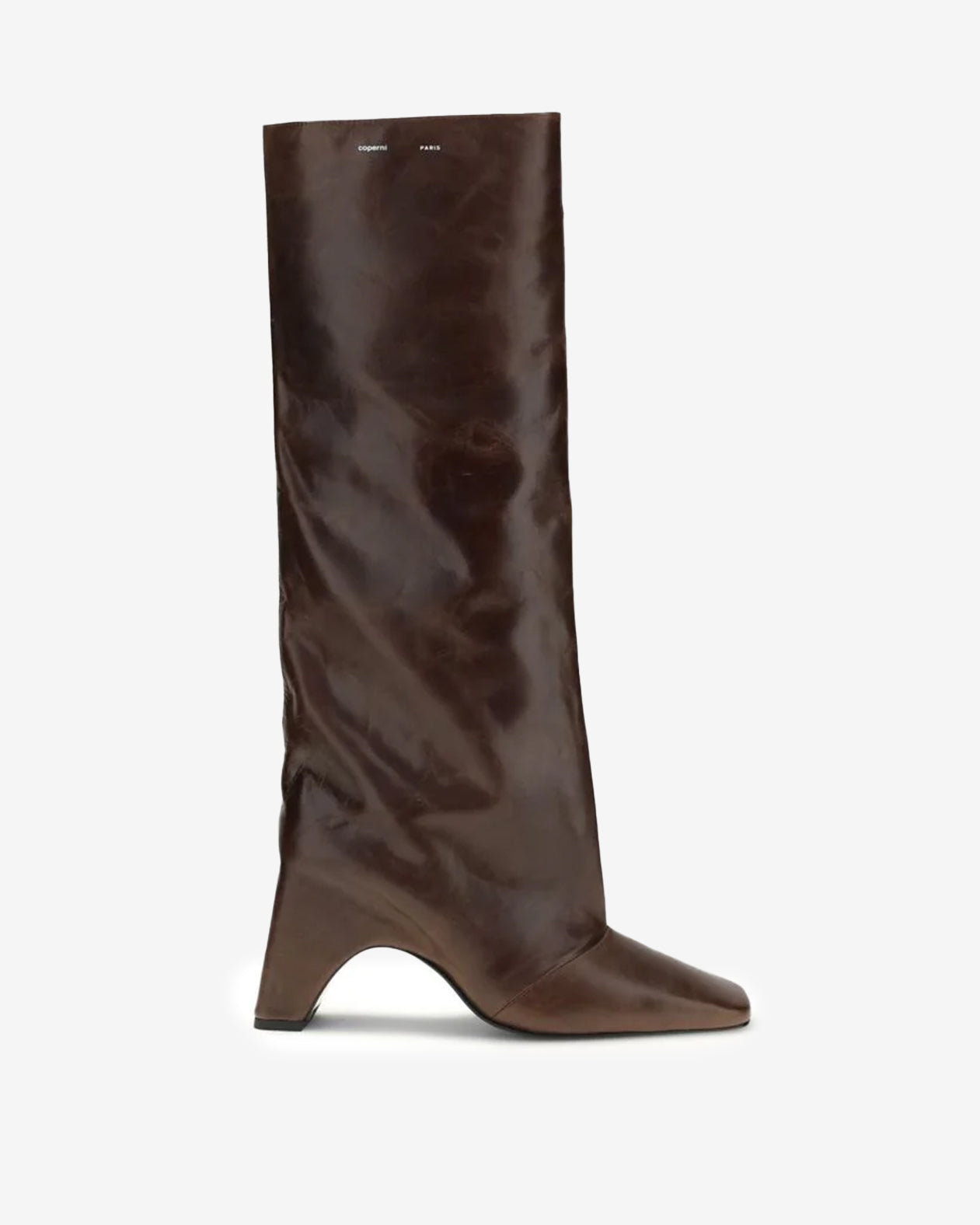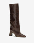 Elegant minimal boot with square toe and wide riding style shaft. "Bridge" name is derived from the shoe's signature eye-catching arched sole.