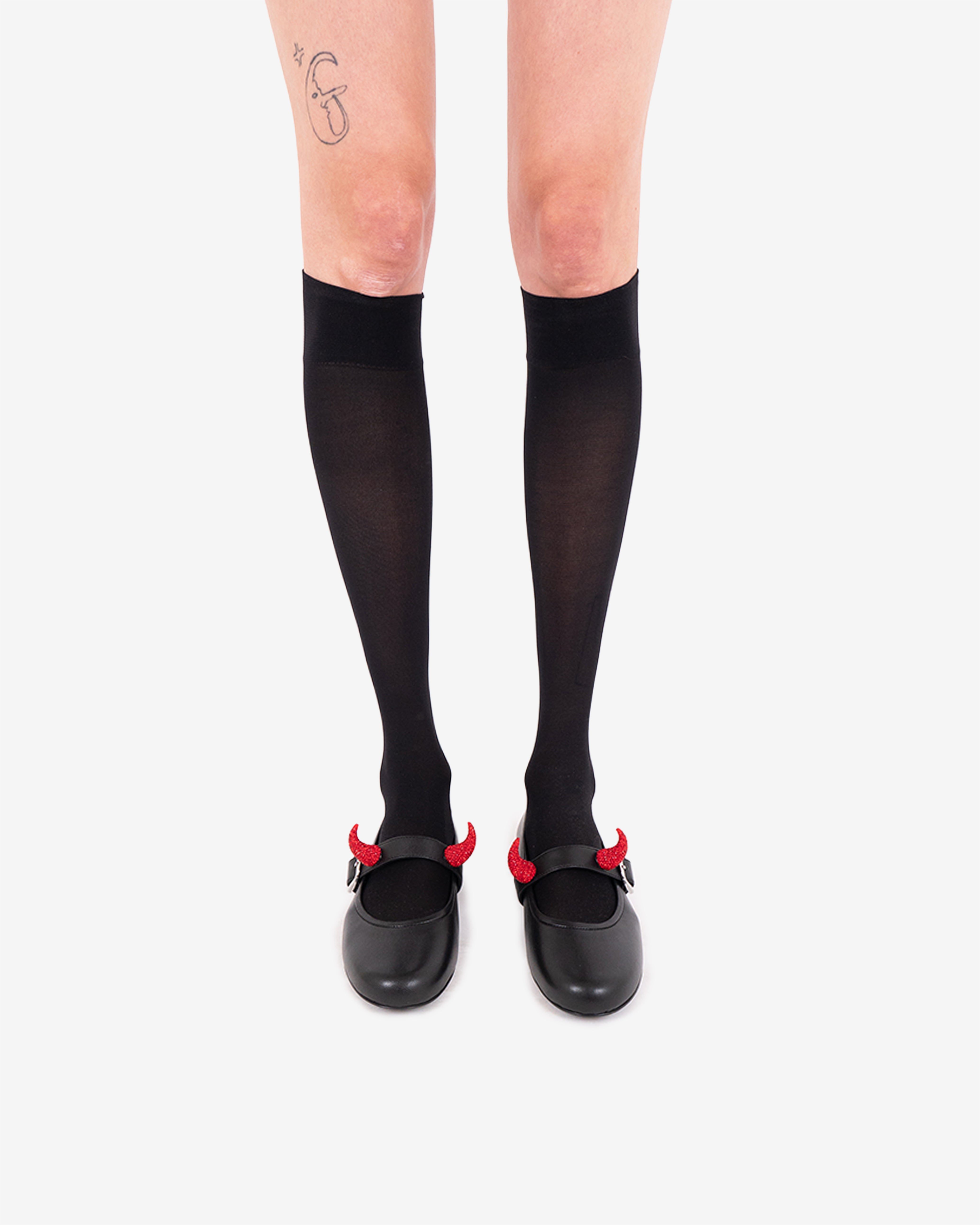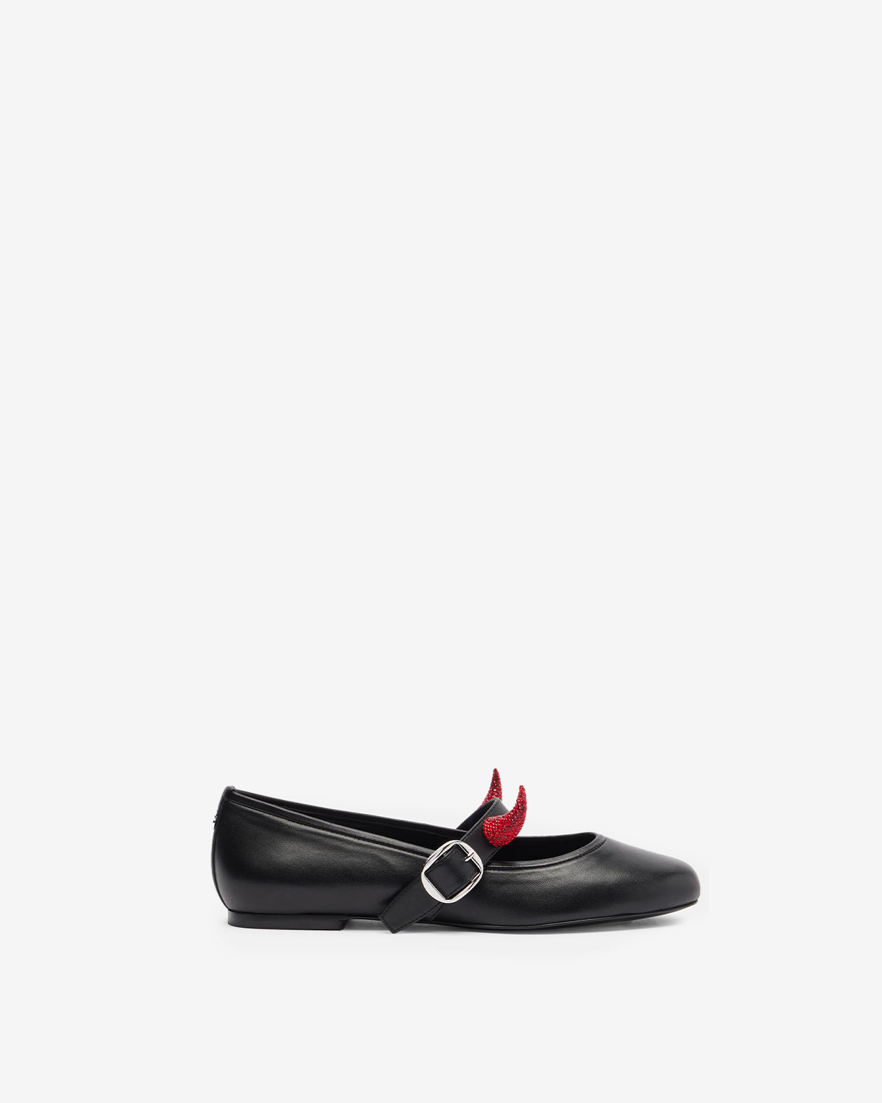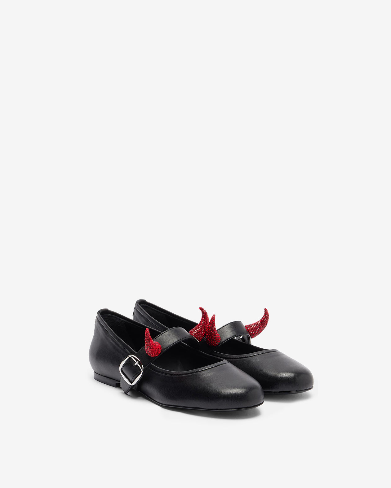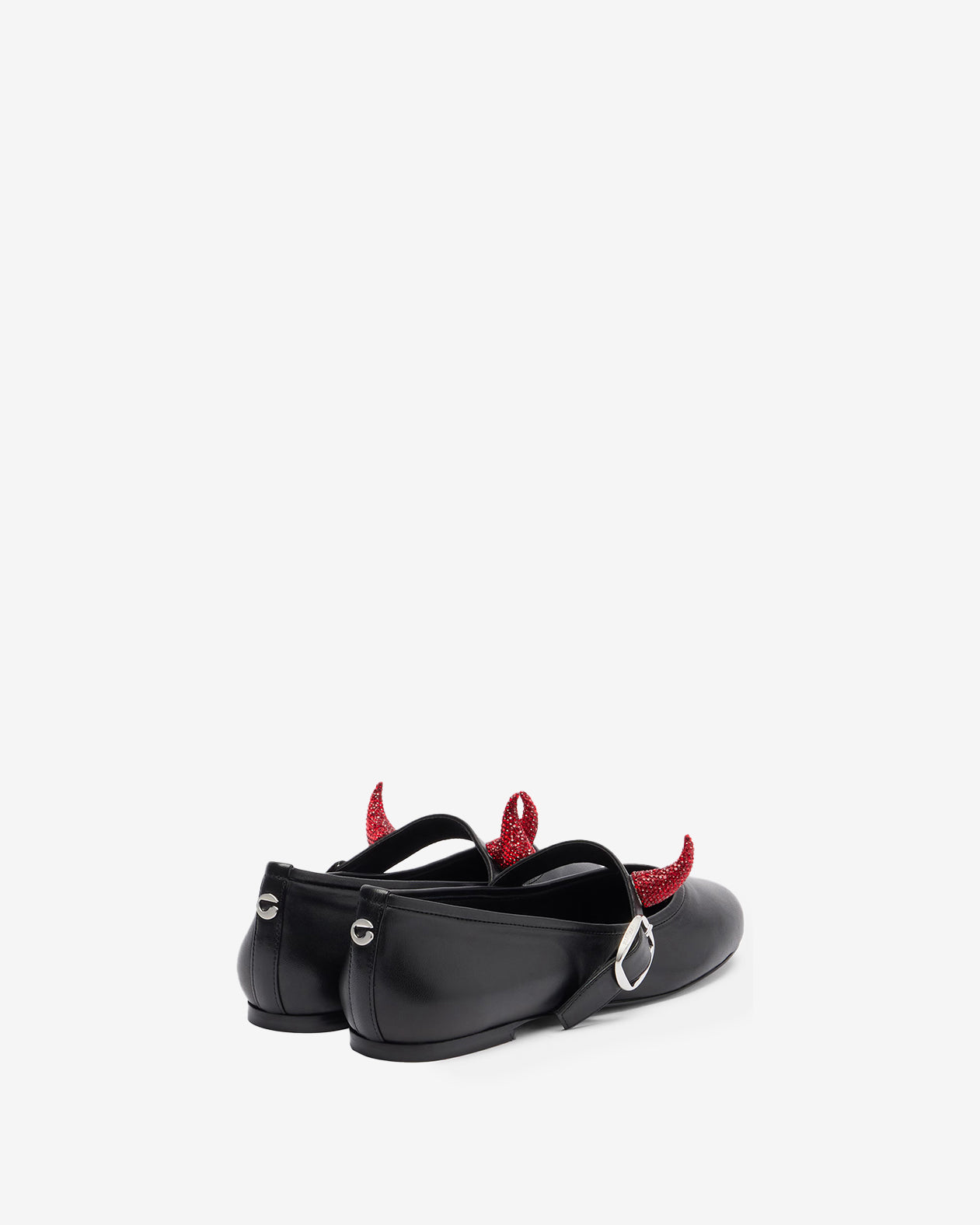 Crystal-studded red horn ballerinas featuring silver buckled side strap made in collaboration with Disney.