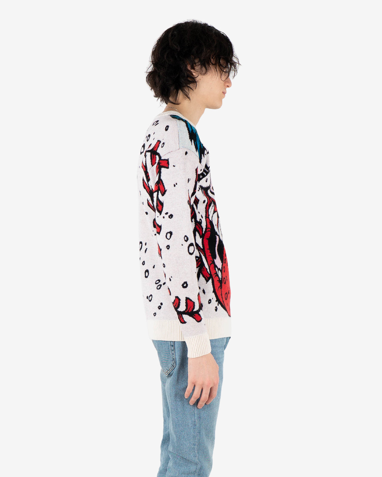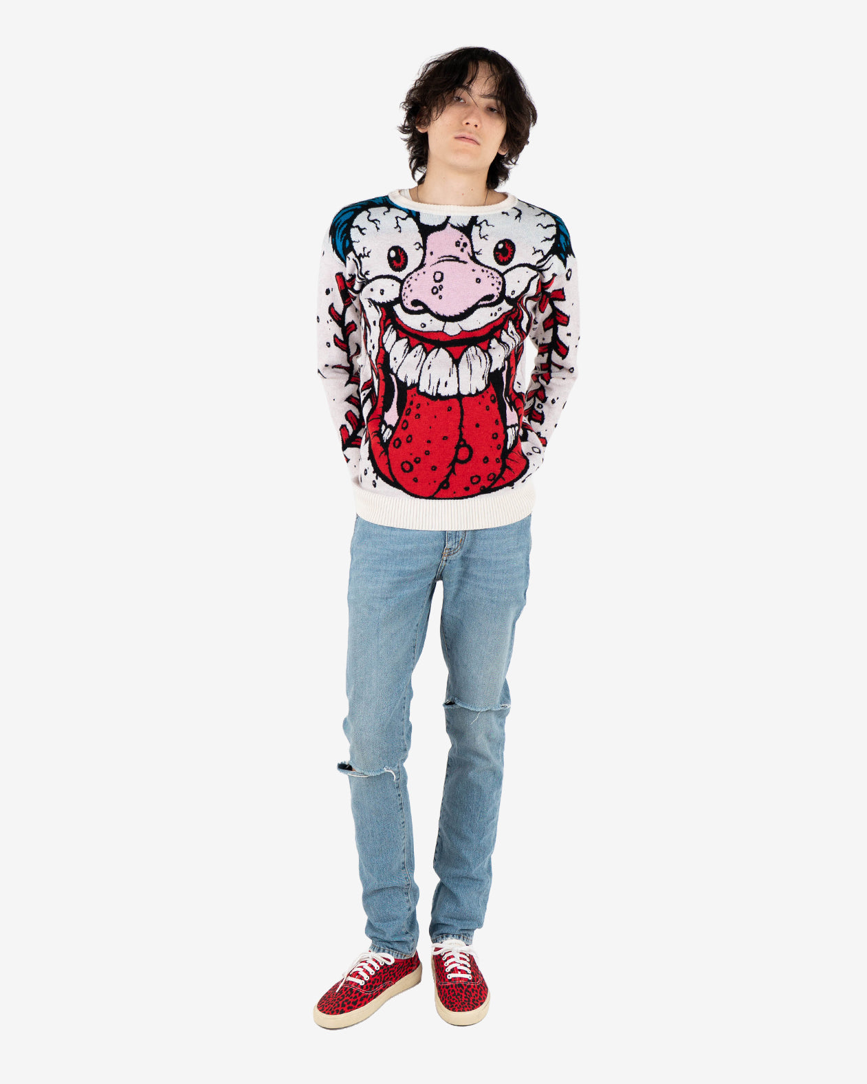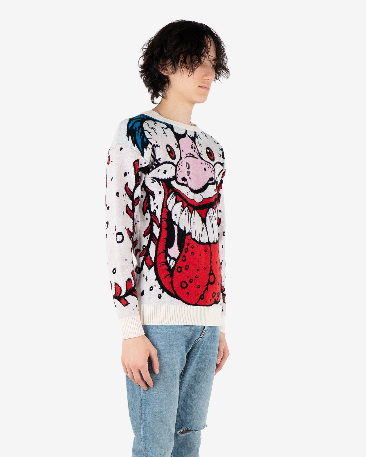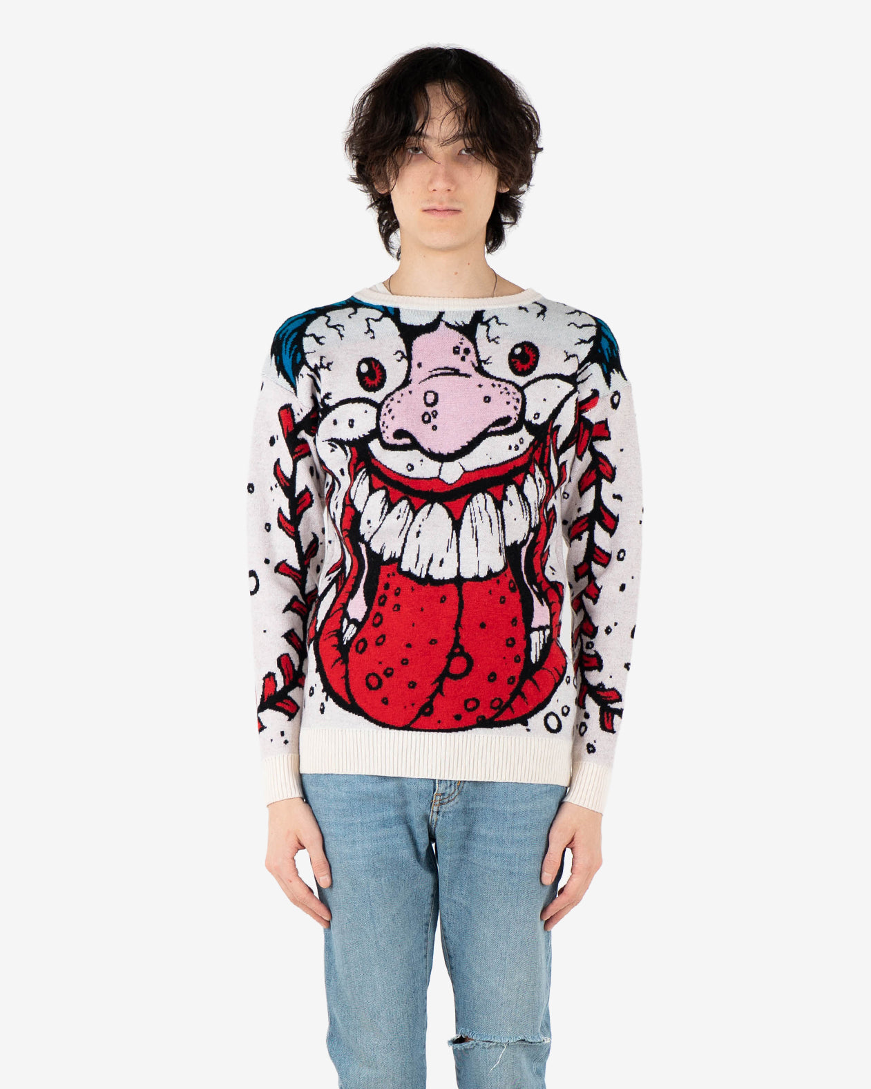 This heavy, soft and cozy wool sweater might be just the right piece to scare people and look good at the same time. Features a "Madballs" Monster Printed Wool.