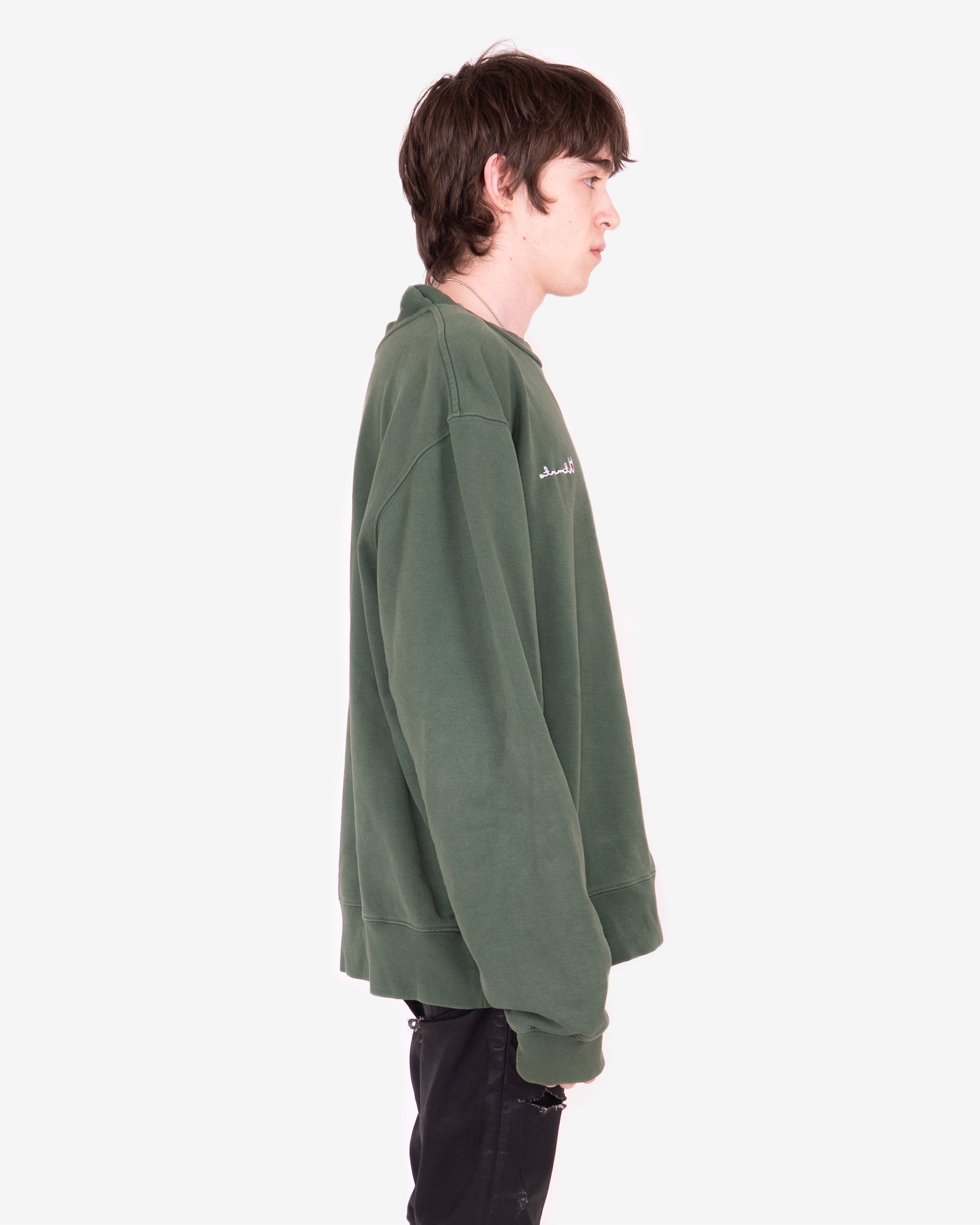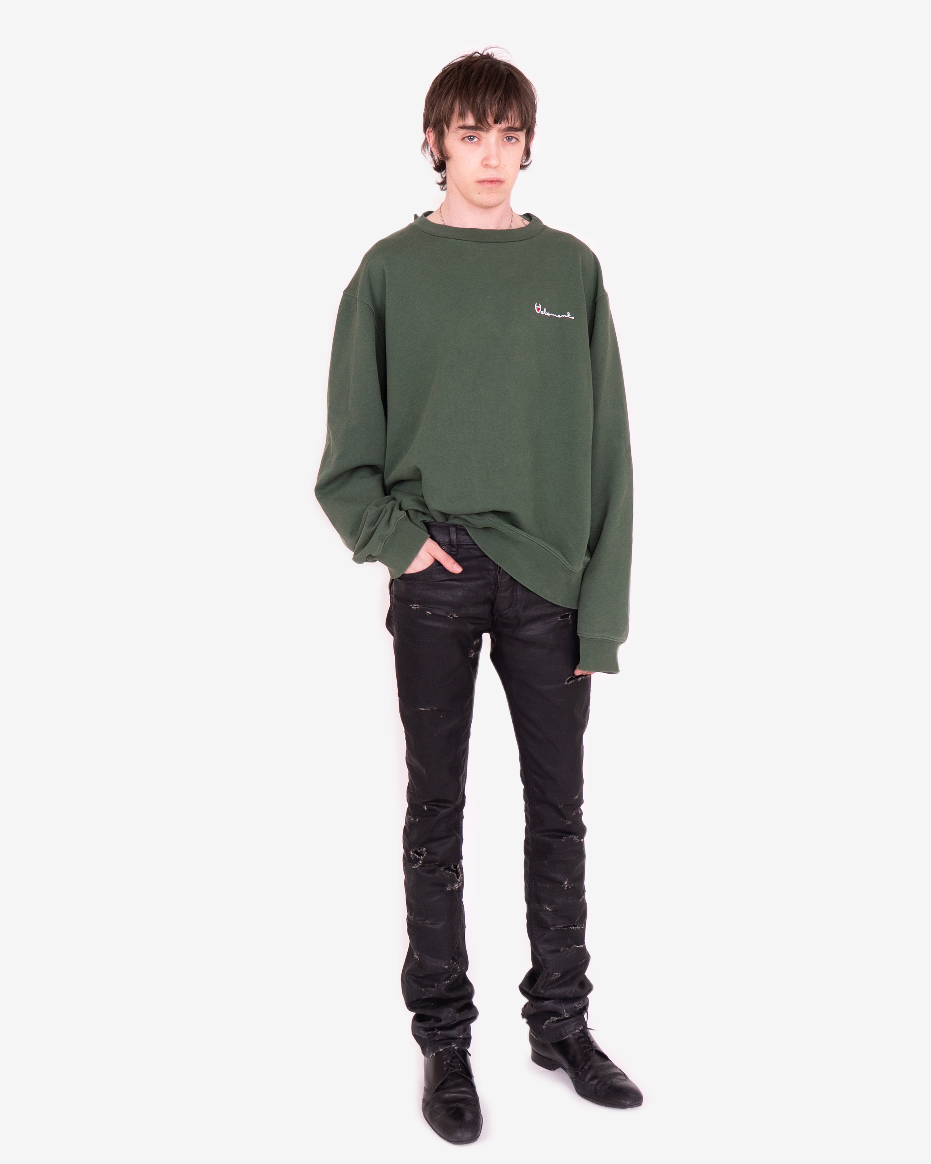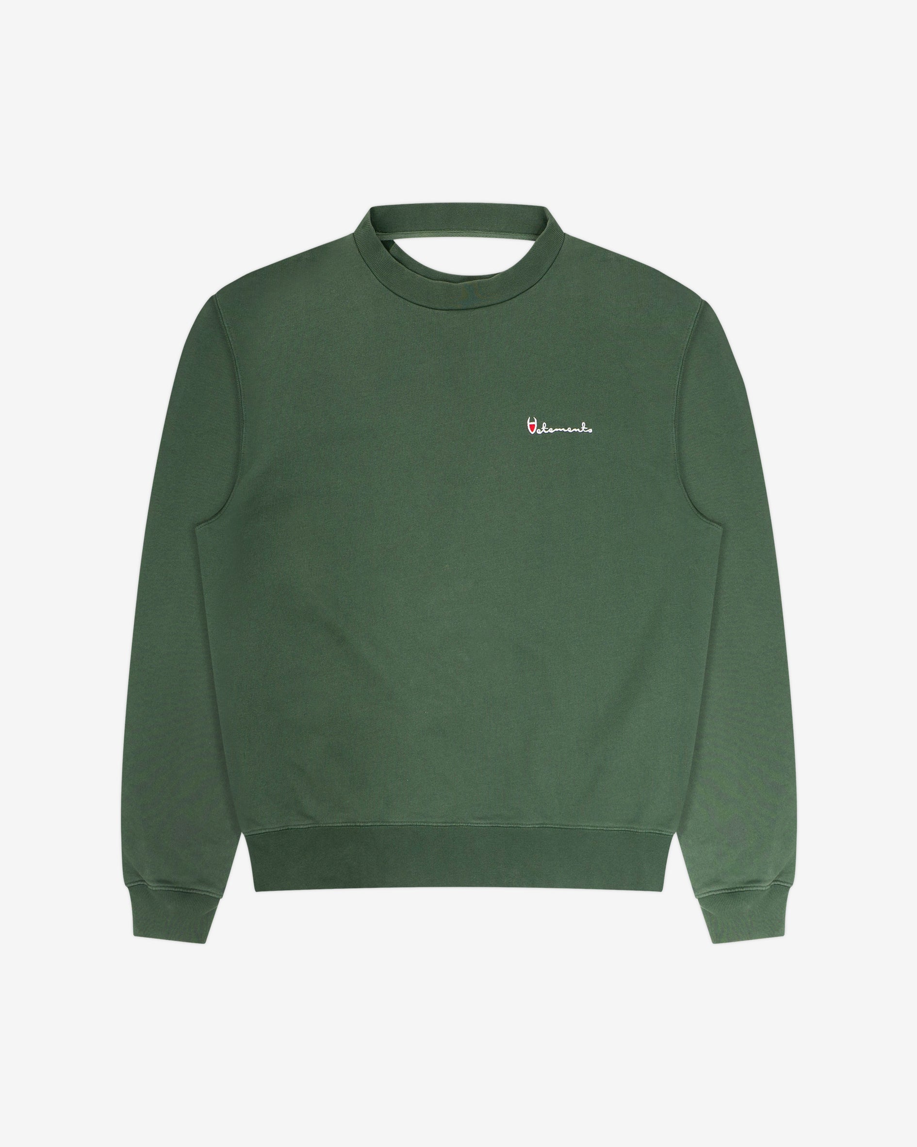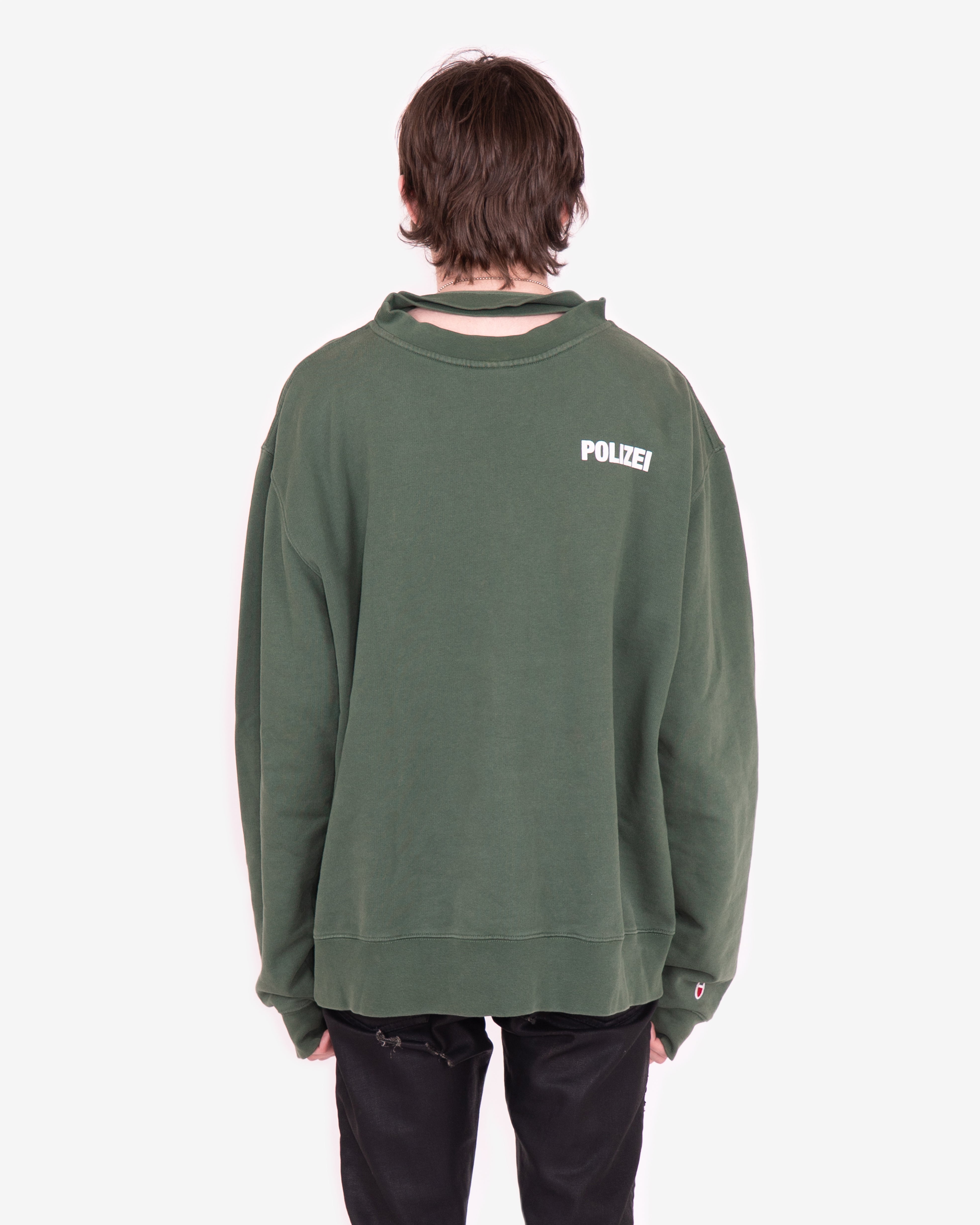 Iconic sweatshirt from the peak era of Vetements, easily one of Demna's best collections for the brand. Can be worn on both sides and comes with a detached double collar detail. Features "parody" Champion logo on one side, and German police logo on the other. Fit is very oversized, as is typical for the brand.