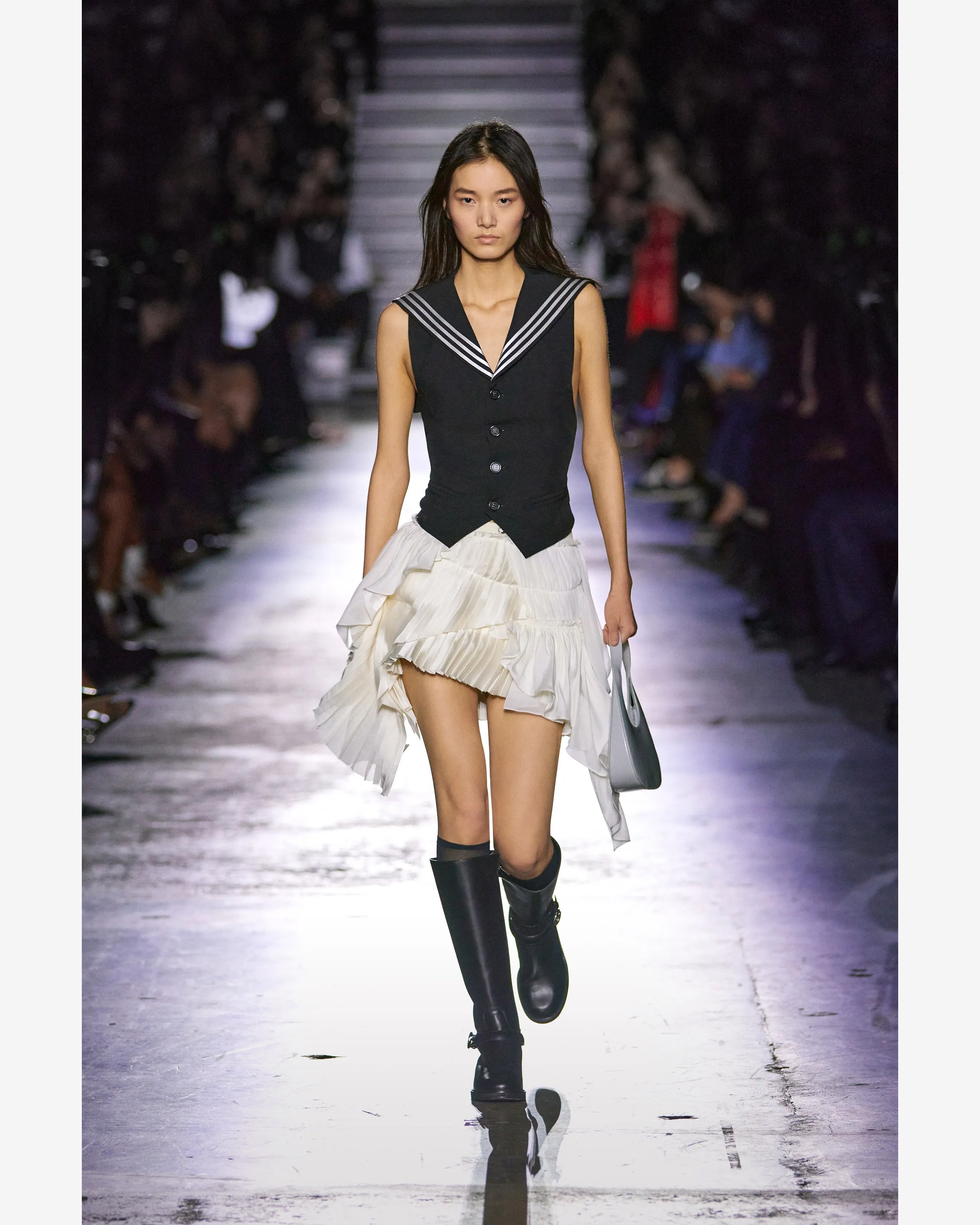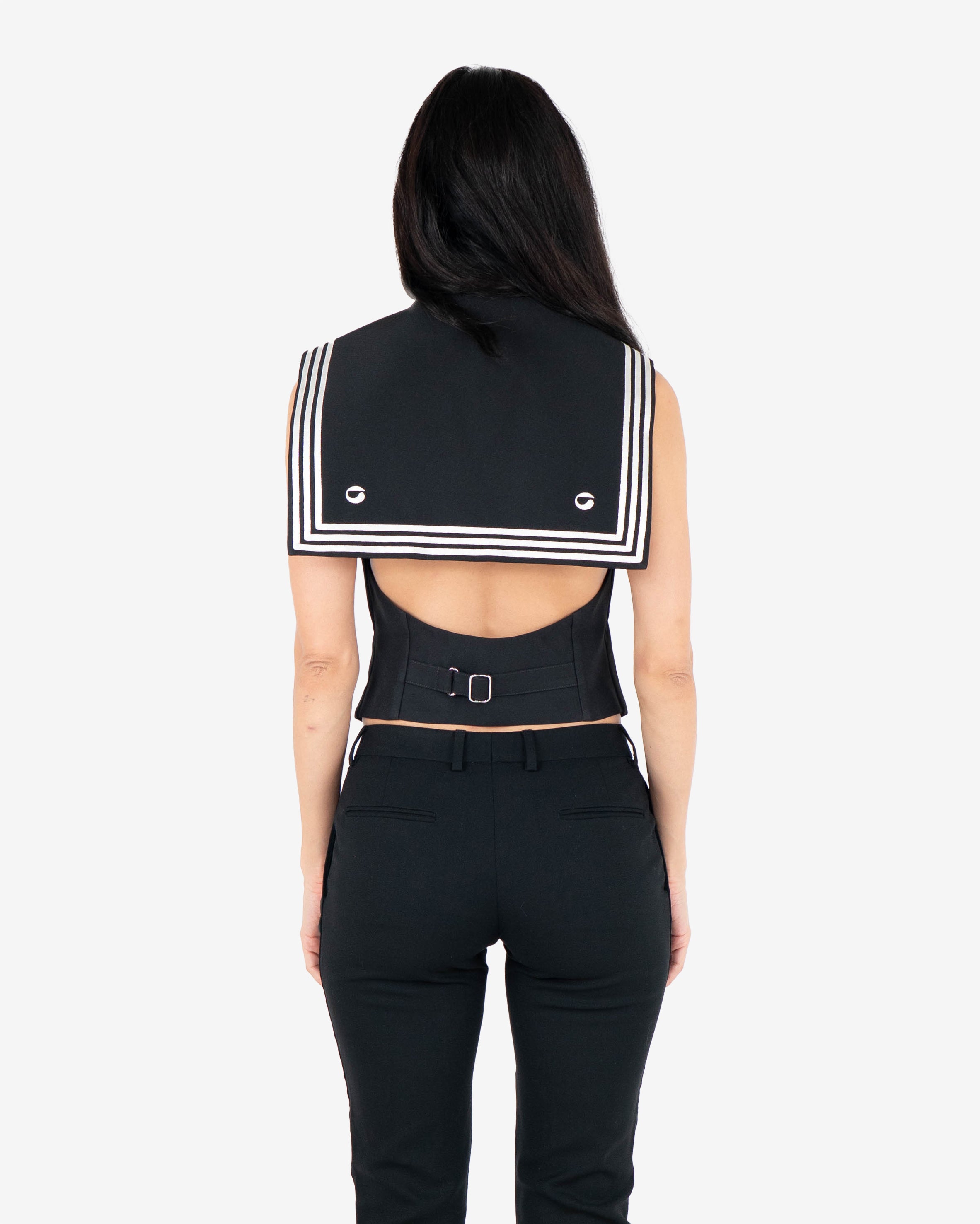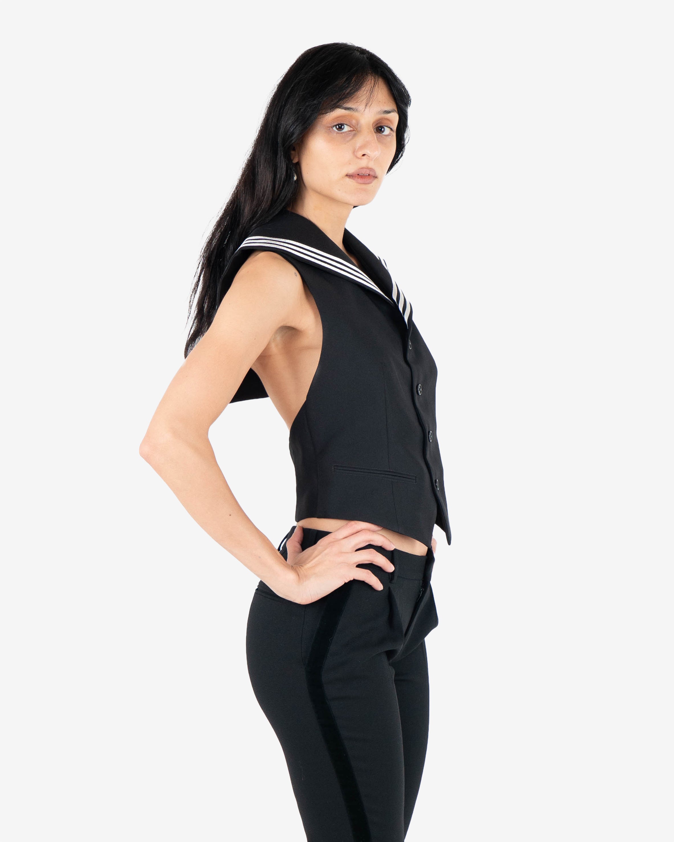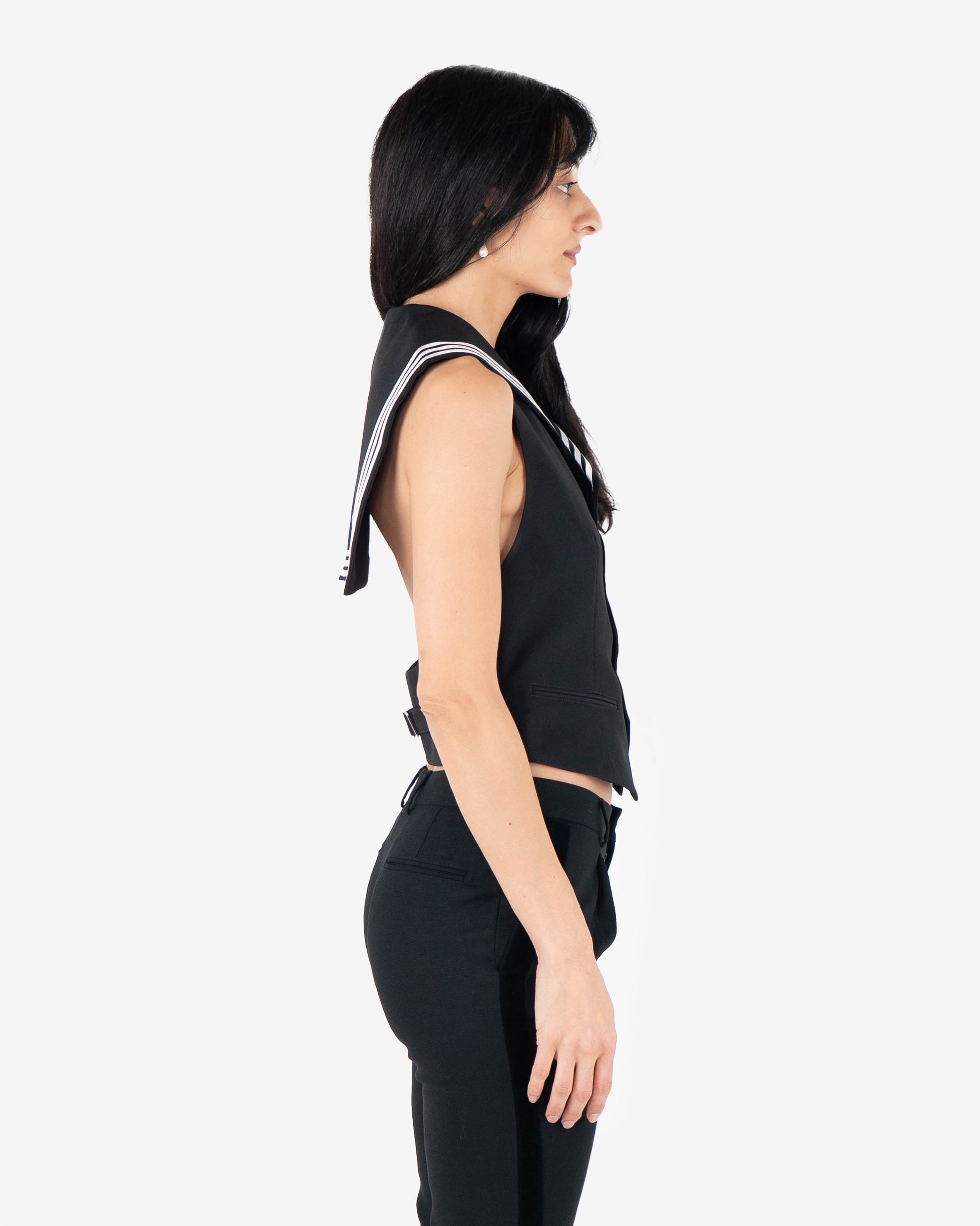 Black tailored sleeveless vest-style top featuring sailor collar with white triple stripe accent. Button-down front closure and two front welt pockets.