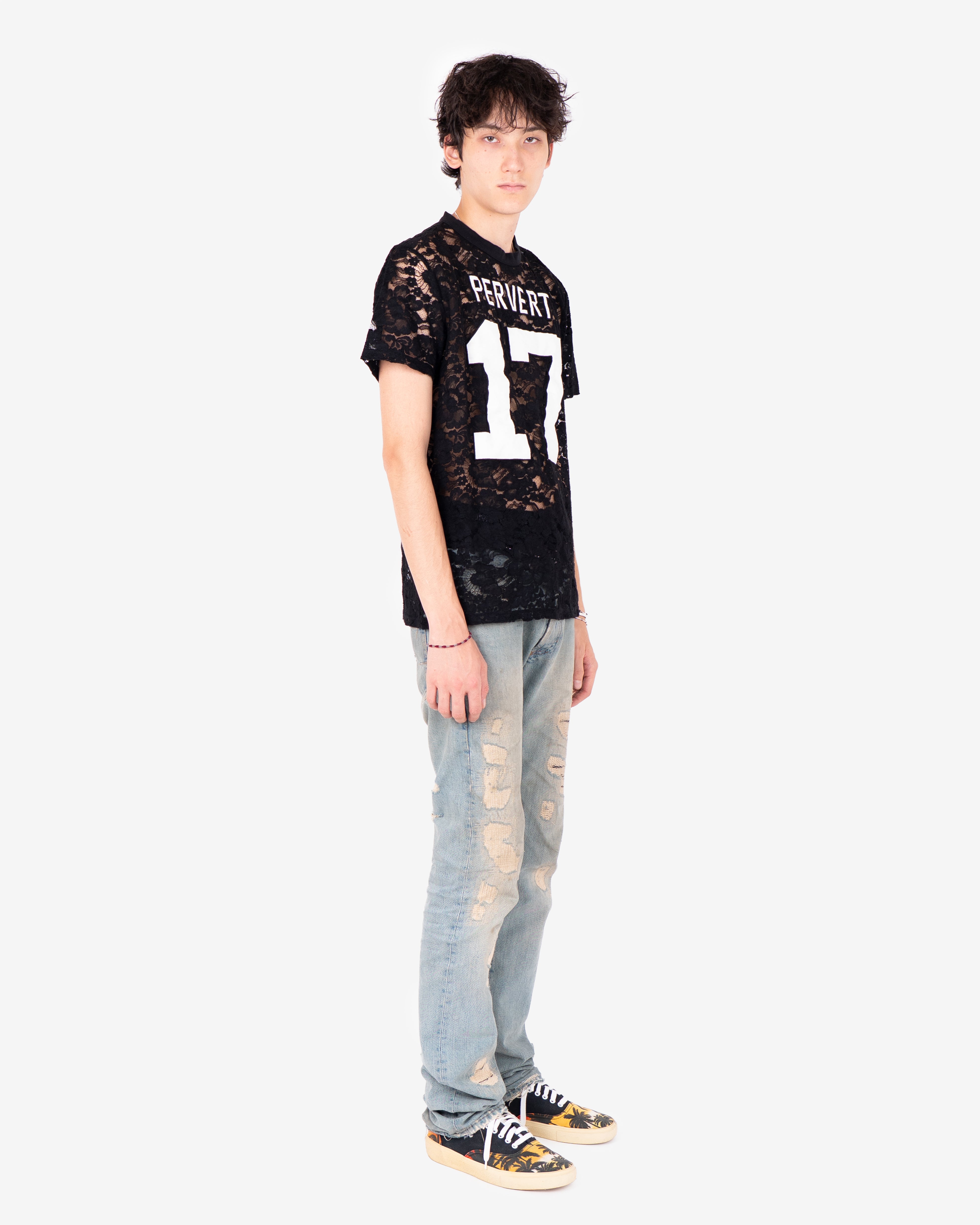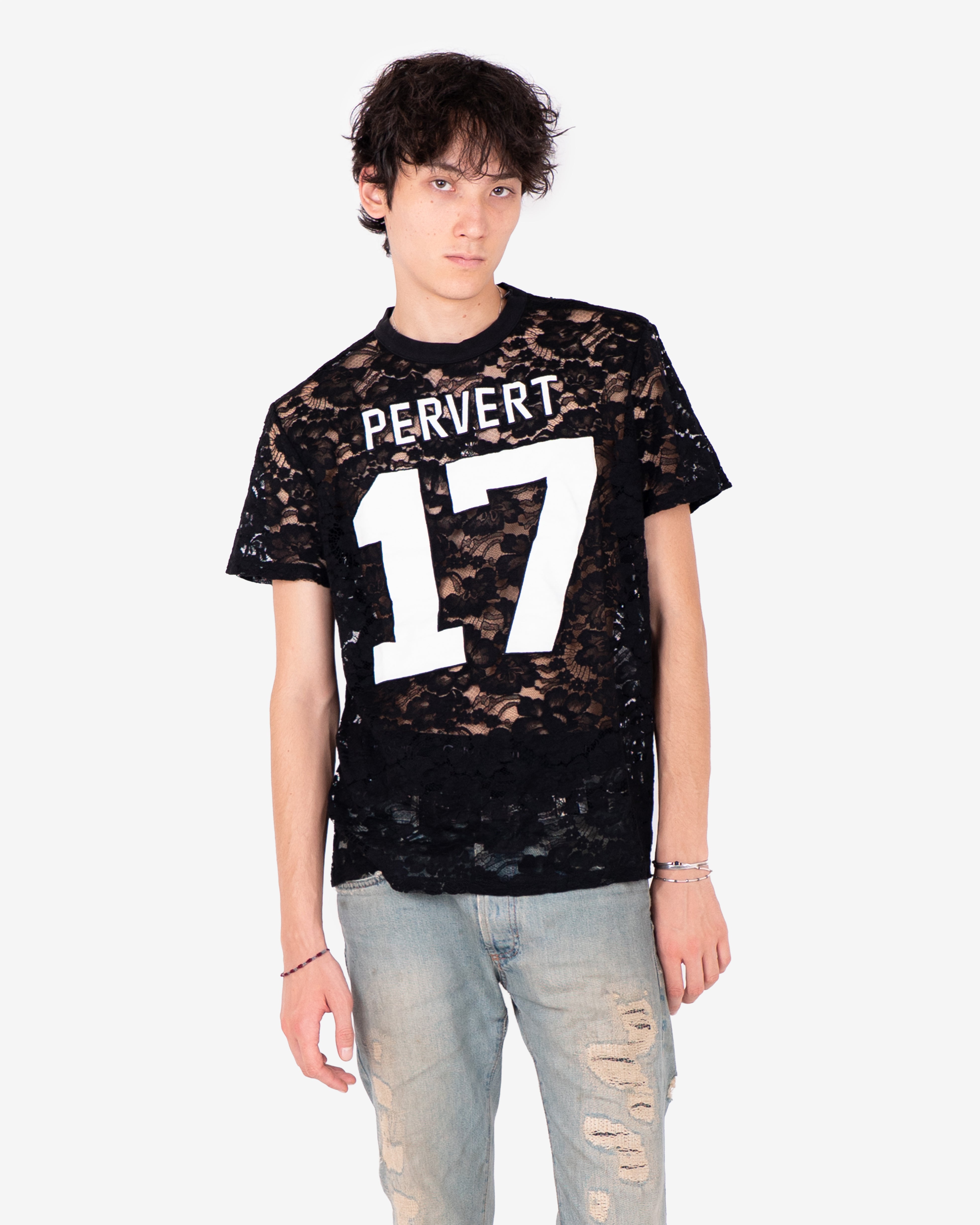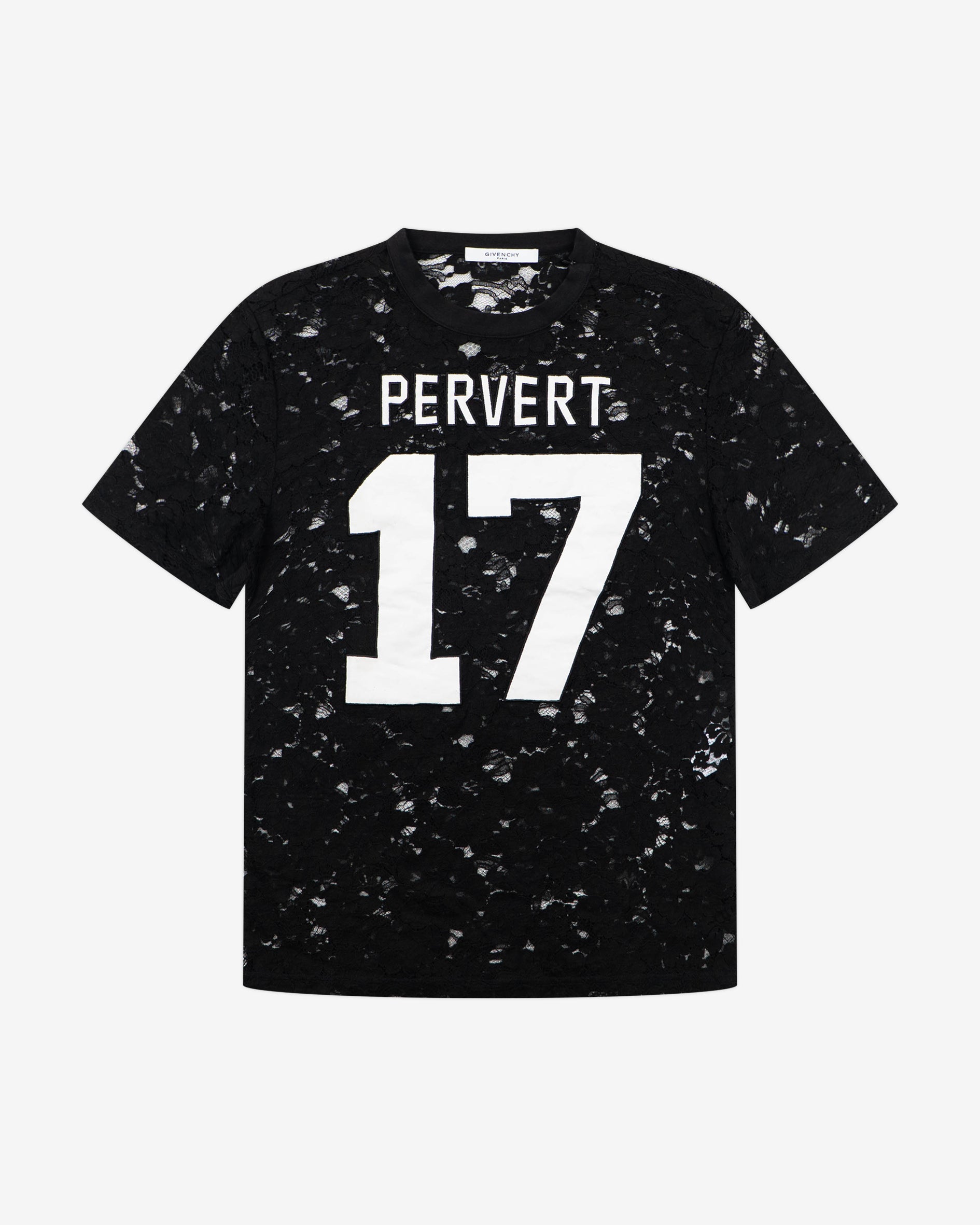Tisci's collector item lace jersey featuring varsity-style number and lettering on front.