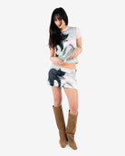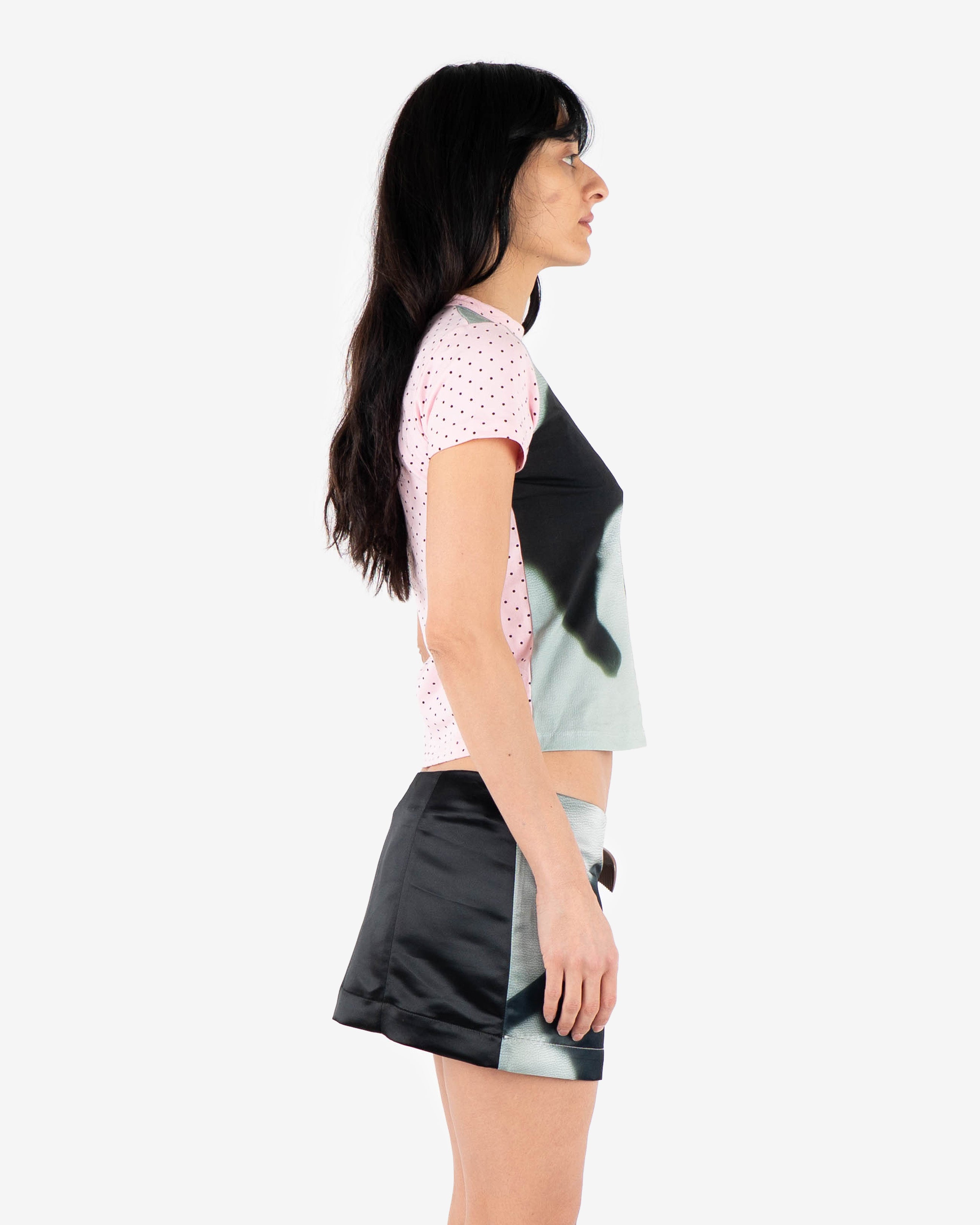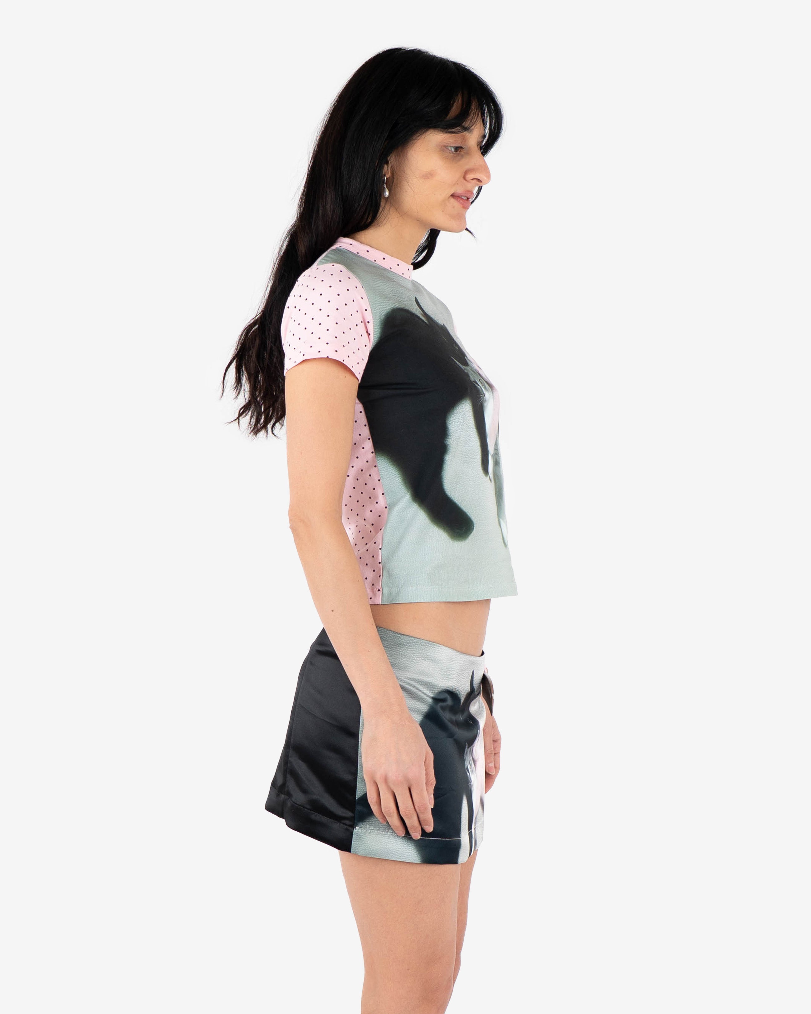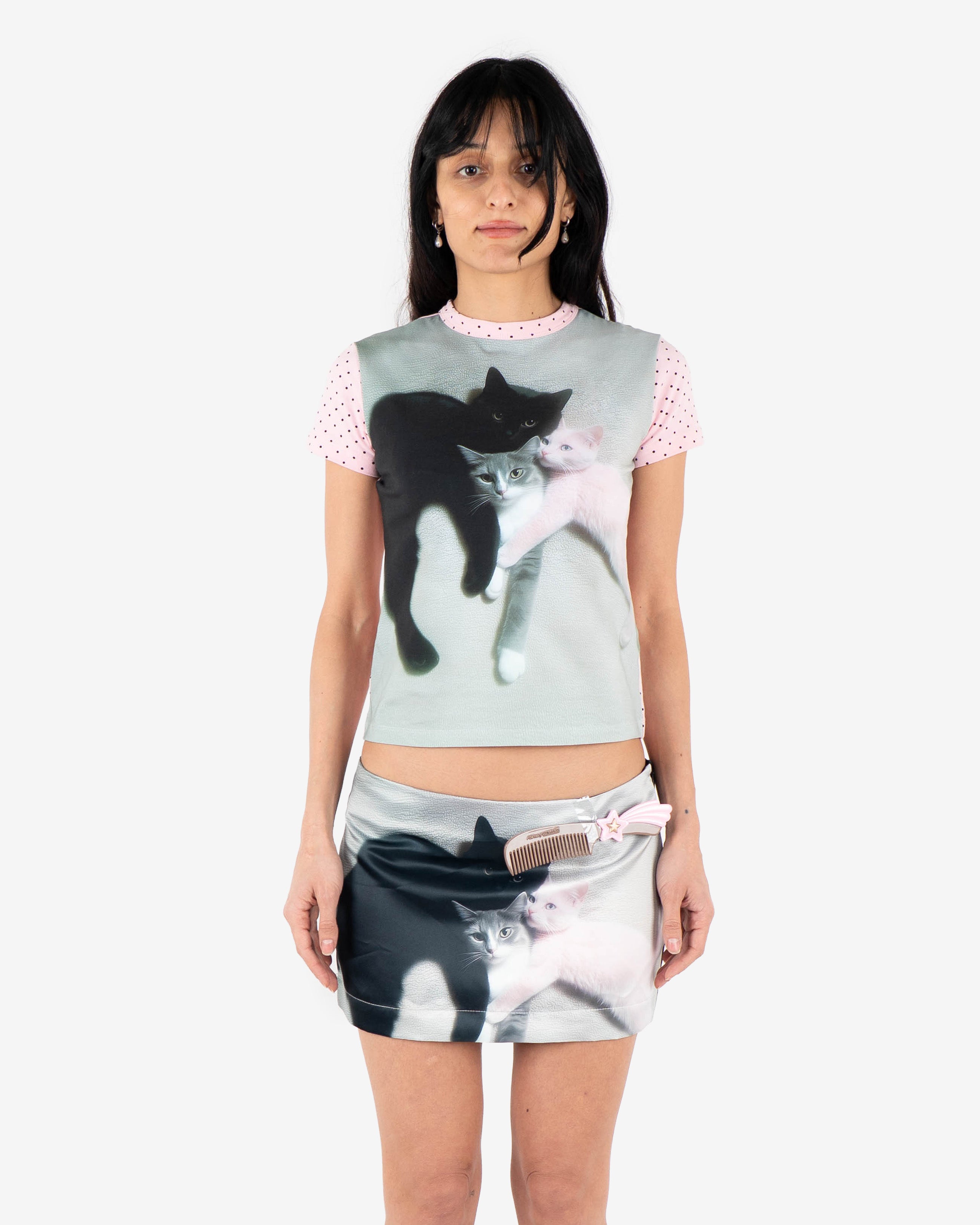 Eclectic “Kitten” print shirt with polka dot print on the back and sleeves.