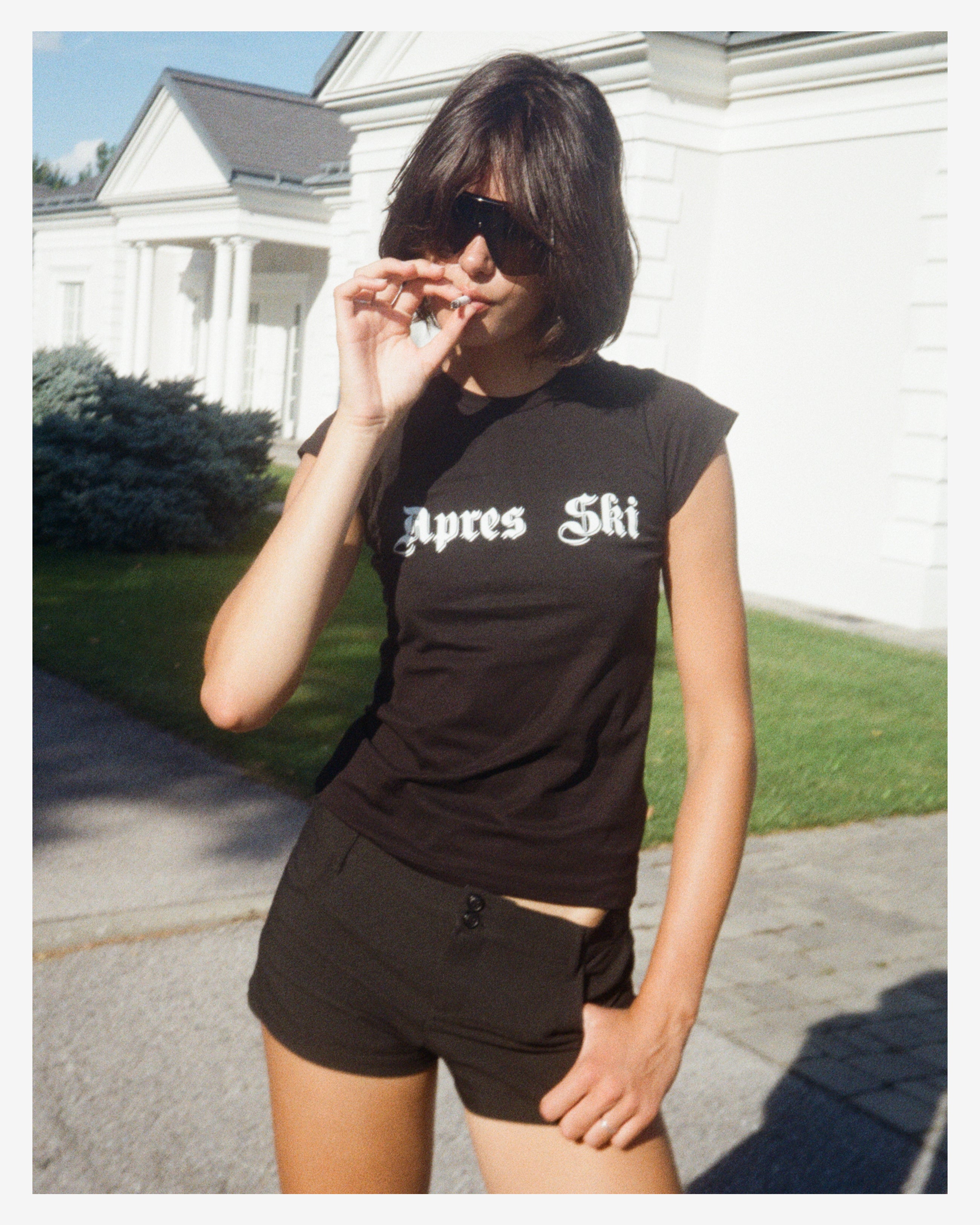Babydoll t-shirt featuring white gothic style "Apres Ski" print on chest.