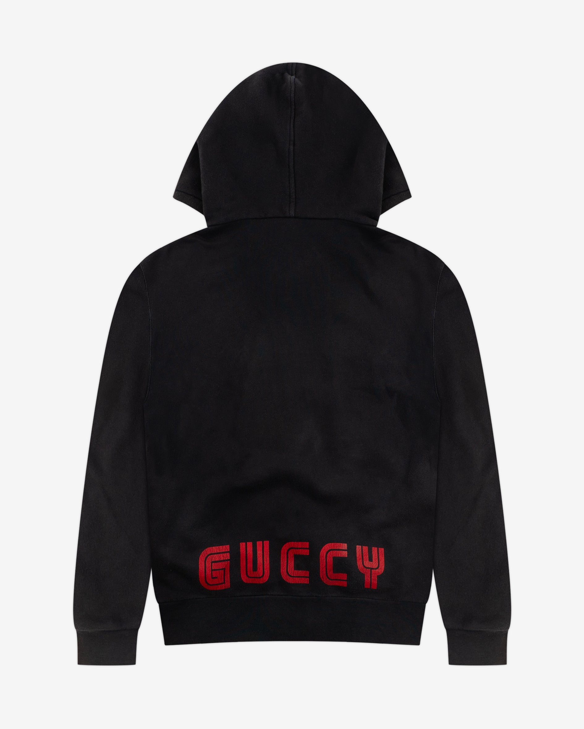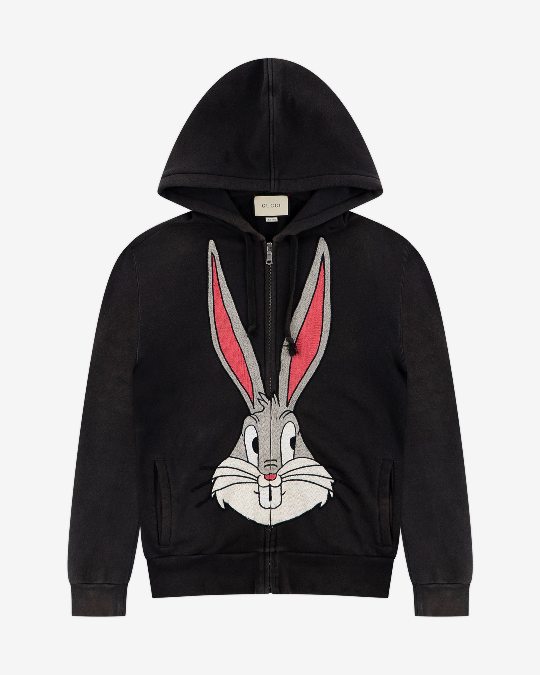 Gucci x Looney Tunes from featuring large, multicolored Bugs Bunny embroidery print on the front and "GUCCY" print on lower back.