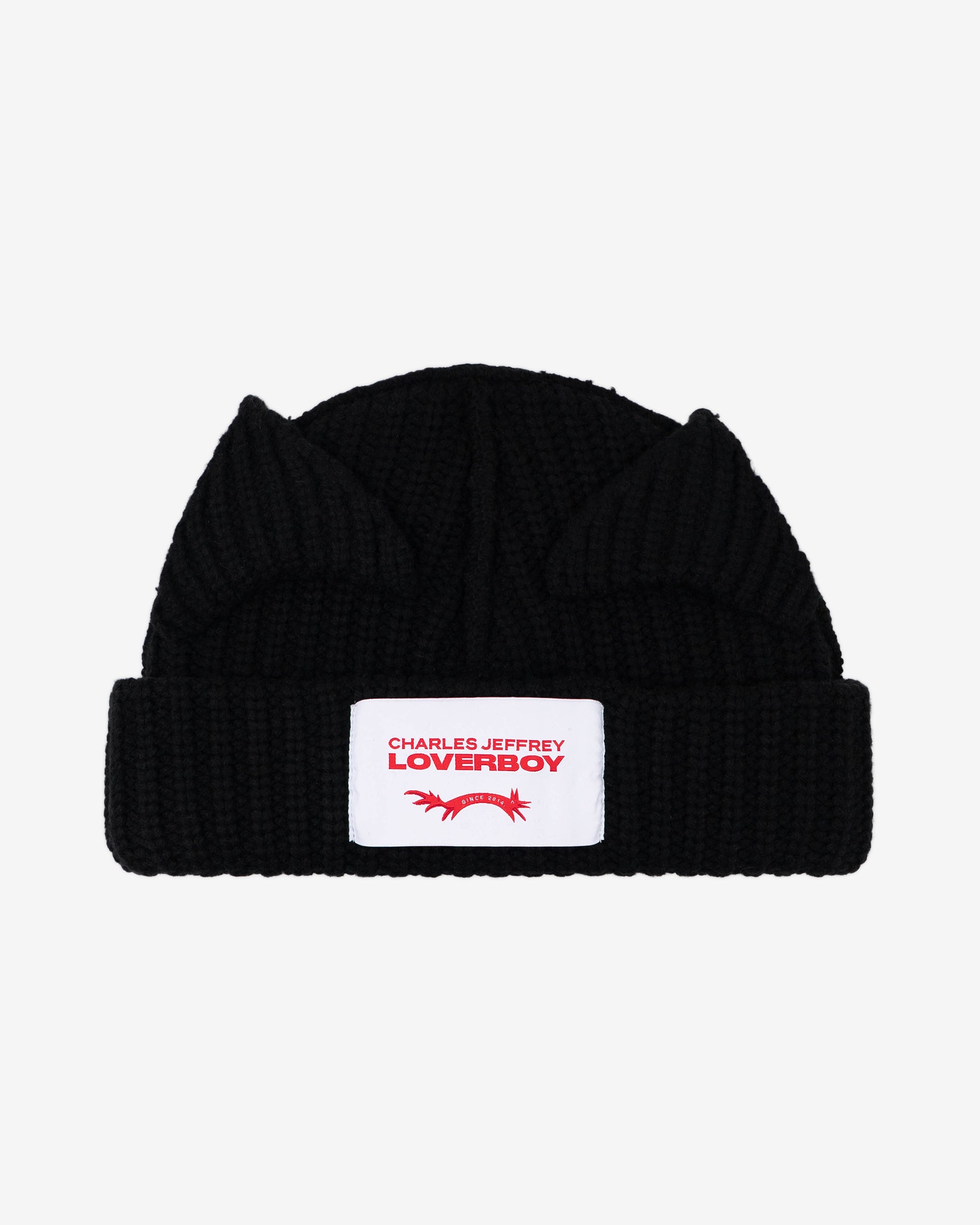classic crocheted beanie in black with Loverboy logo attached.