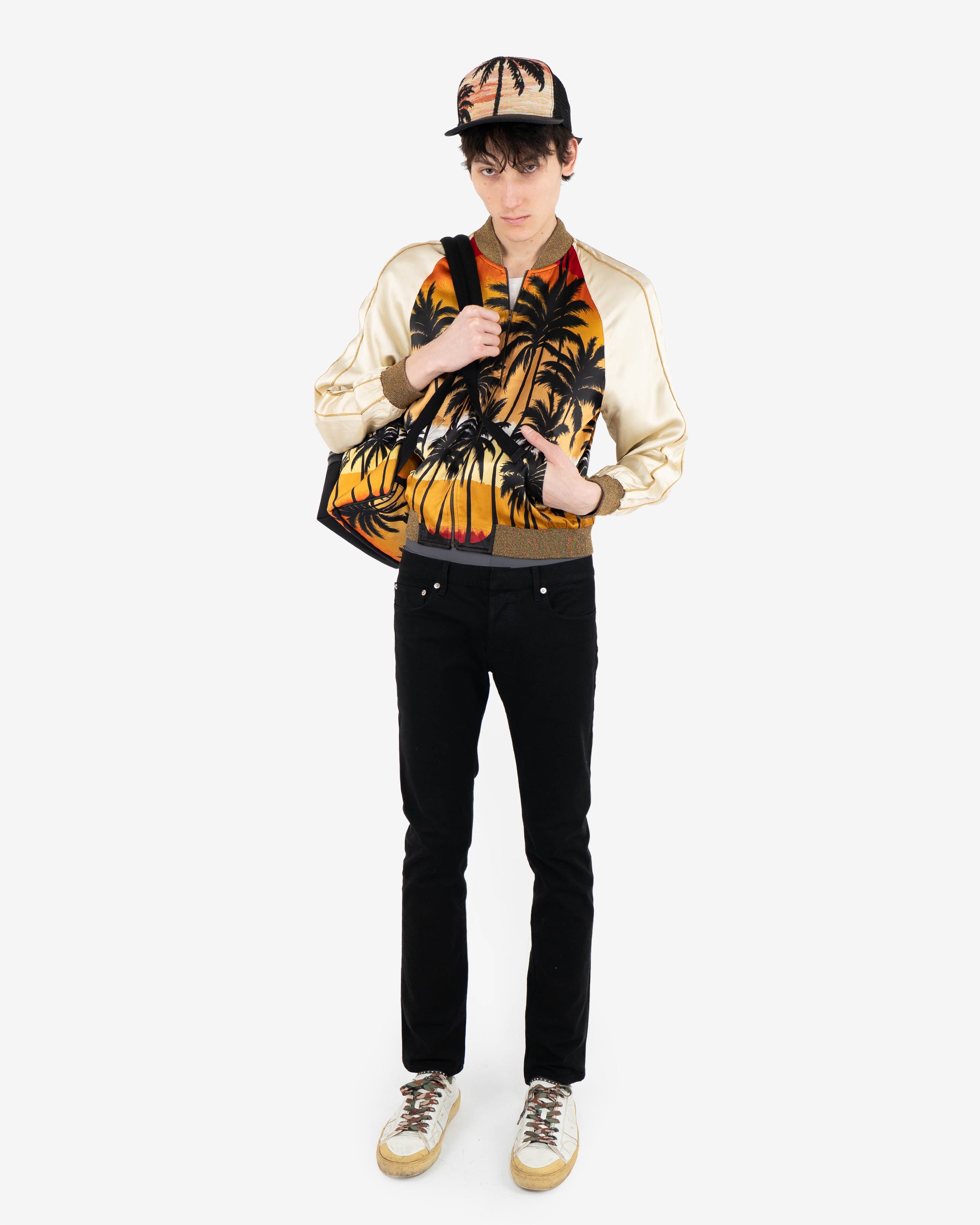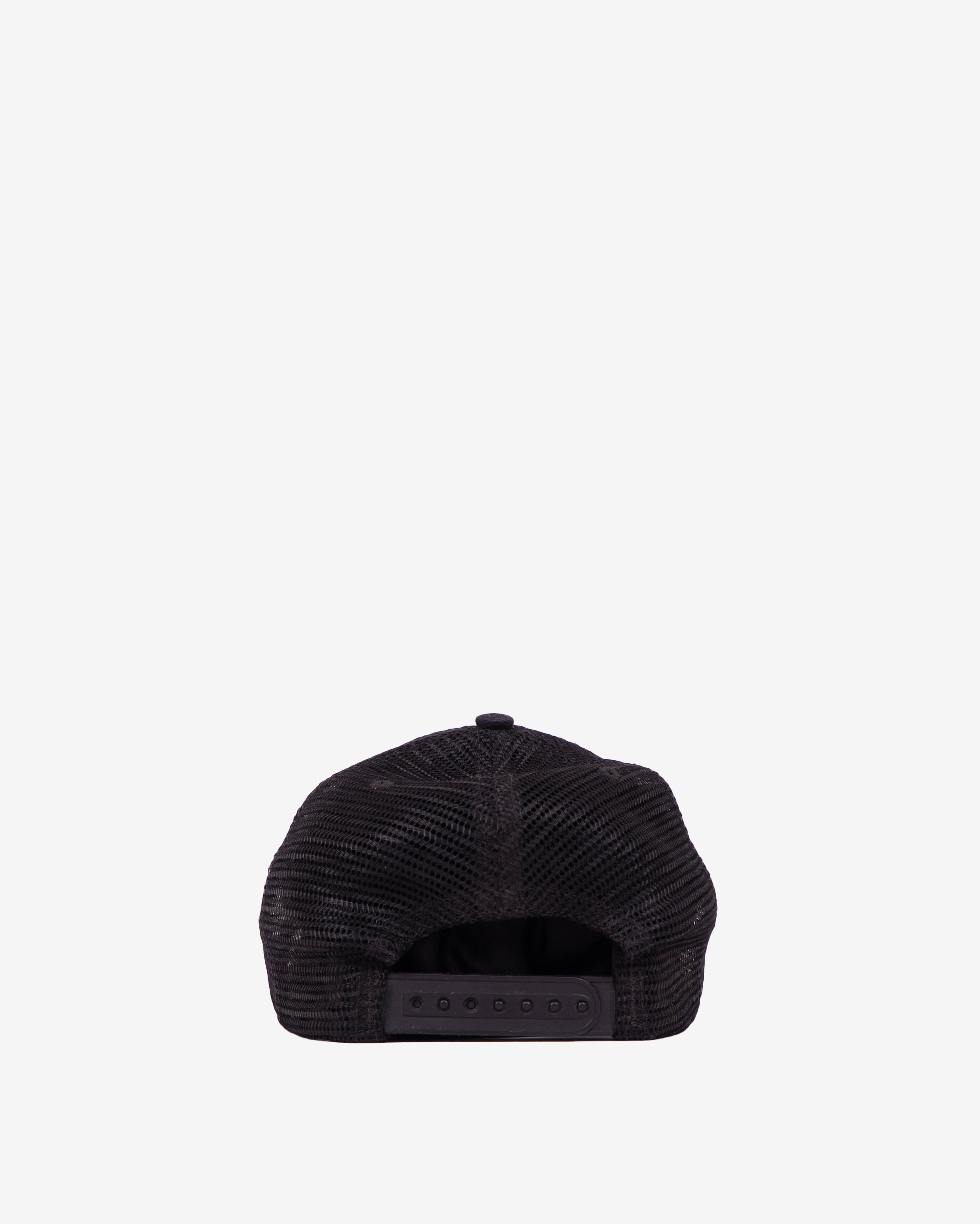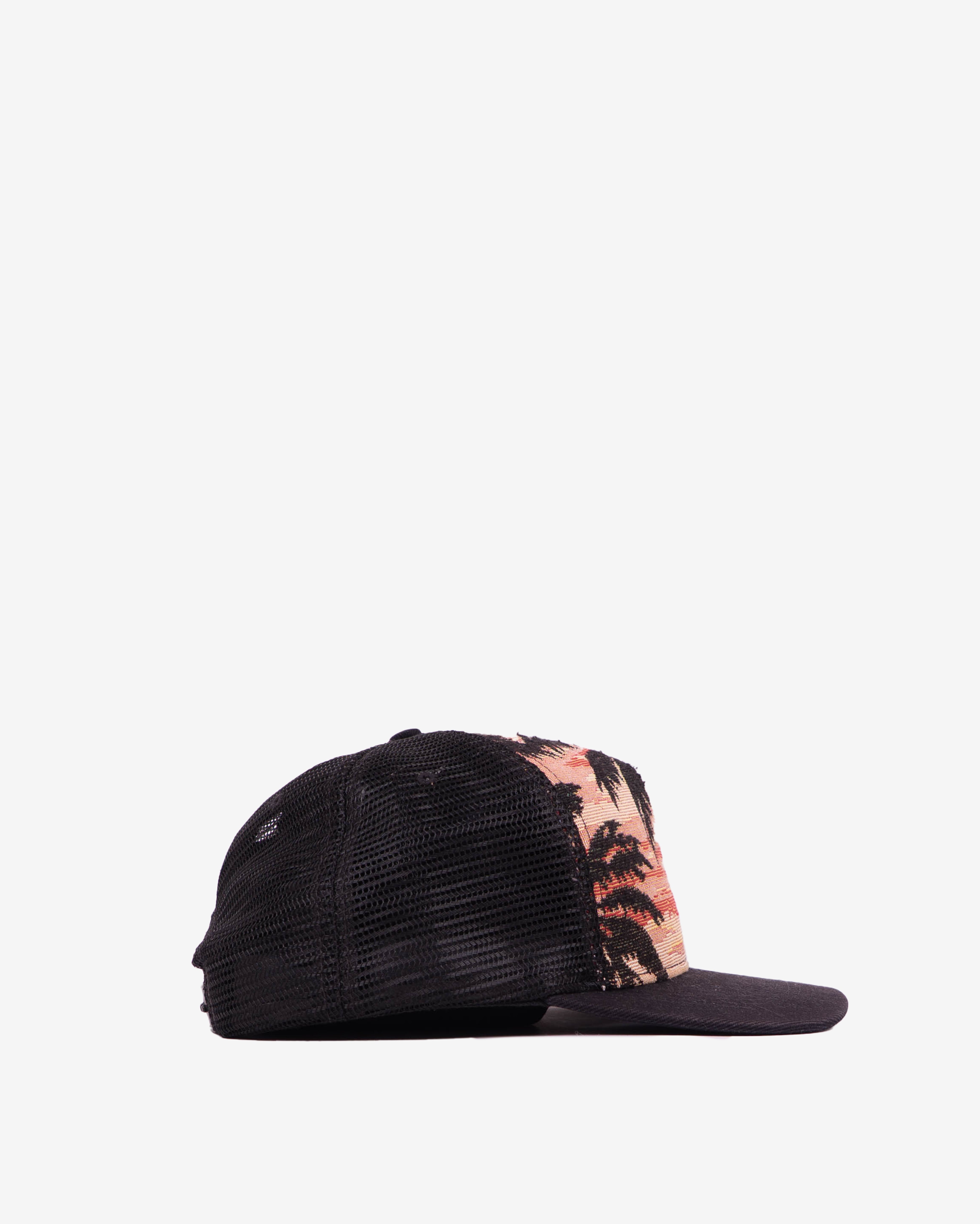 Cap featuring a mesh back panel, a flat brim, structured front with Palm Tree graphic.