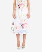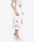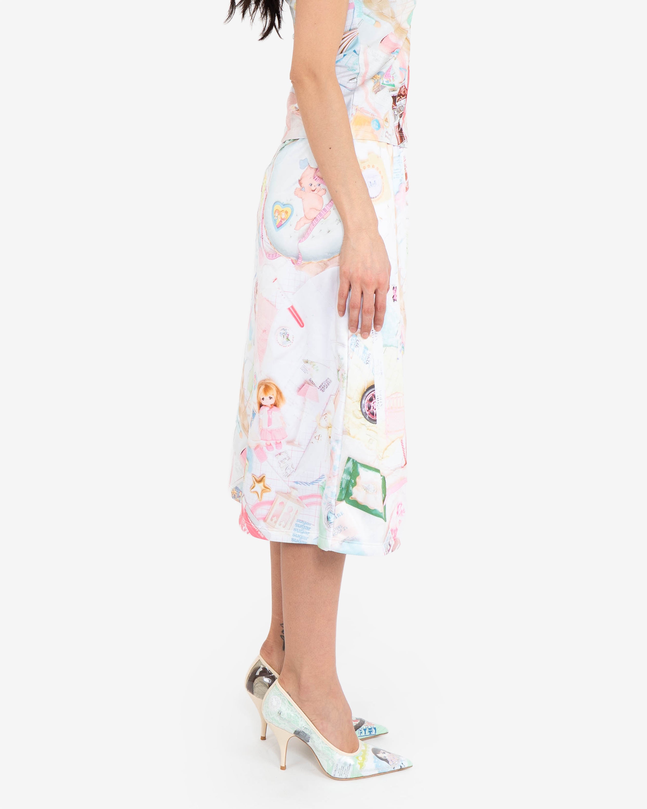 Eclectic “Treasures” print on heavy jersey skirt.