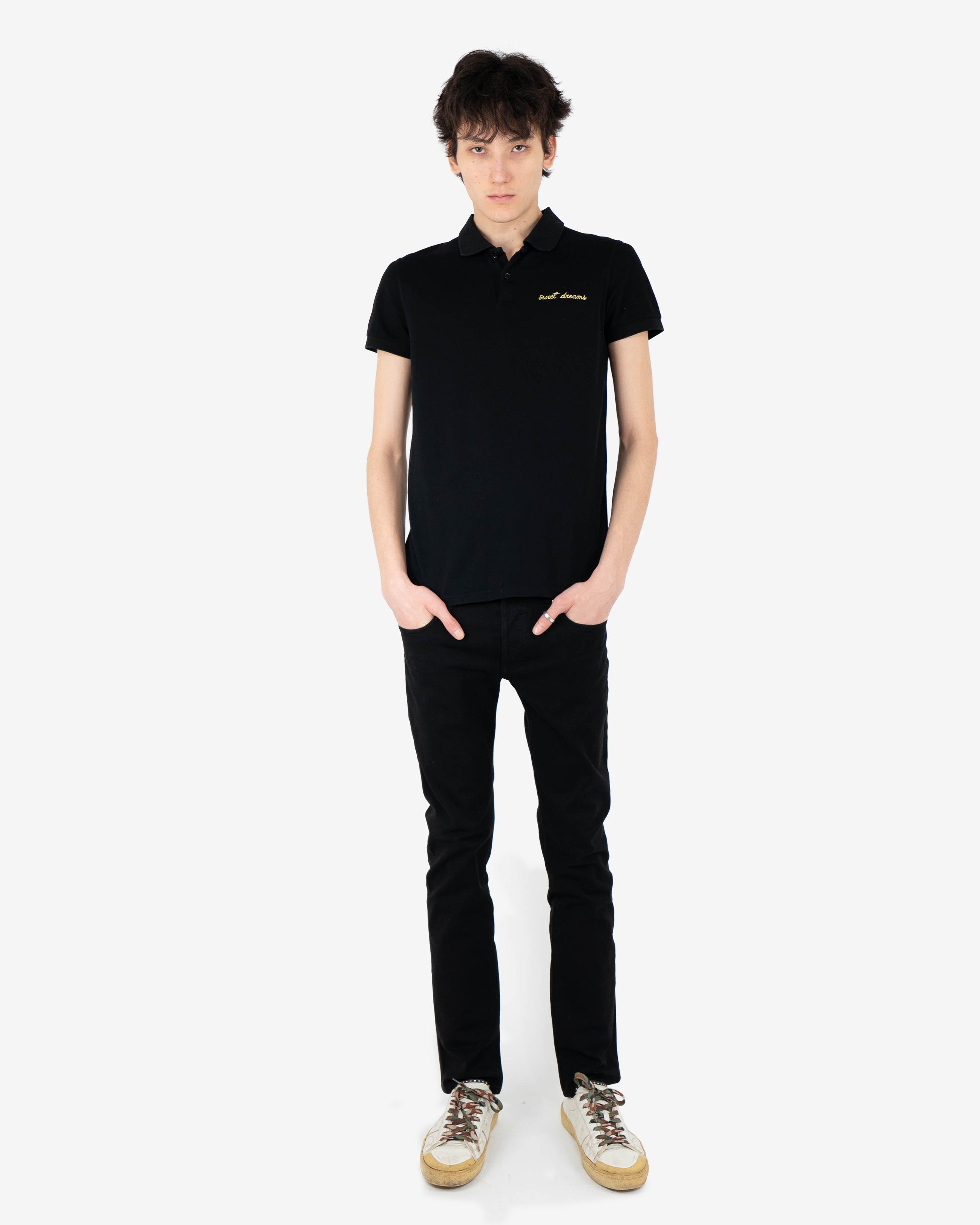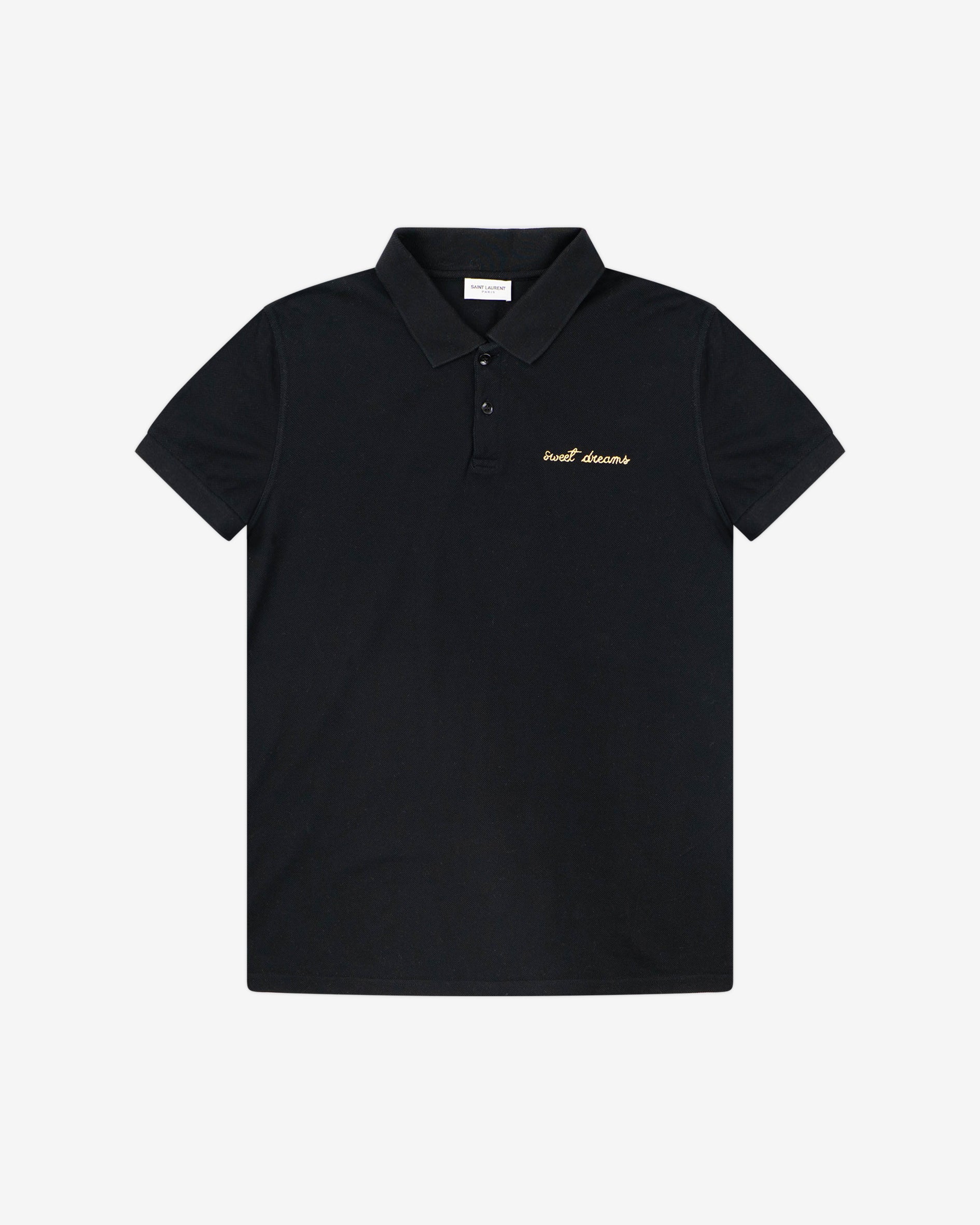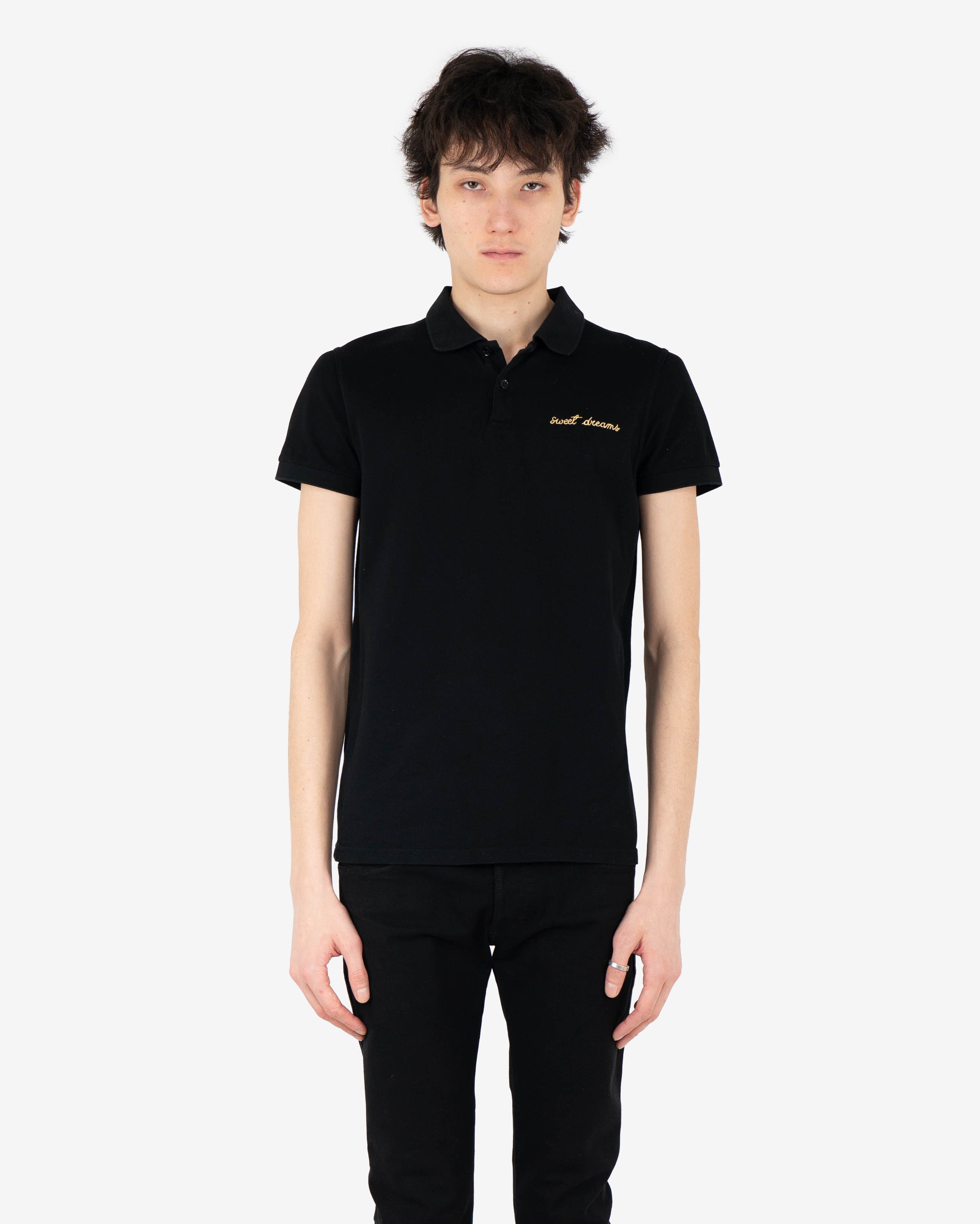Black short-sleeve polo shirt featuring a classic two-button, collar, small gold “sweet dreams” embroidery on the chest.
