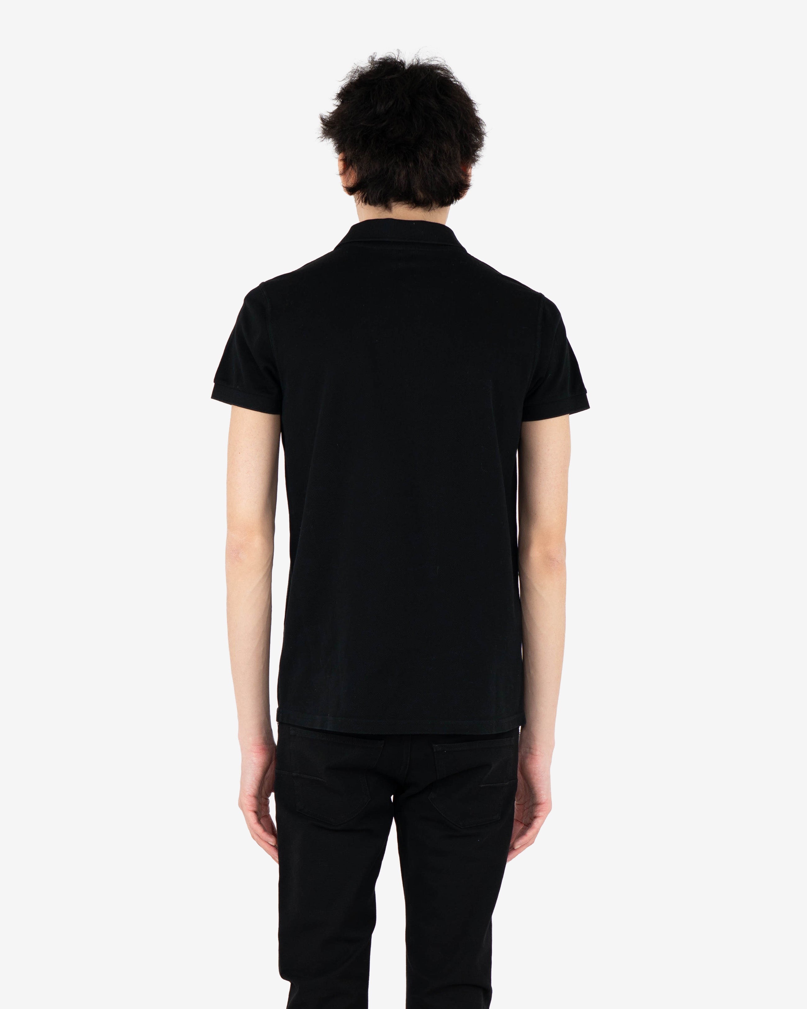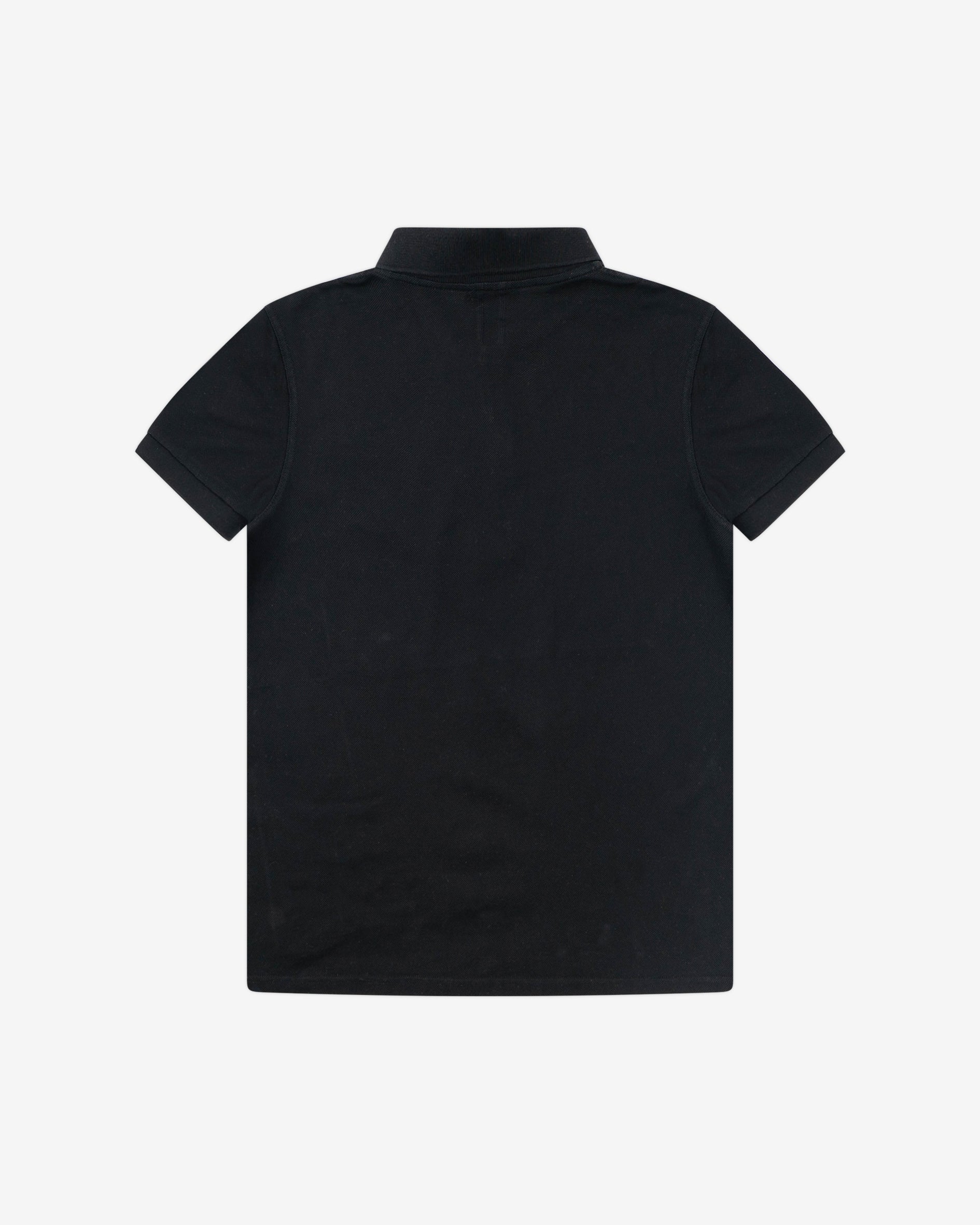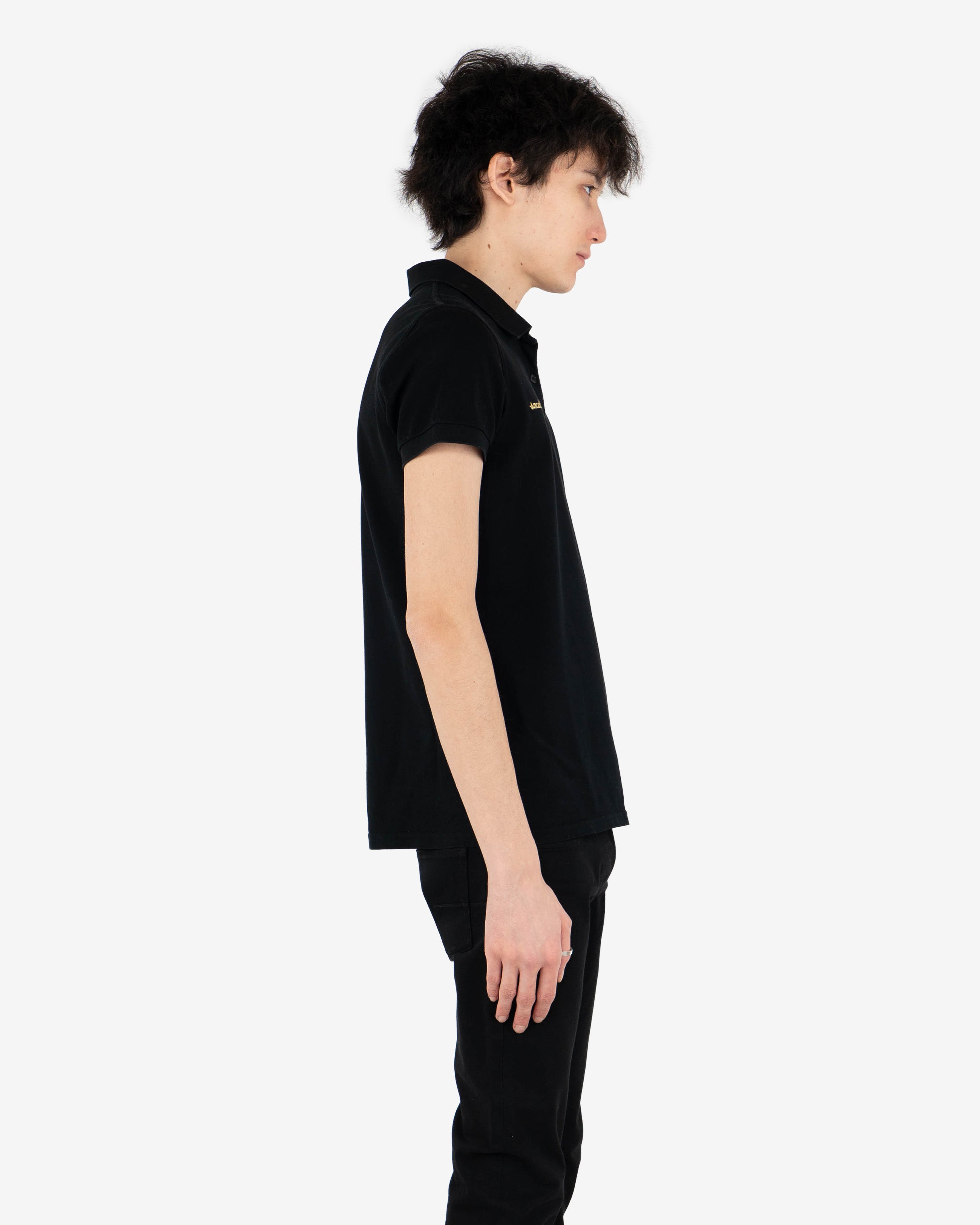 Black short-sleeve polo shirt featuring a classic two-button, collar, small gold “sweet dreams” embroidery on the chest.